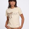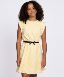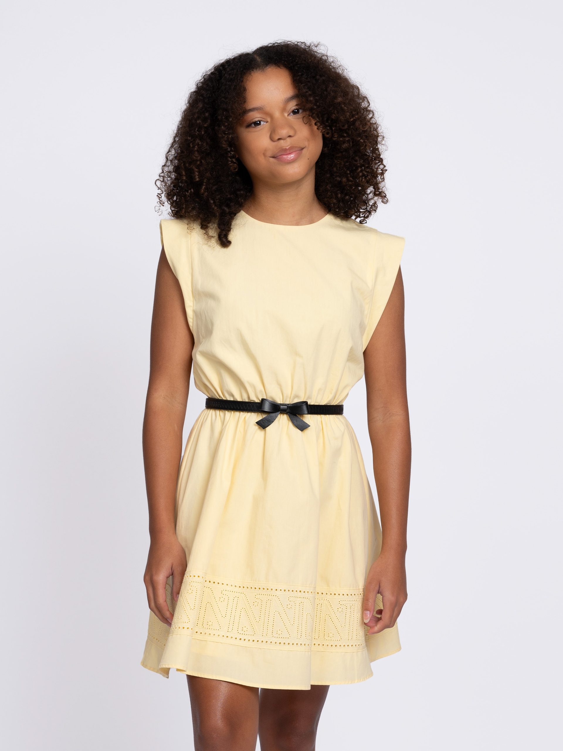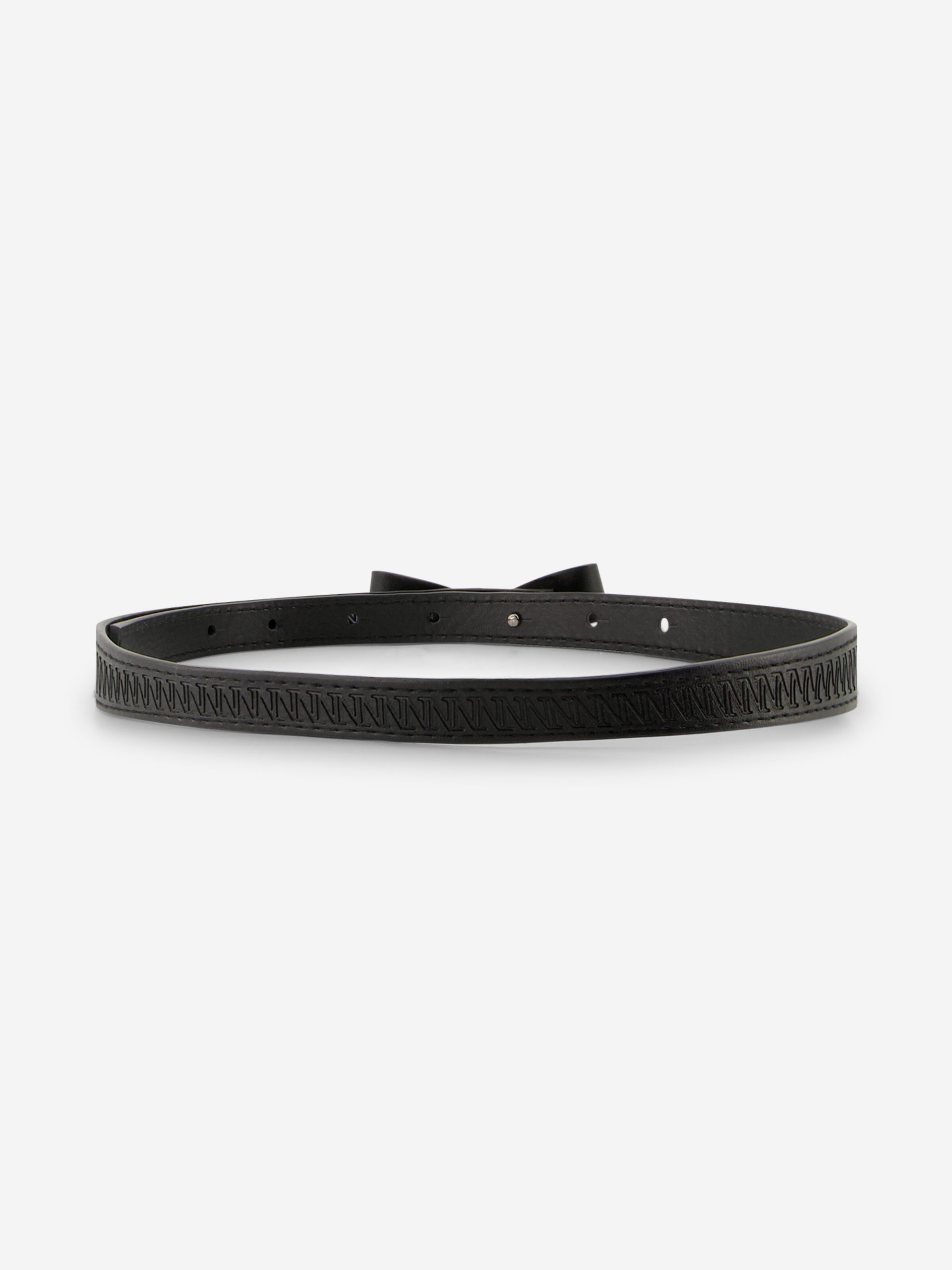 Product descriptionFaux leather belt with a logo pattern, an adjustable and thin design. The belt has a smooth, matte finish with a large bow at the front.