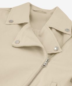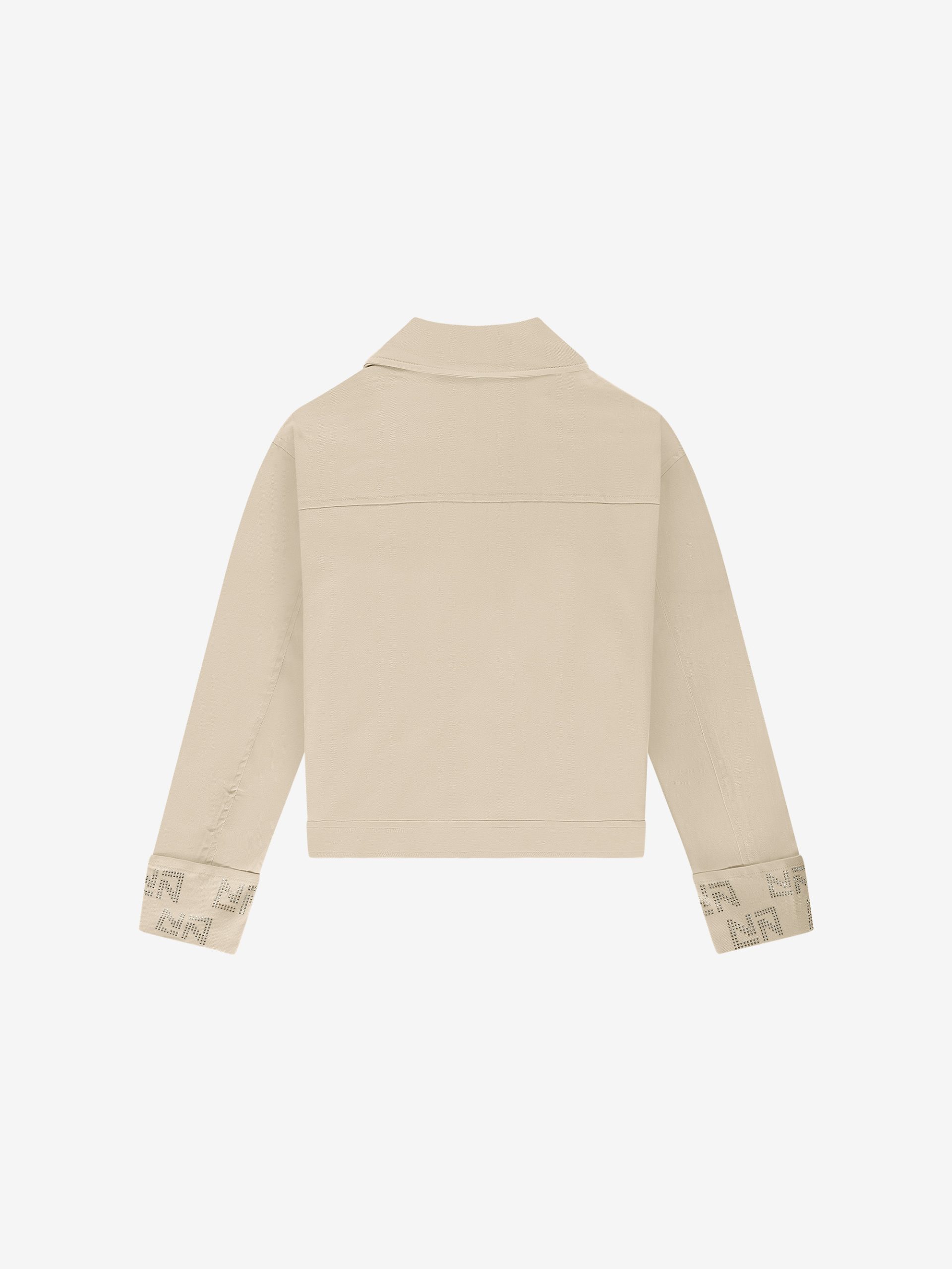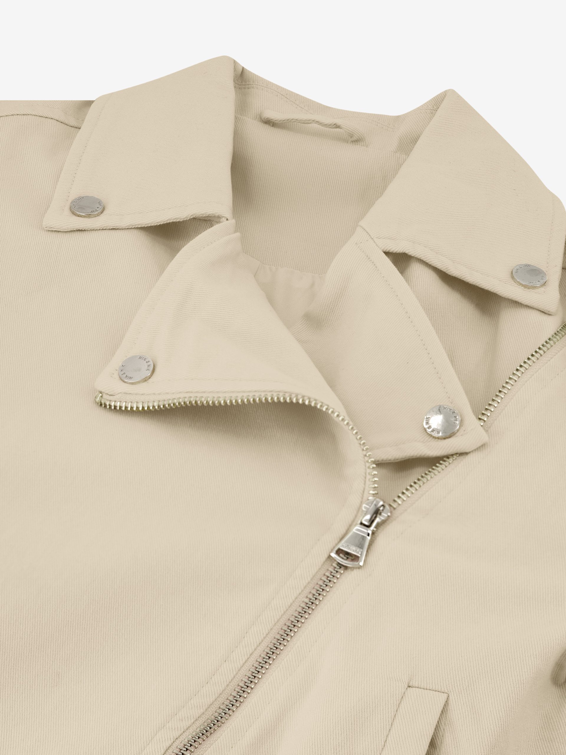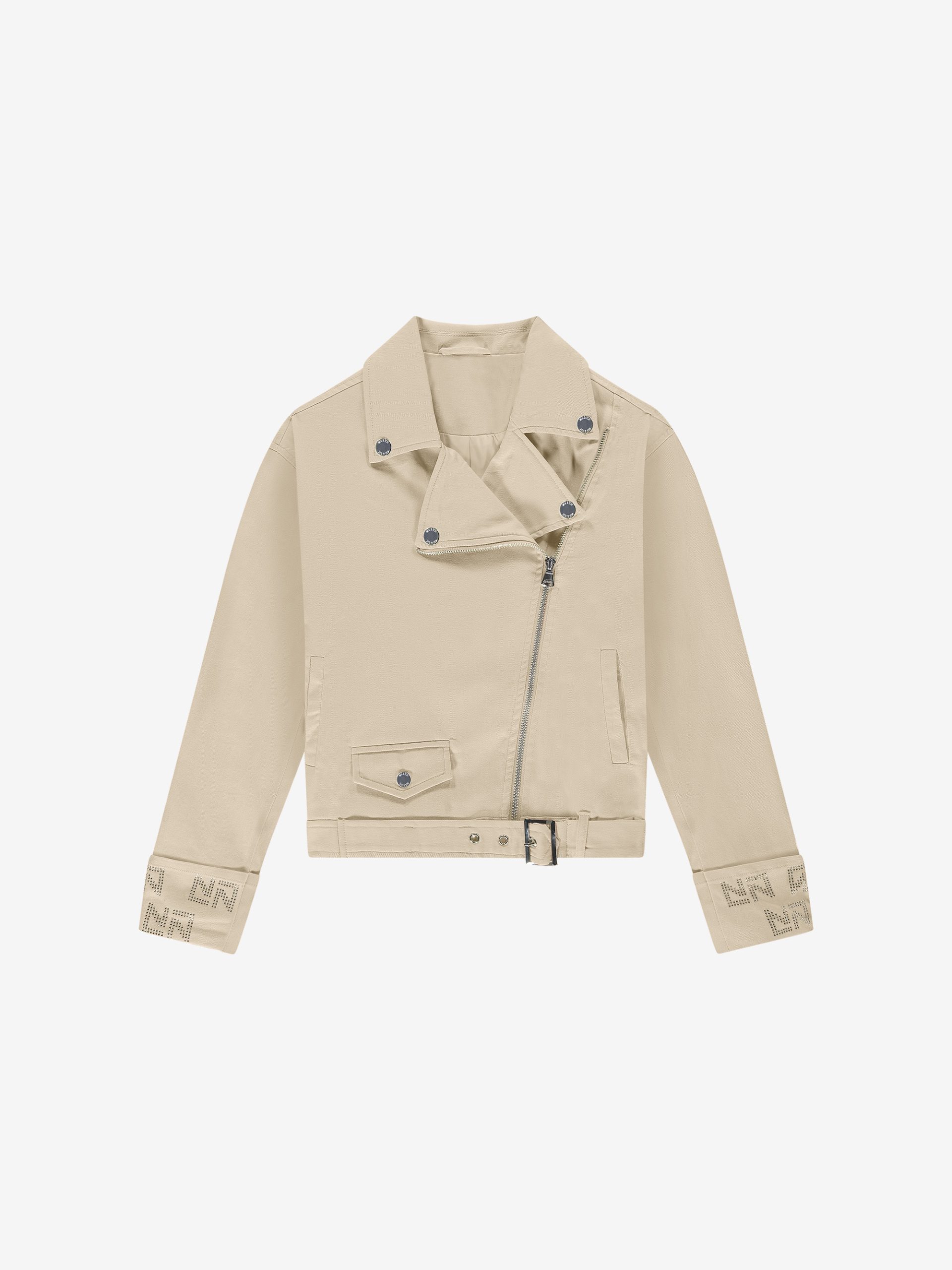 Product descriptionDenim biker jacket with a lapel collar, an angled zipper and folded cuffs with rhinestone logos. The jacket features pockets, button details and an adjustable waistband with buckle.