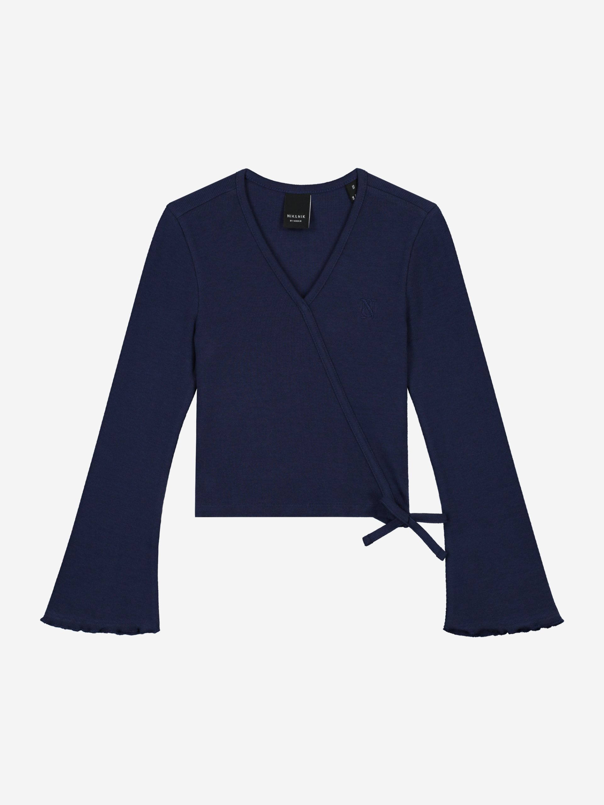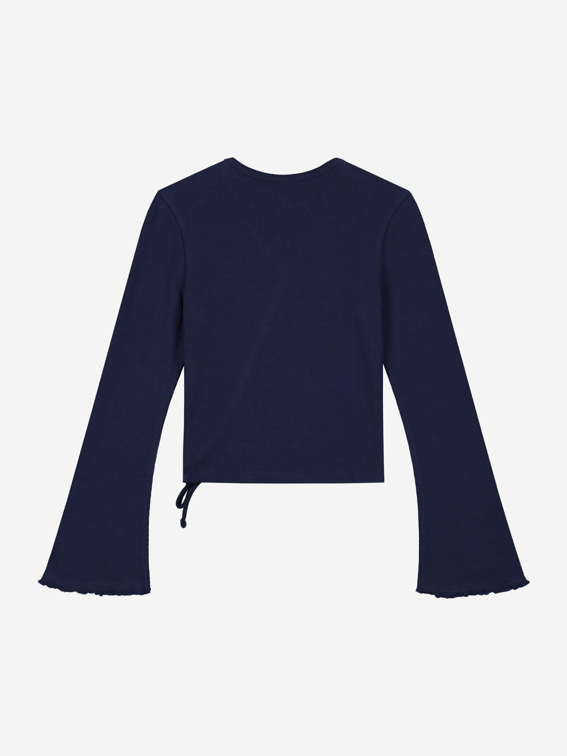 Product descriptionFitted top with flared sleeves and a small tie cord. The top has a V-neck and stretch.