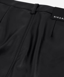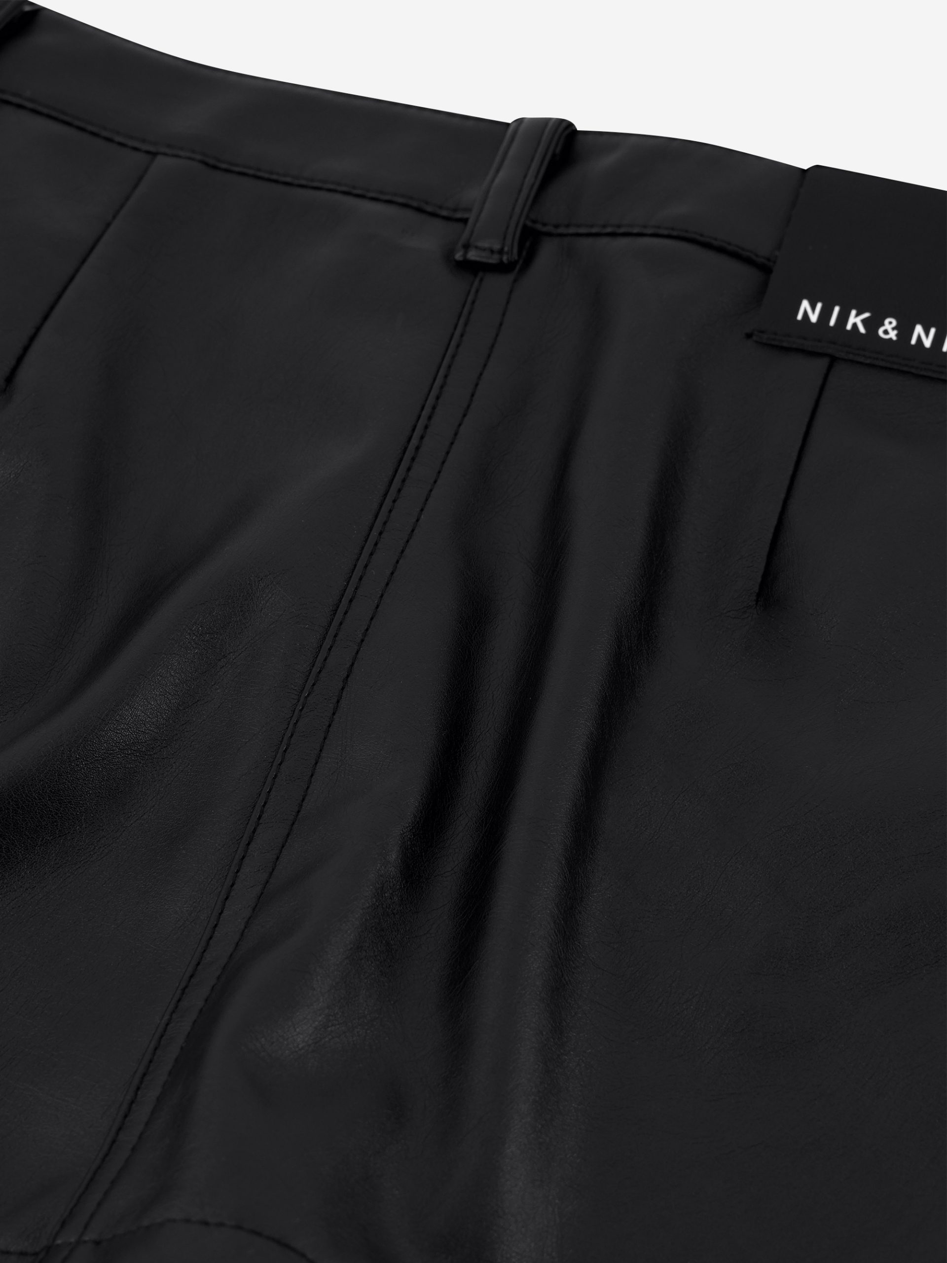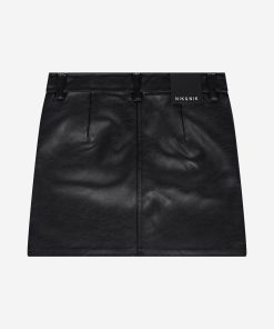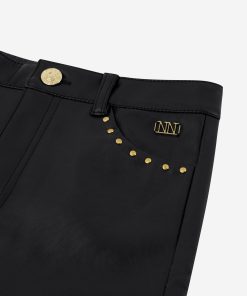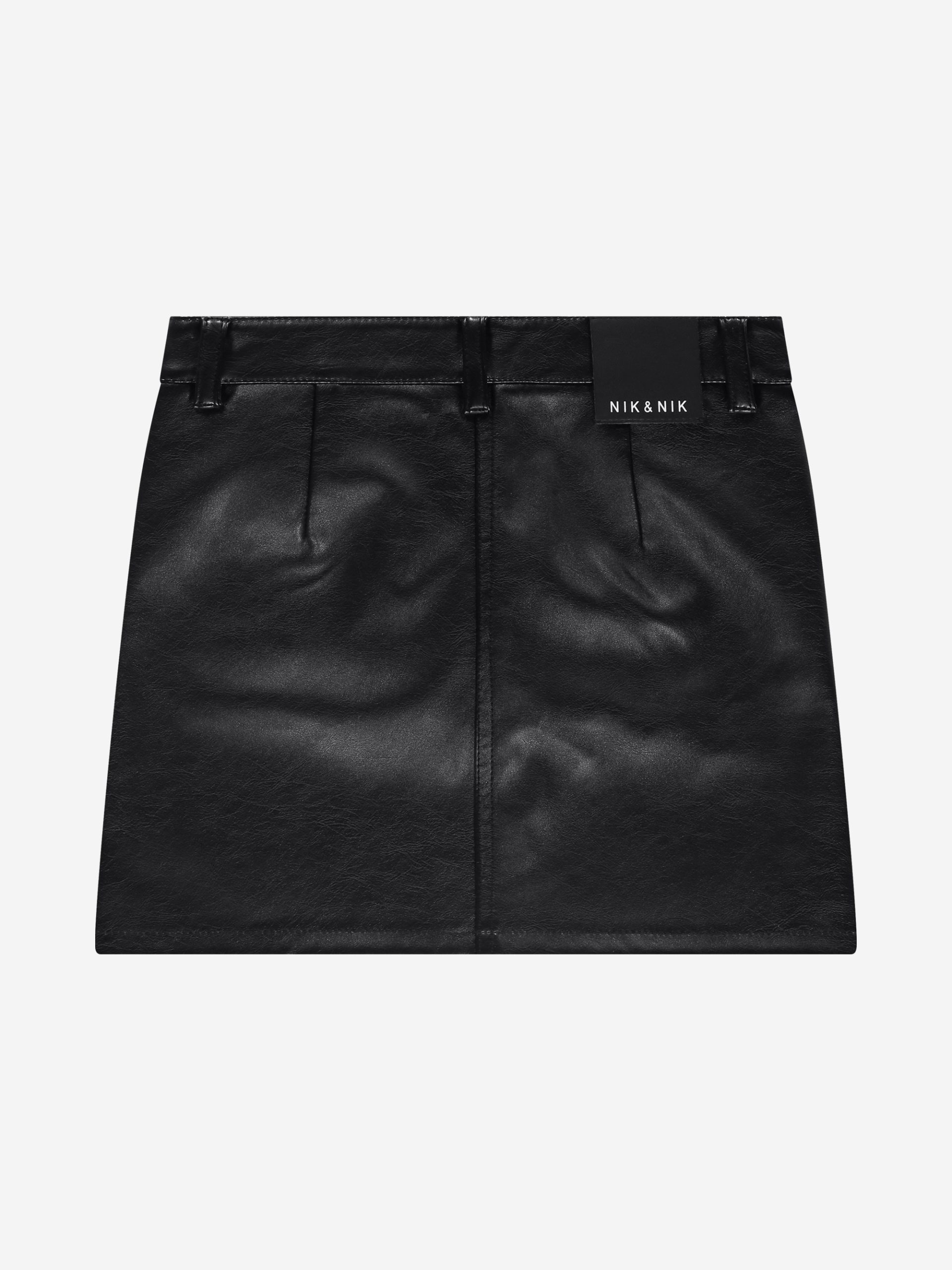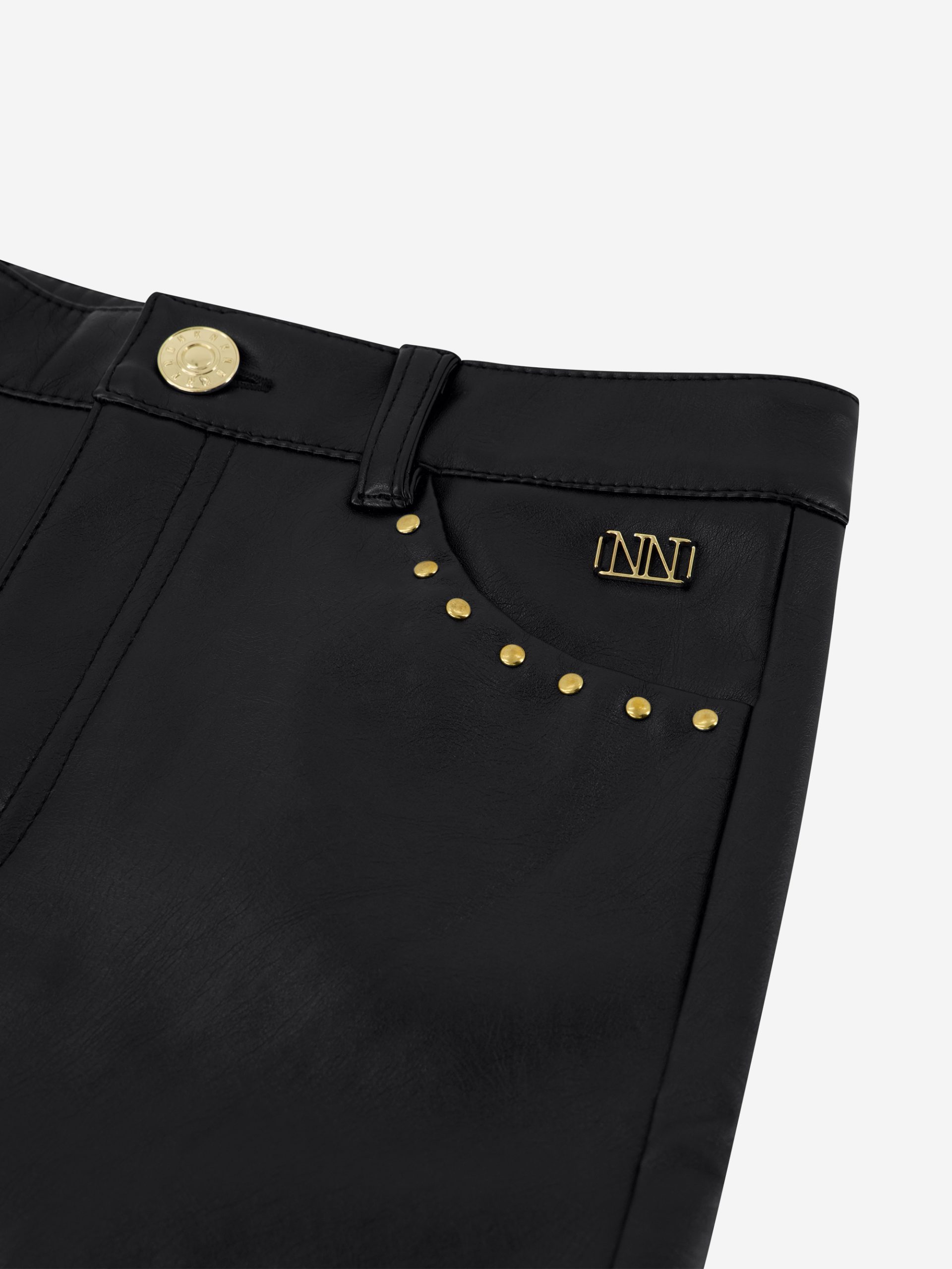 Product descriptionShort leather-look skirt with studs and pockets. The skirt has a high waist, a zipper and button closure and a tight fit.