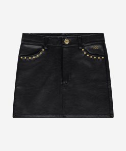 Product descriptionShort leather-look skirt with studs and pockets. The skirt has a high waist, a zipper and button closure and a tight fit.