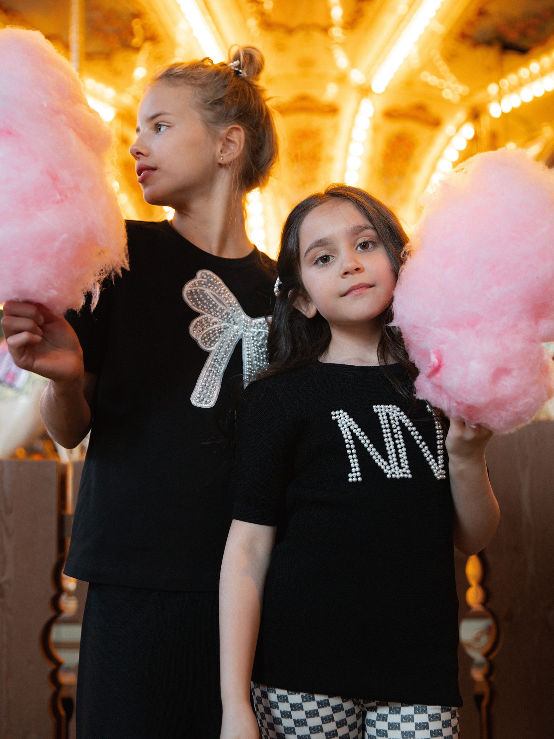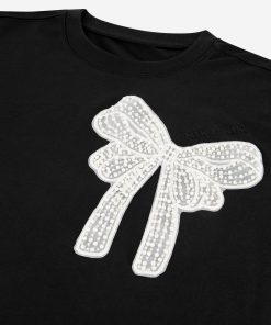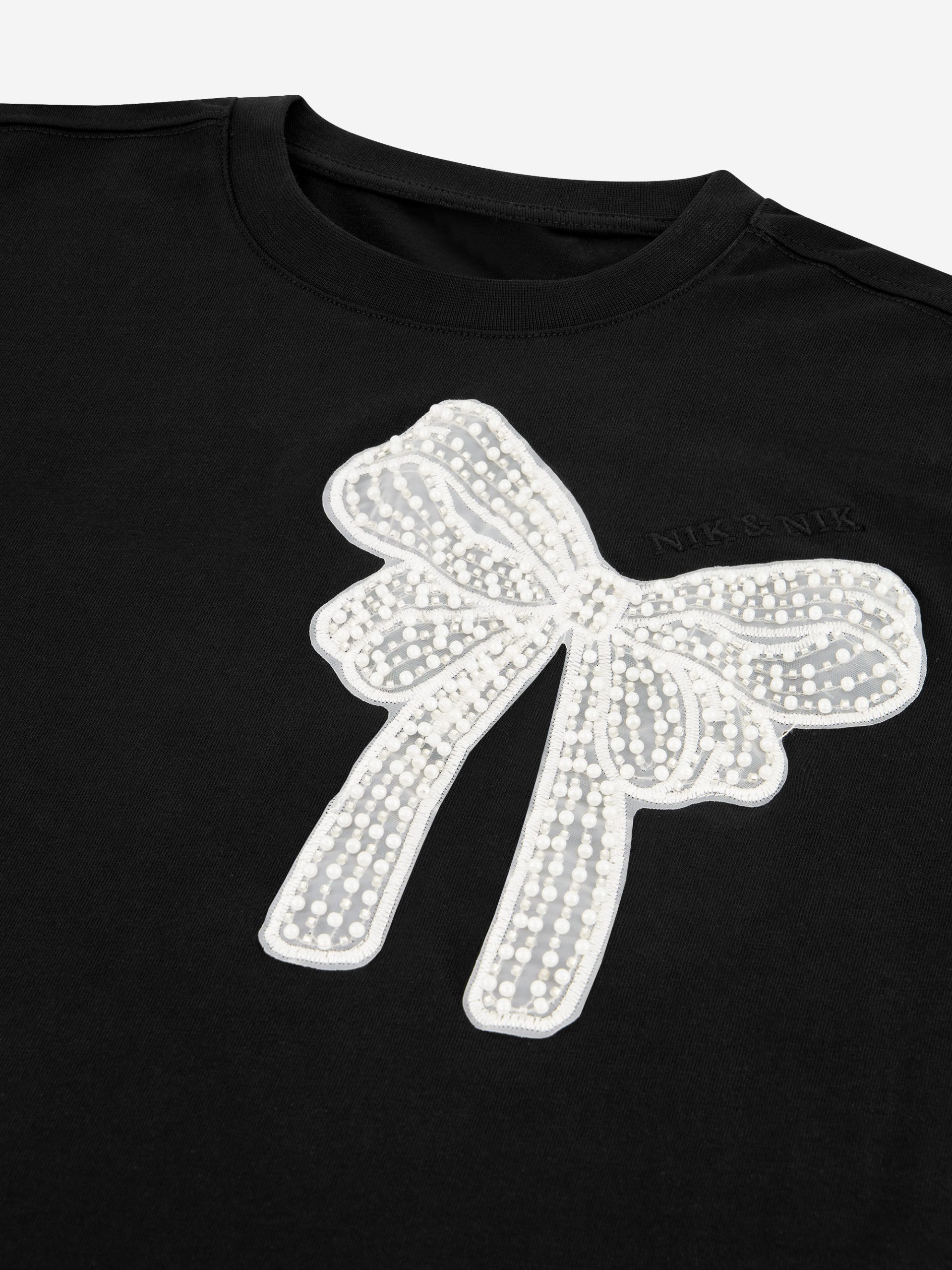 Product descriptionBasic T-shirt with a round neck, a loose fit and a playful bow detail decorated with pearls.