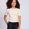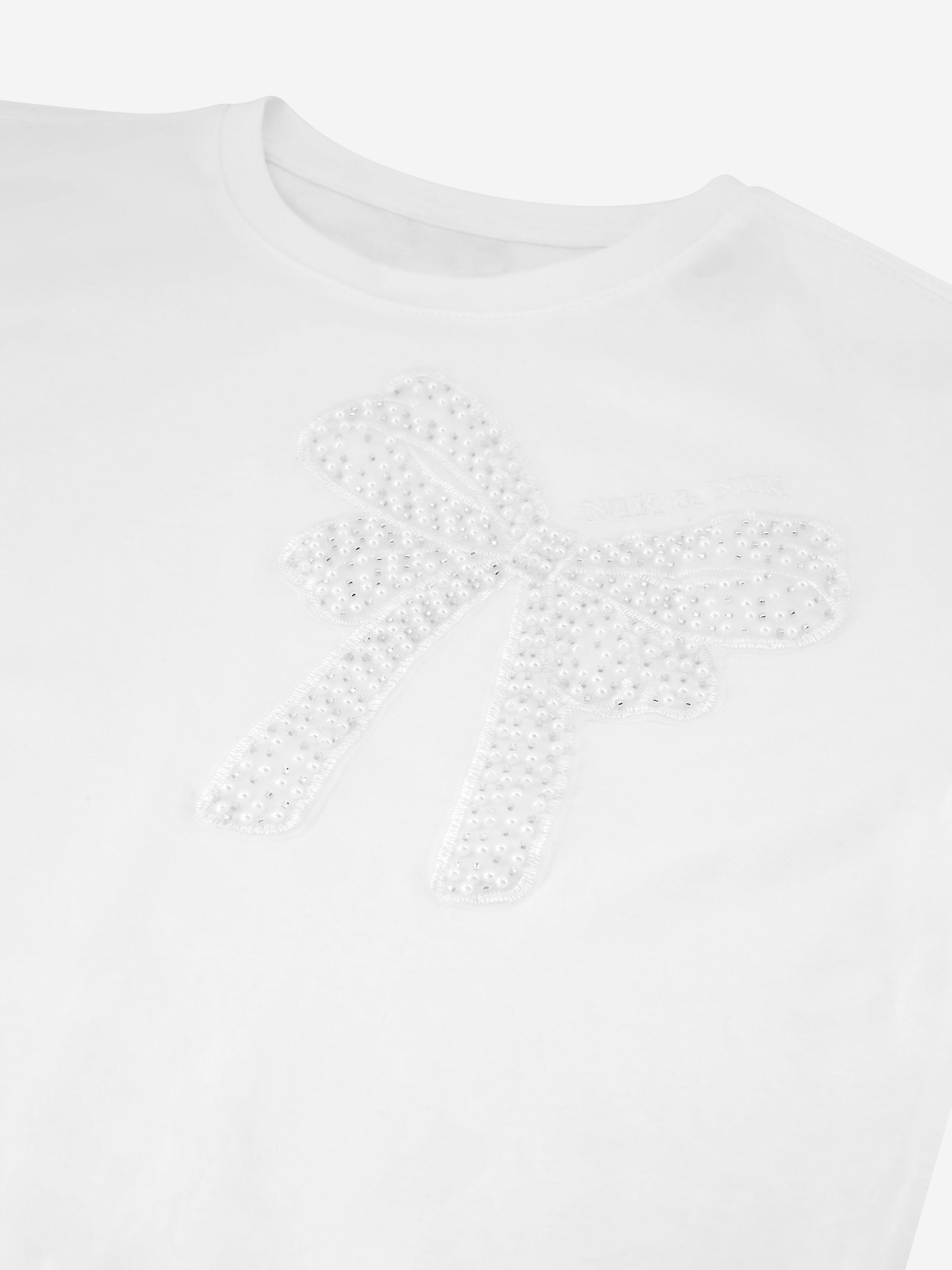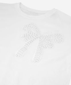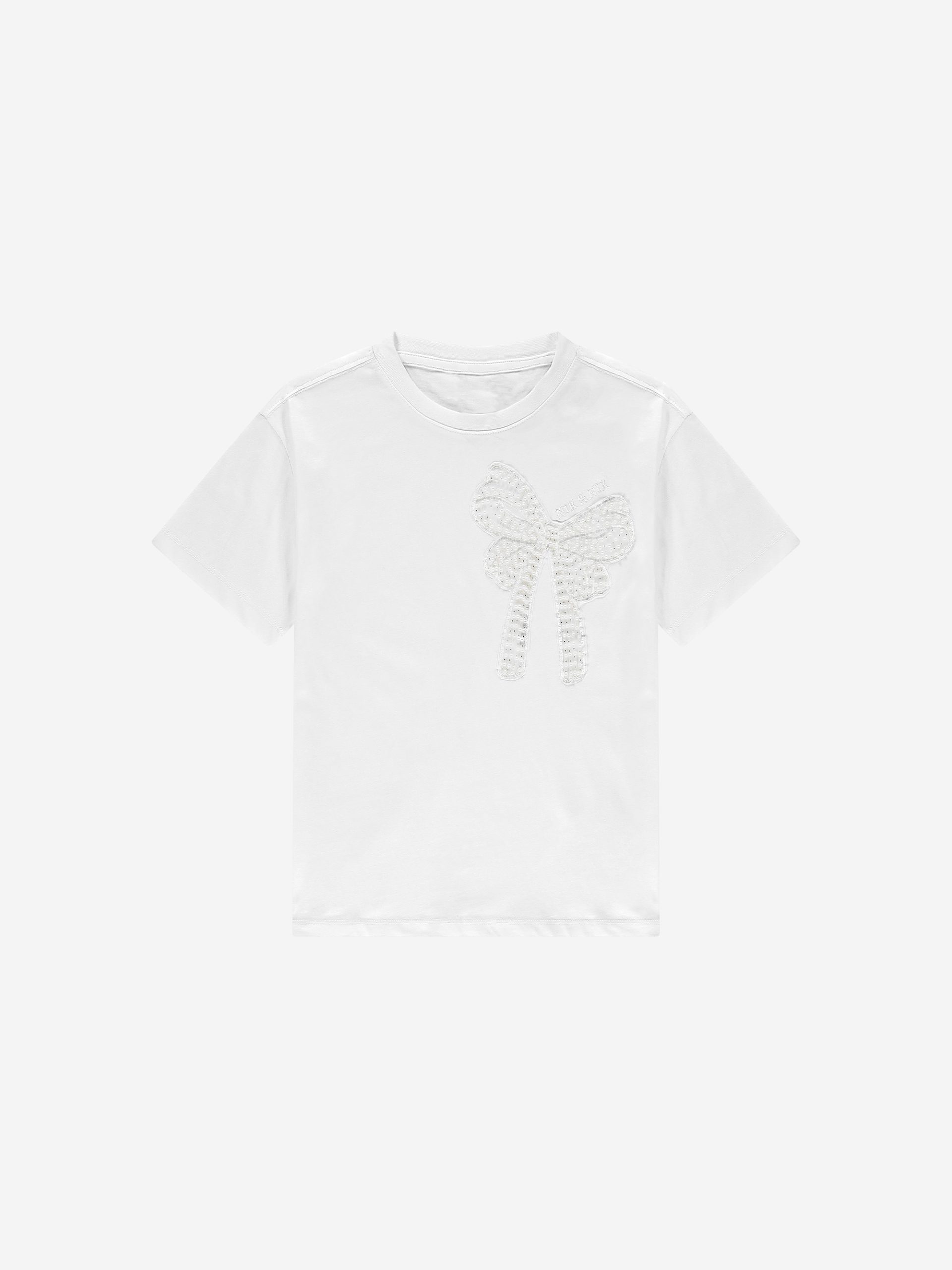 Product descriptionBasic T-shirt with a round neck, a loose fit and a playful bow detail decorated with pearls.
