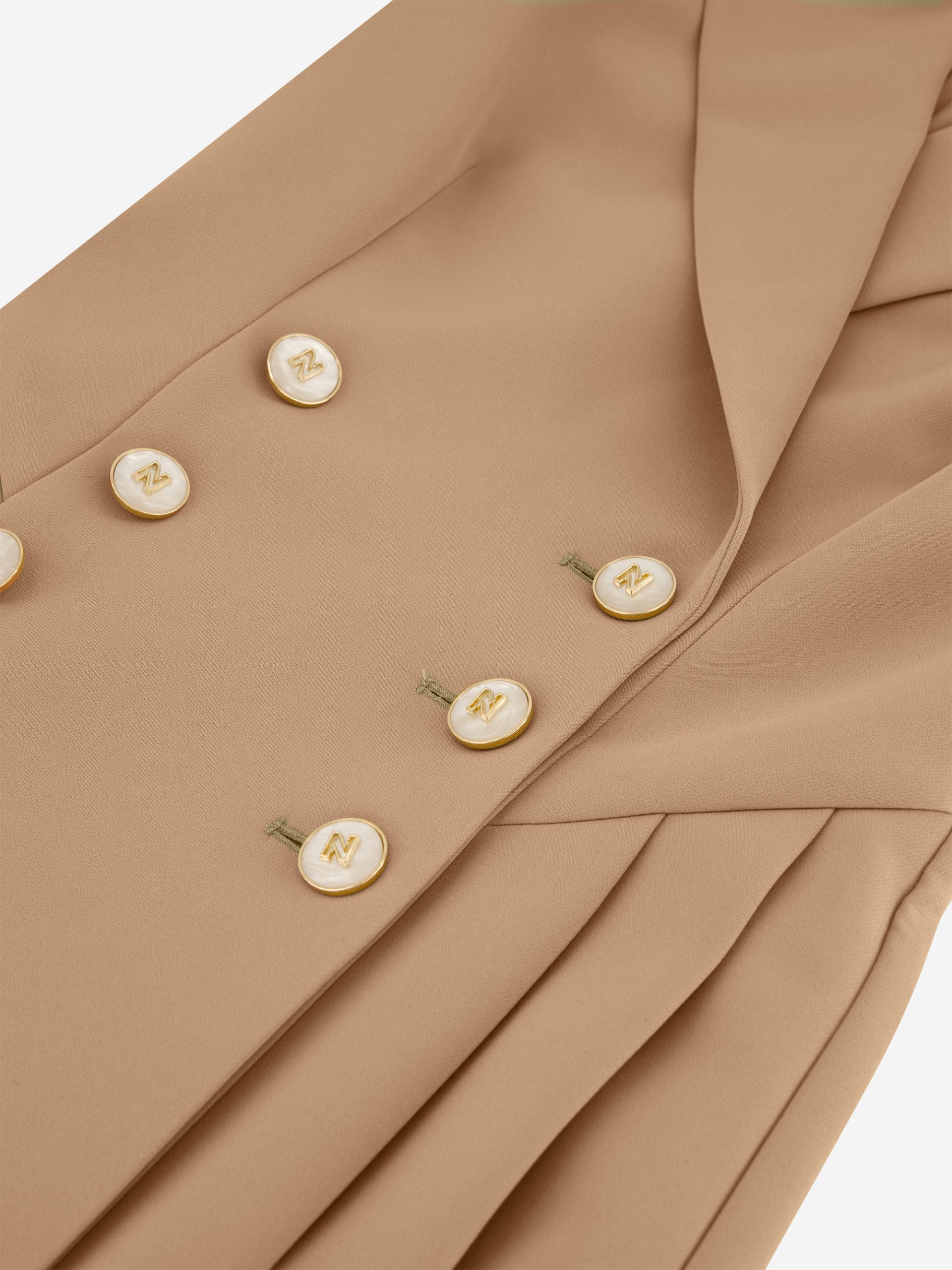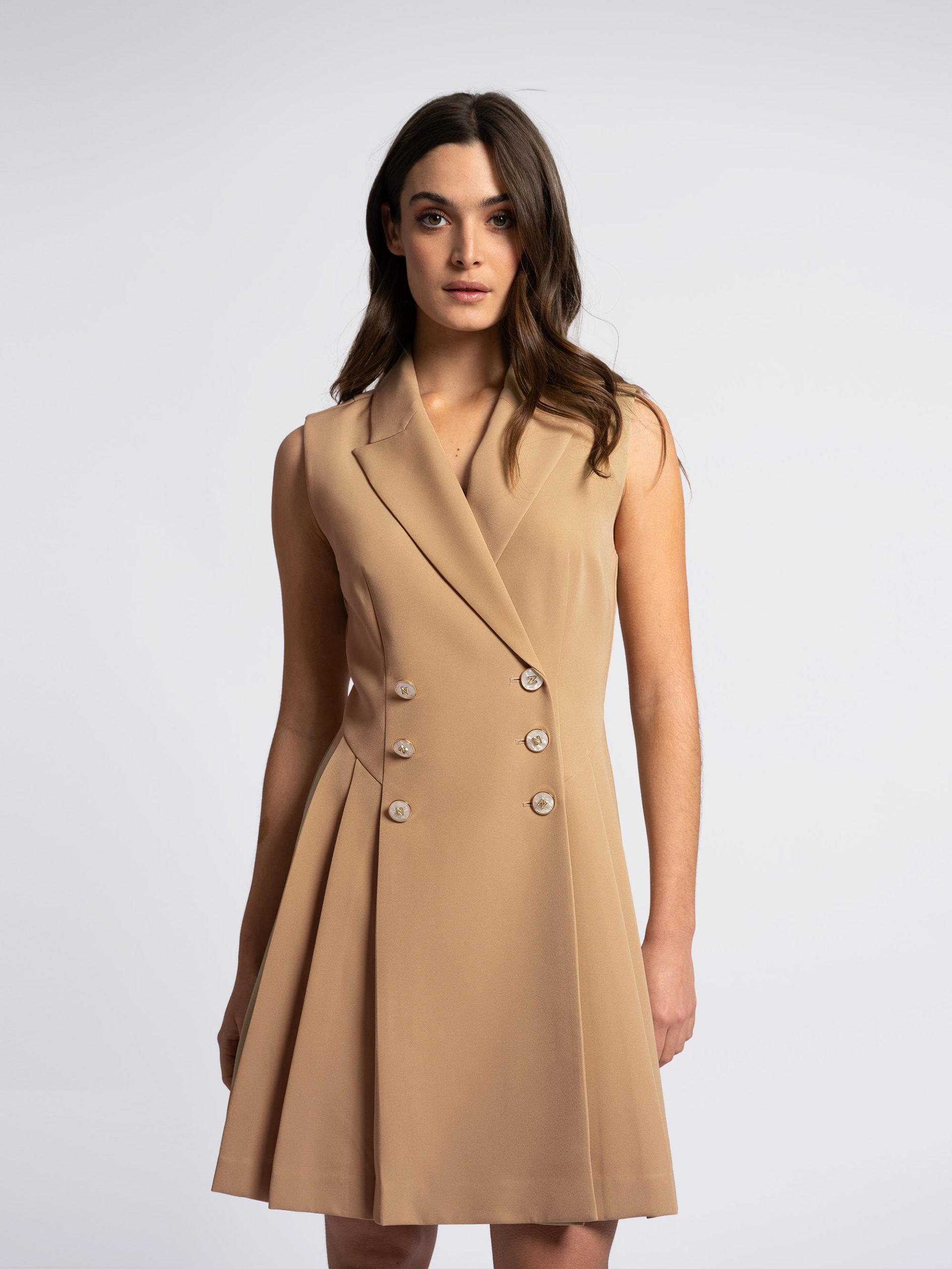 Product descriptionSleeveless blazer dress with a double-breasted closure, mother-of-pearl buttons, and a classic collar. The skirt is pleated and has an A-line fit.