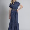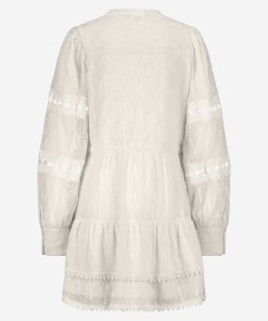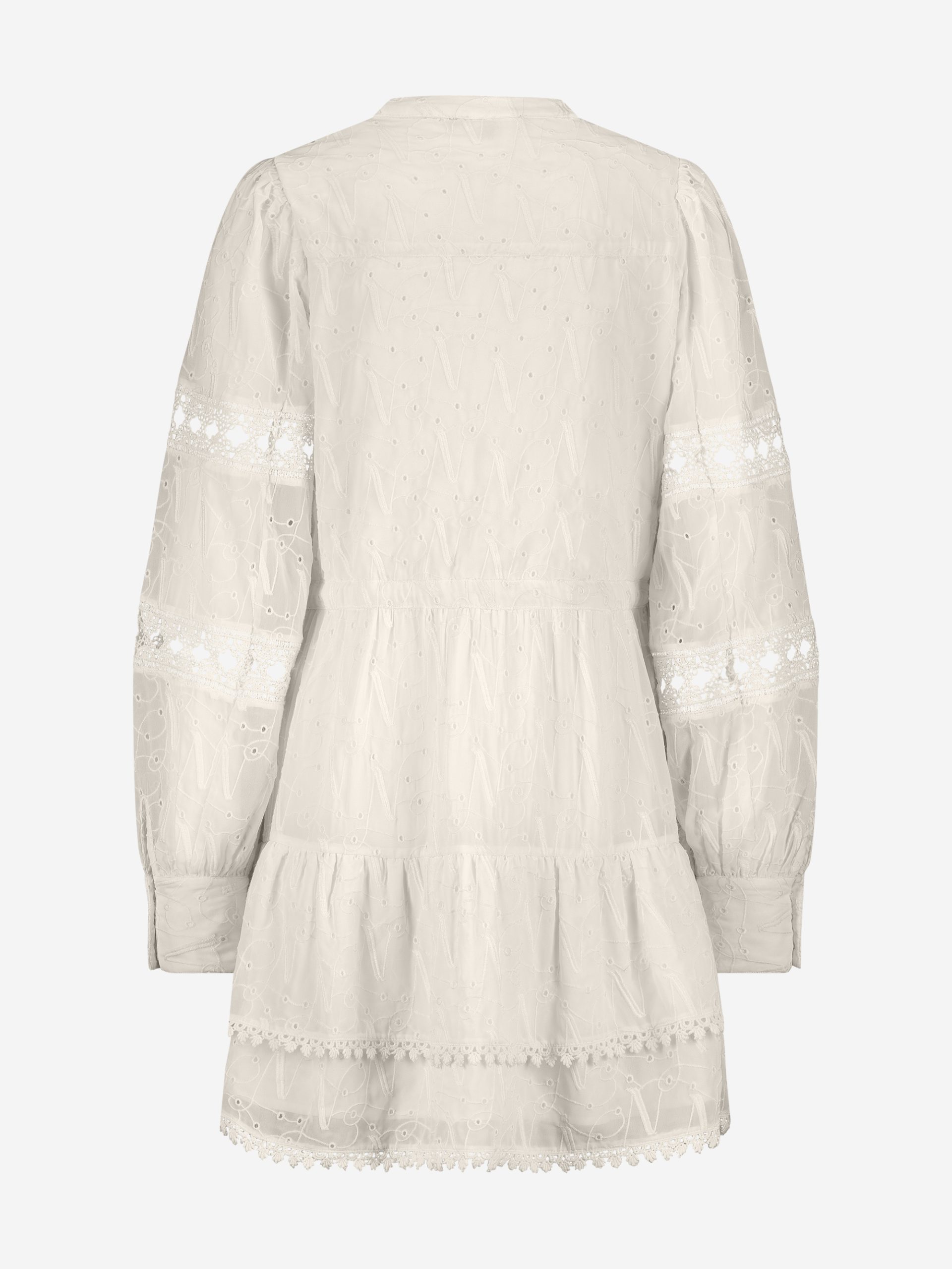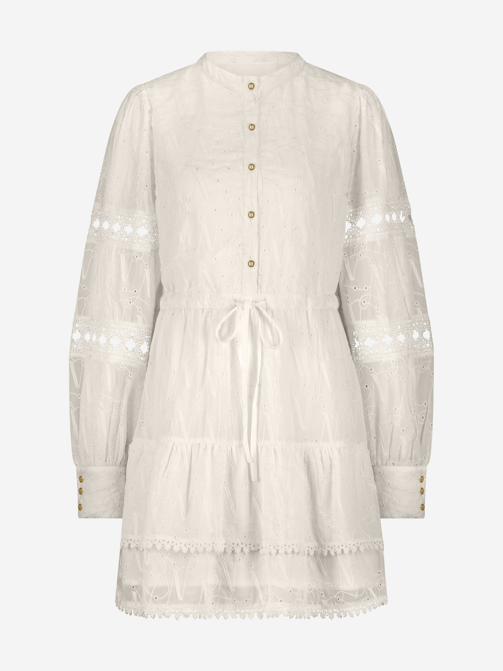 Product descriptionA-line dress in broderie anglaise with cut-out details on the sleeves and a drawstring at the waist. The dress has a high round neck and several layers.