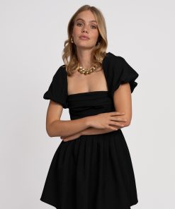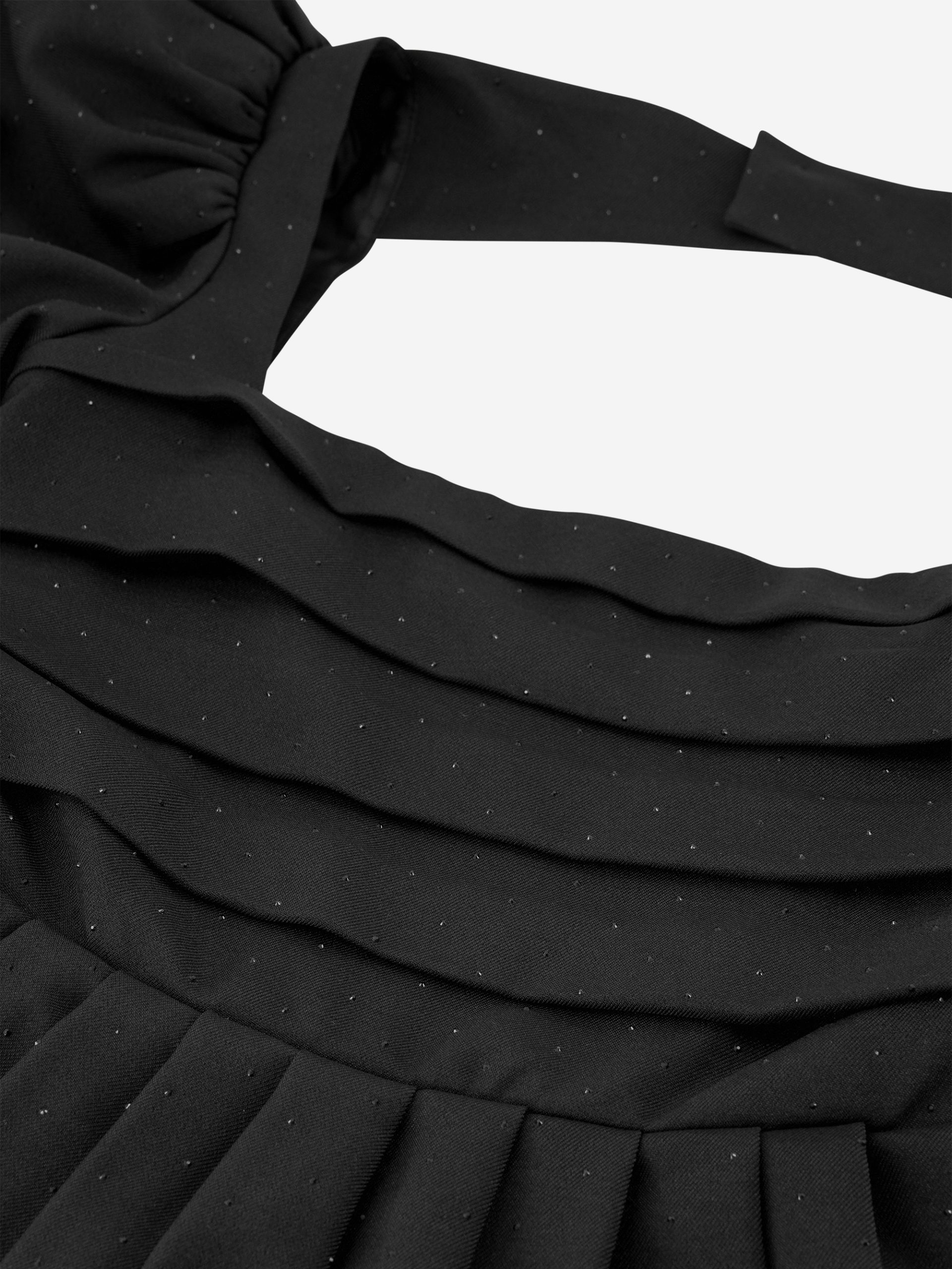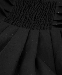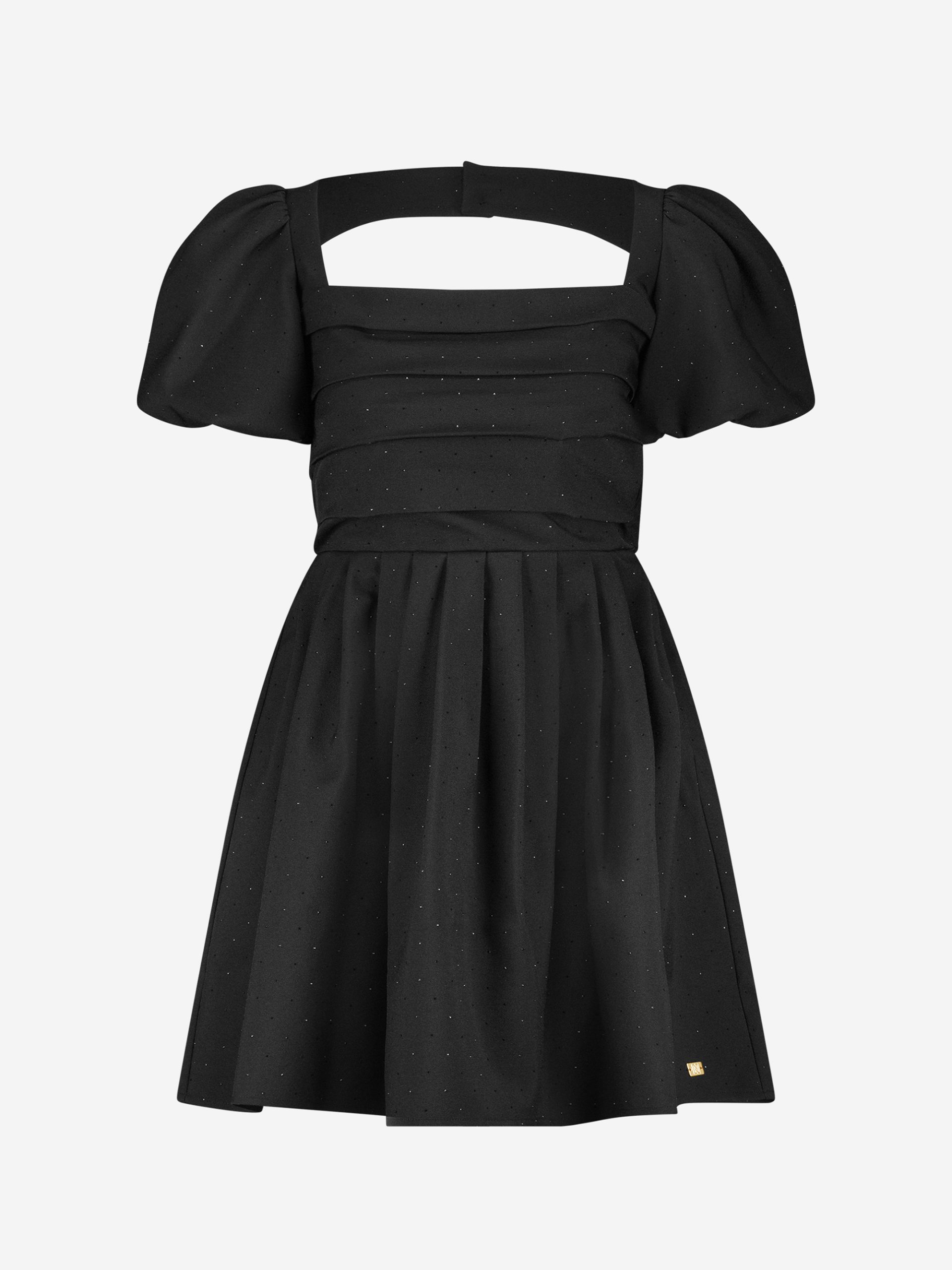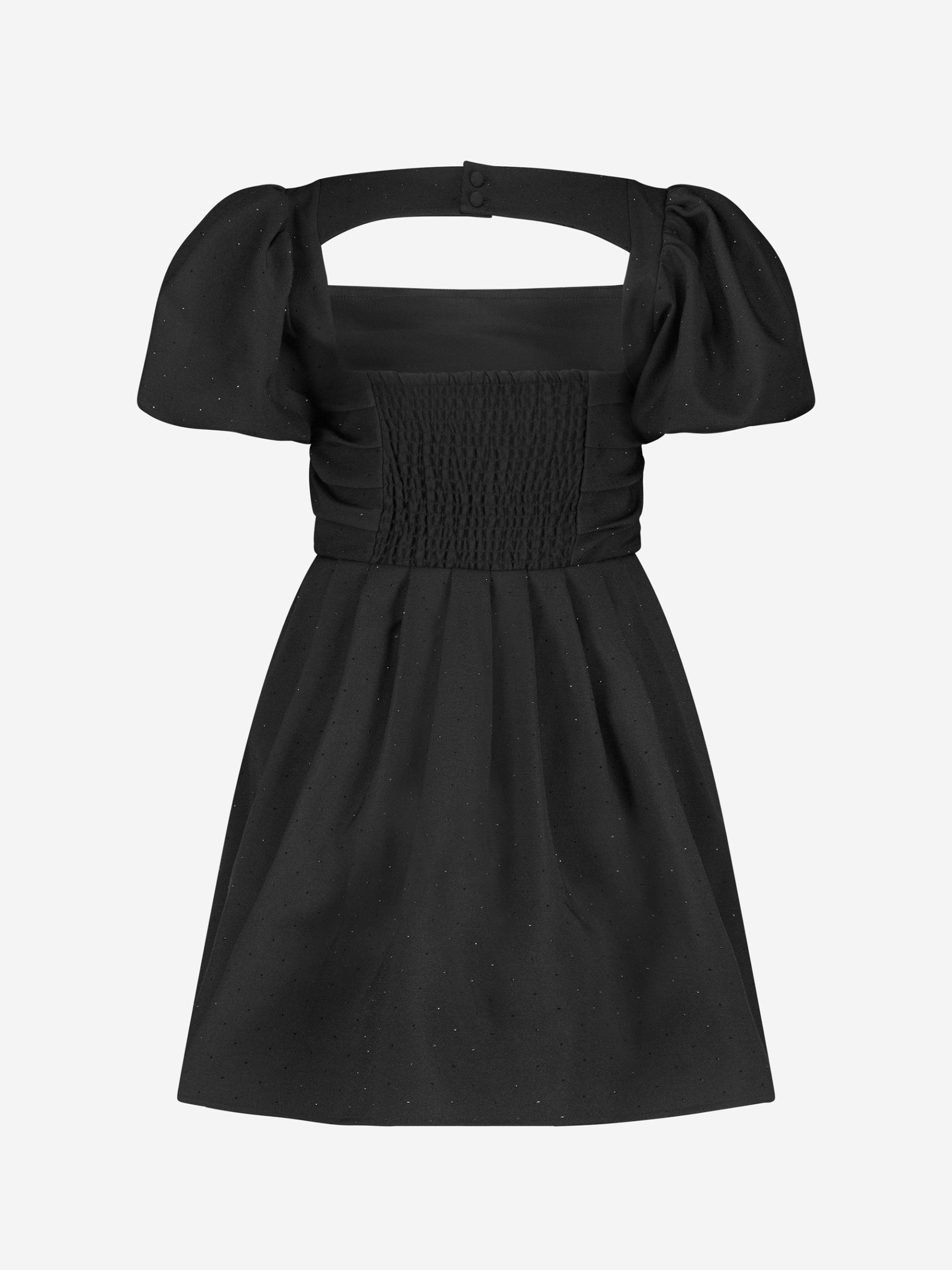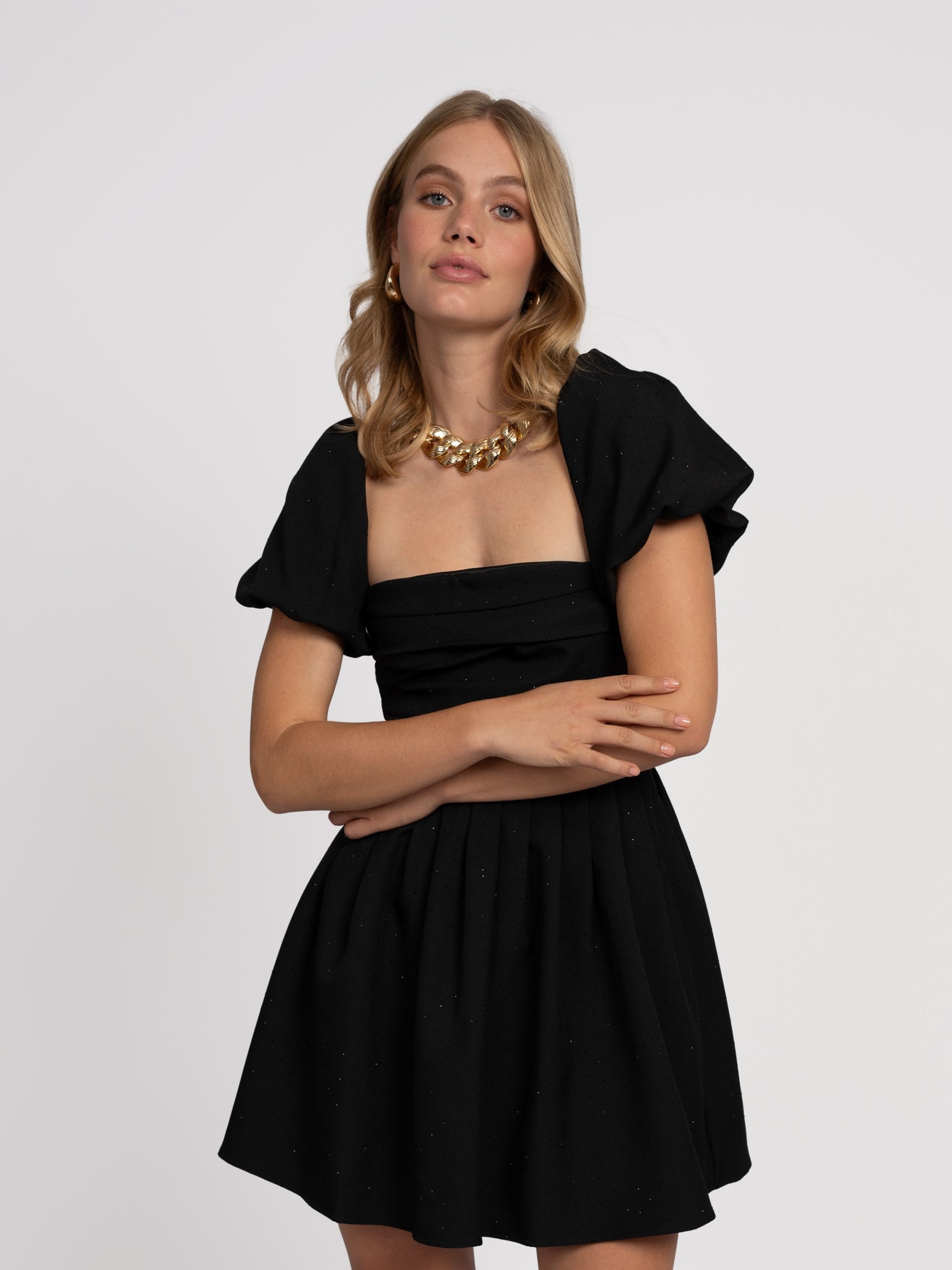 A-line dress with puff sleeves, a square neck, subtle glitter and a flared, pleated bottom. The dress has a fitted fit at the waist and a smock detail on the back.