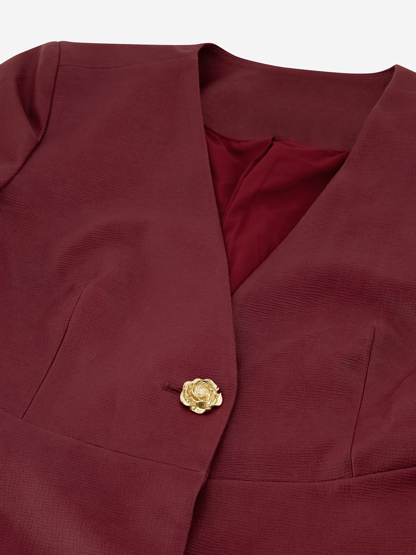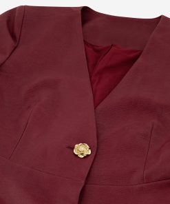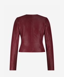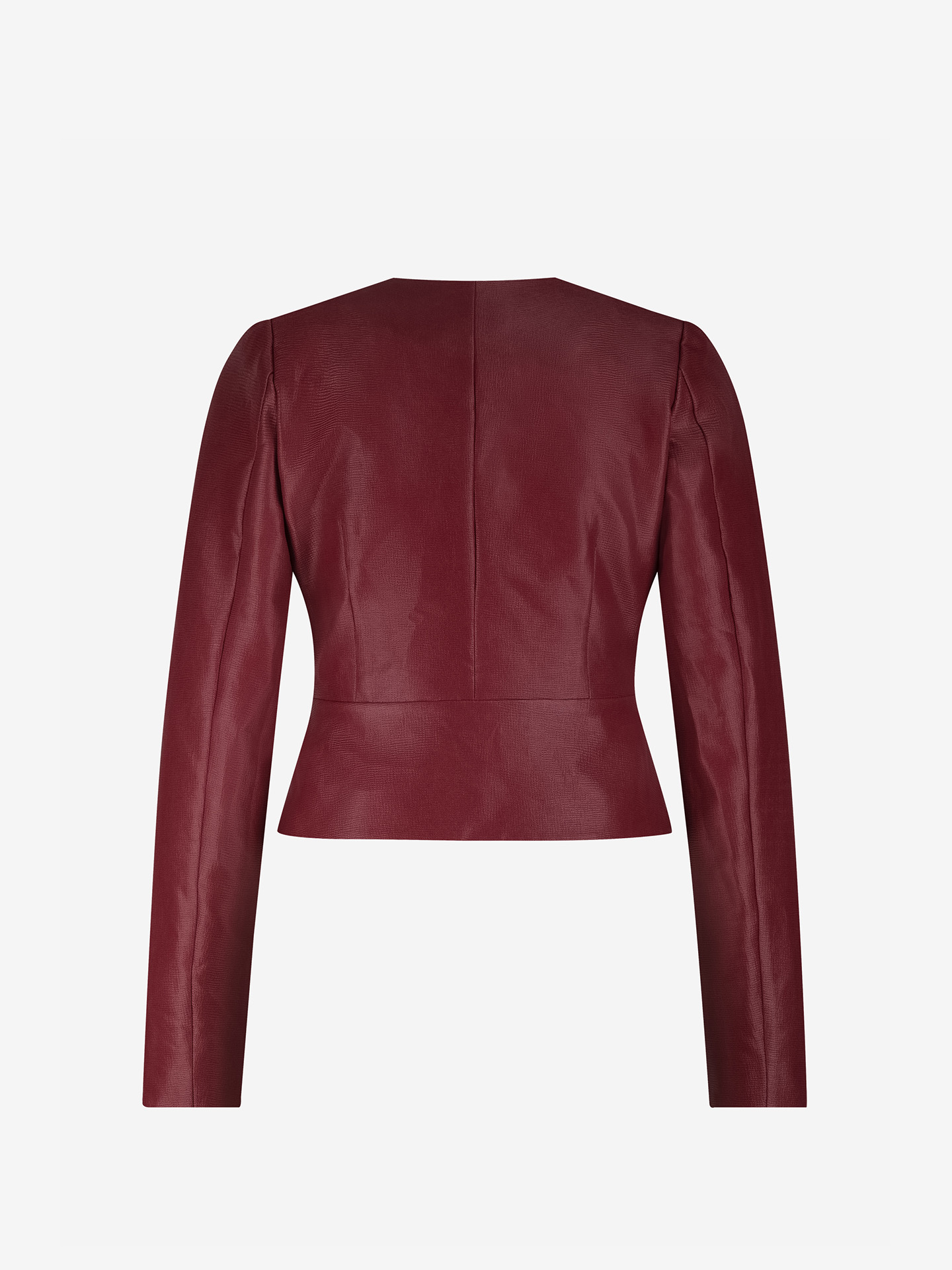 This lightly textured faux leather top features a deep V-neck and a fitted silhouette. The top has an A-line fit and a button closure.