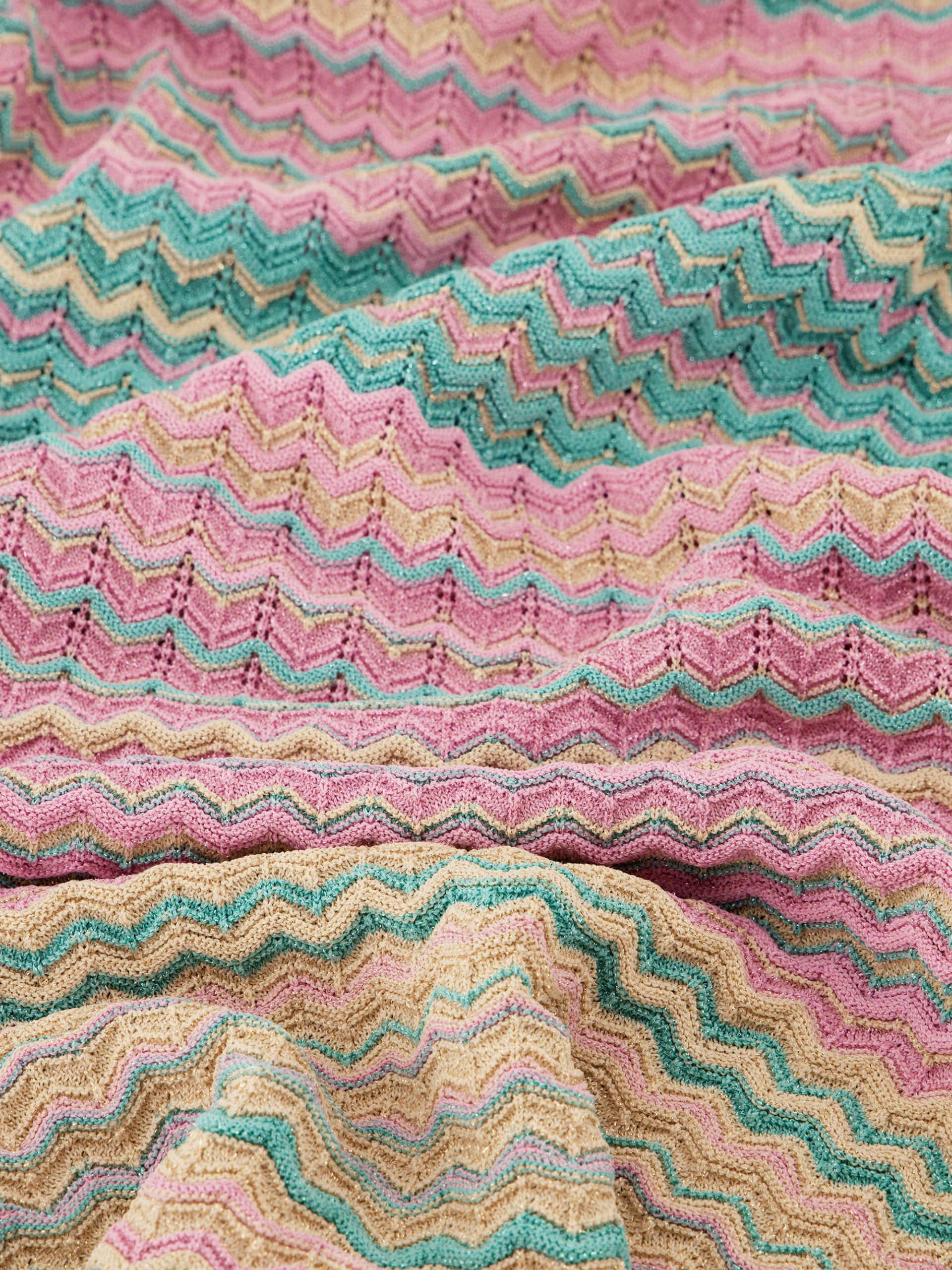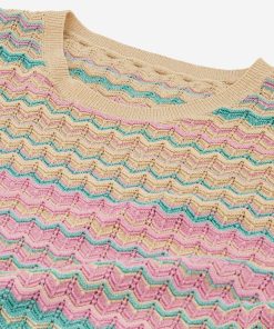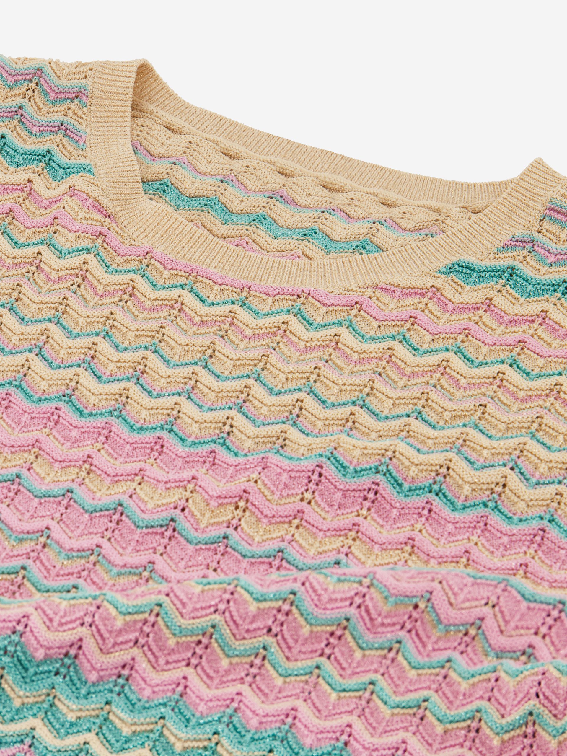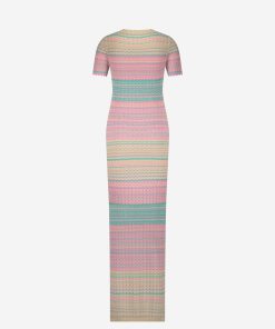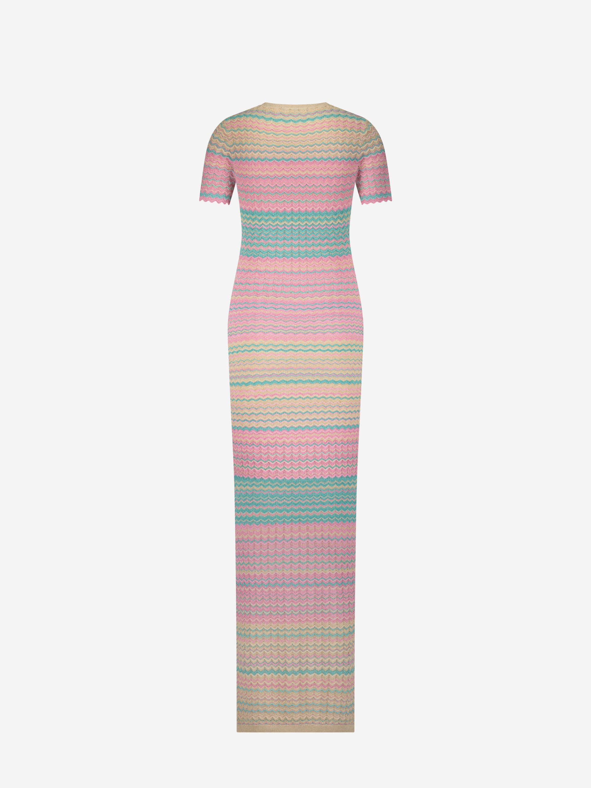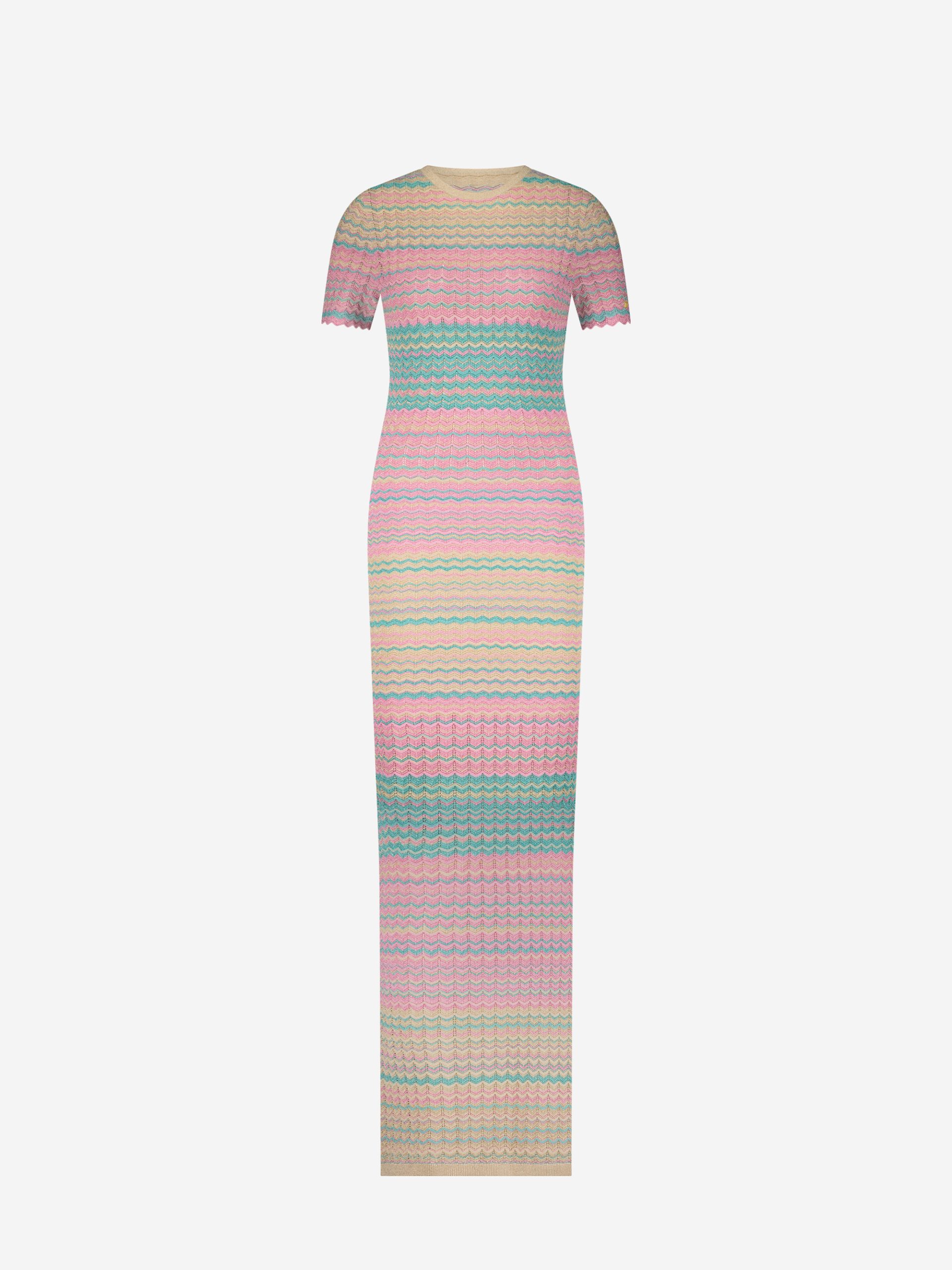 Product descriptionAjour knitted maxi dress in multi-color with a subtle woven glitter thread. The maxi dress has a scalloped edge at the sleeves and a slit at the bottom.