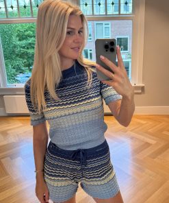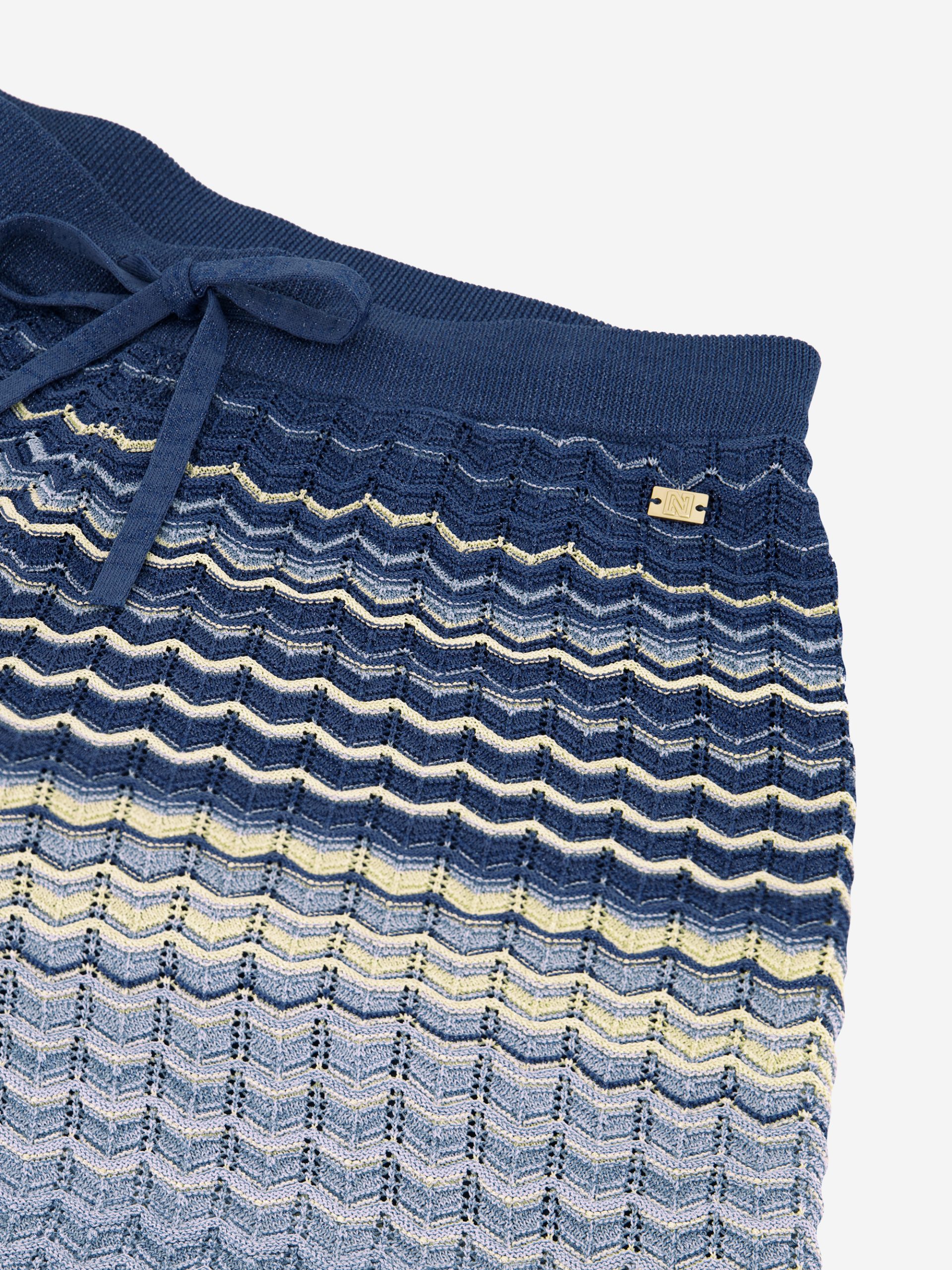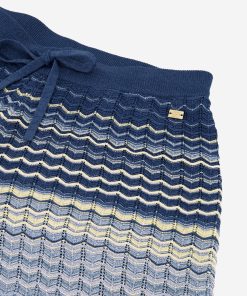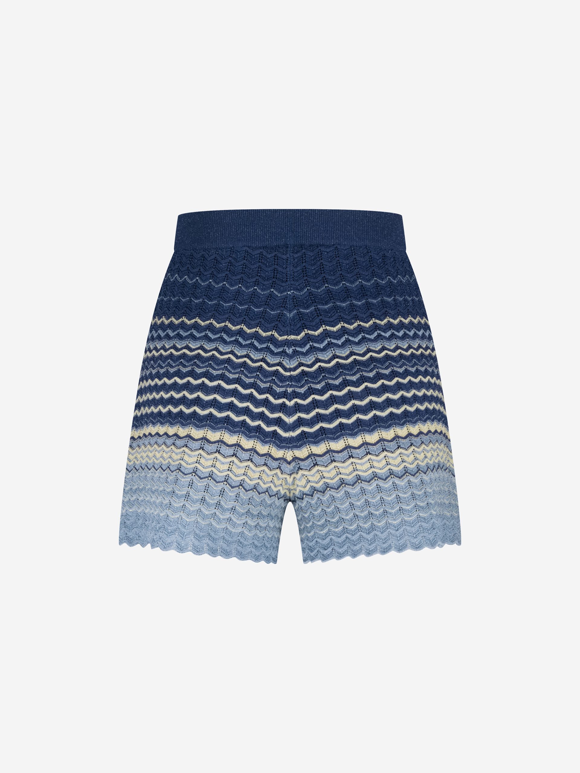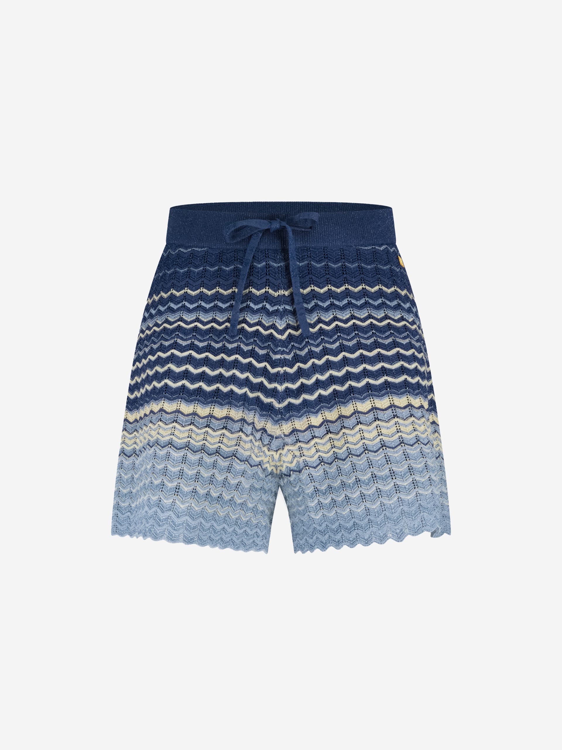 Product descriptionAjour knitted shorts in multi-color with a woven glitter thread and a scalloped edge. The shorts have an elastic waistband and drawstrings.