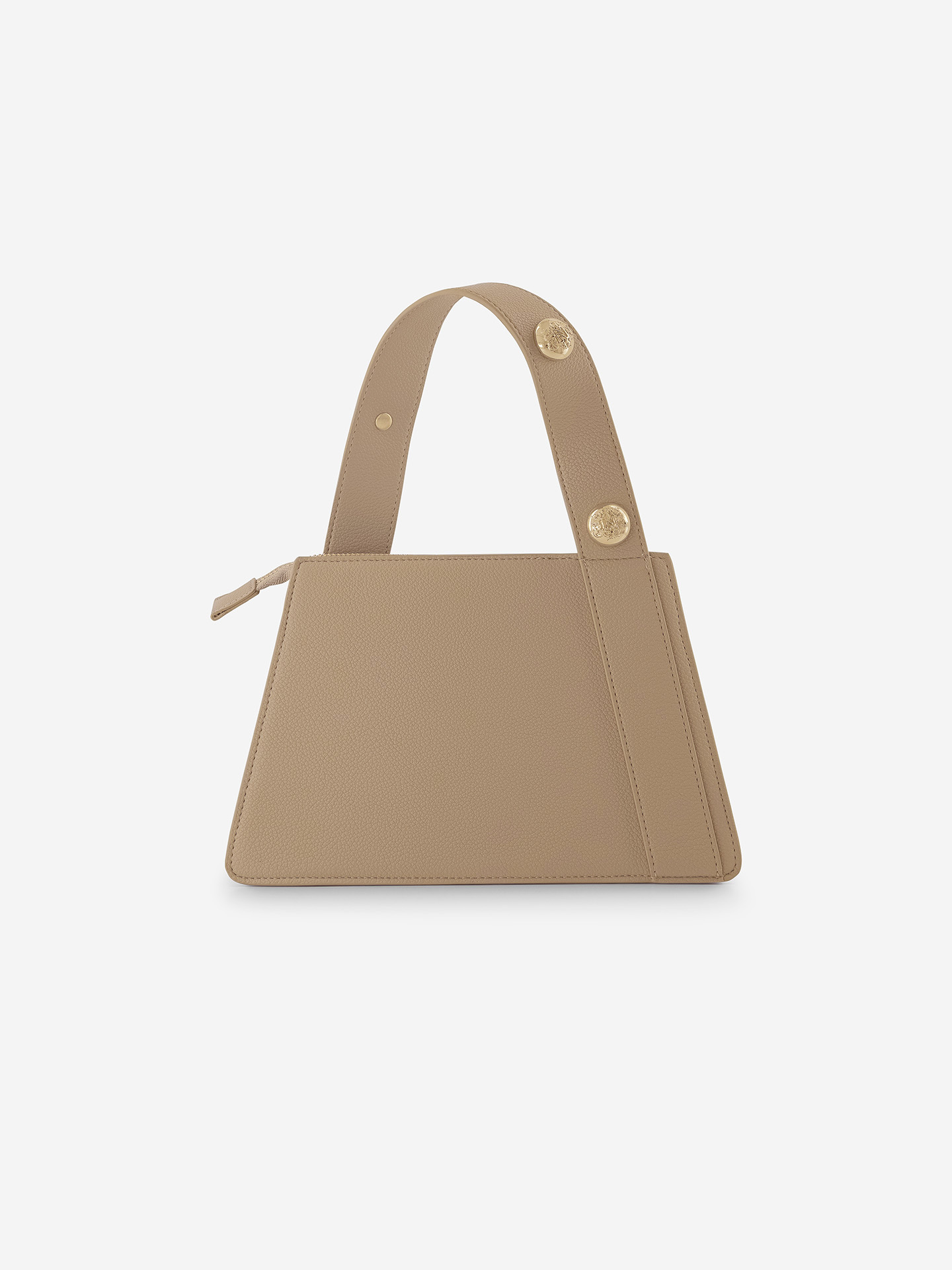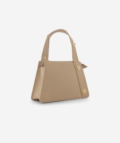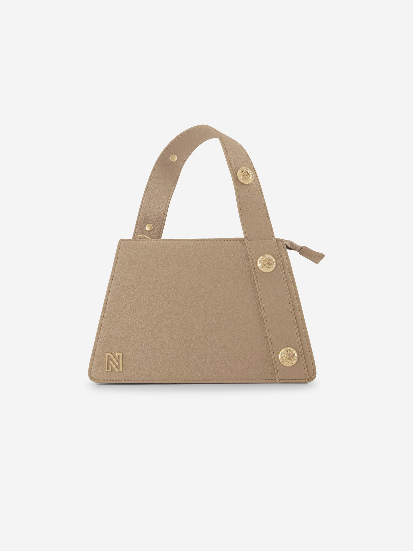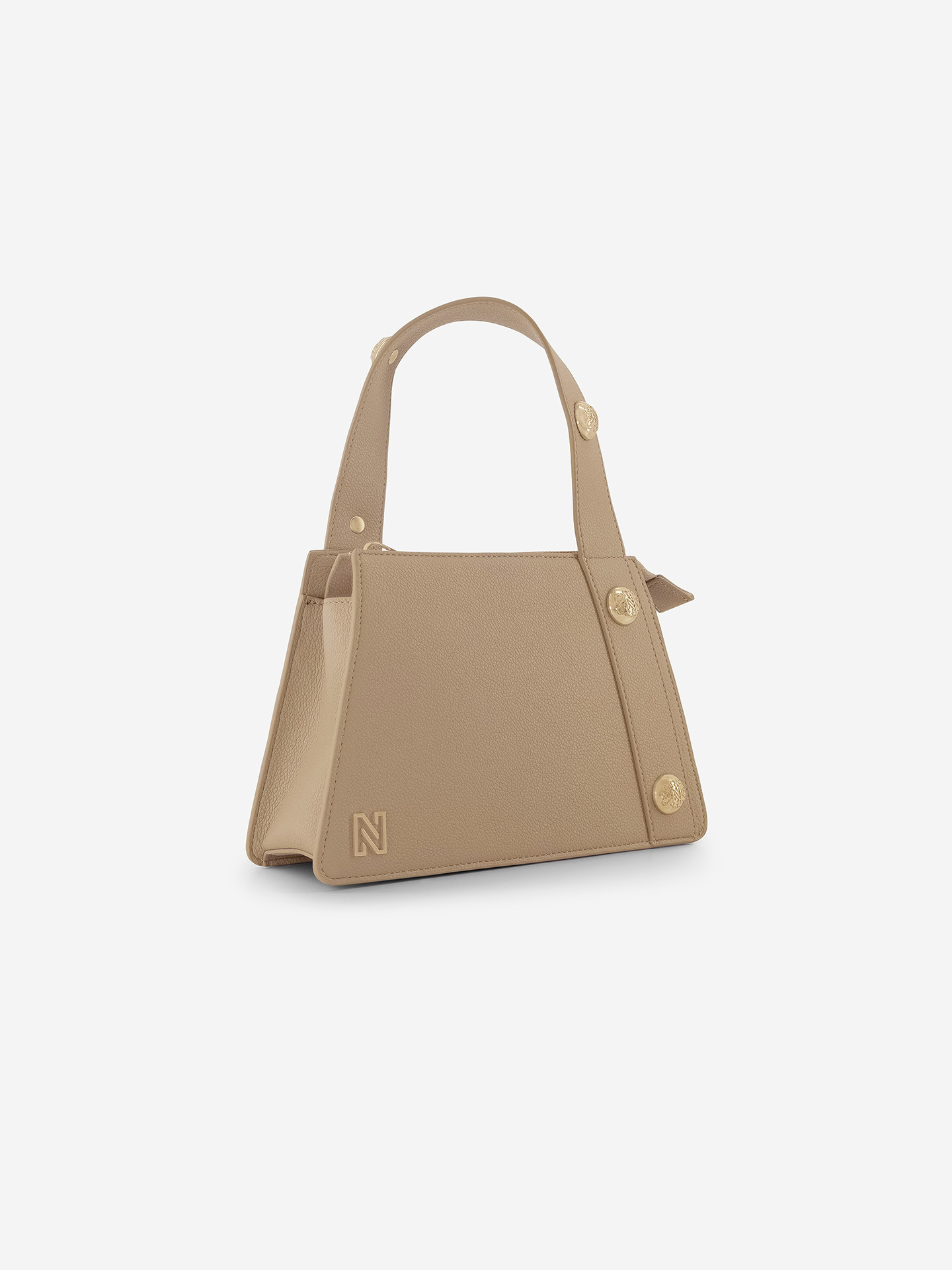 Product descriptionBag with a slightly grained texture, an asymmetrical handle with decorative buttons, and an N logo. The bag features a zipper closure and interior pockets.