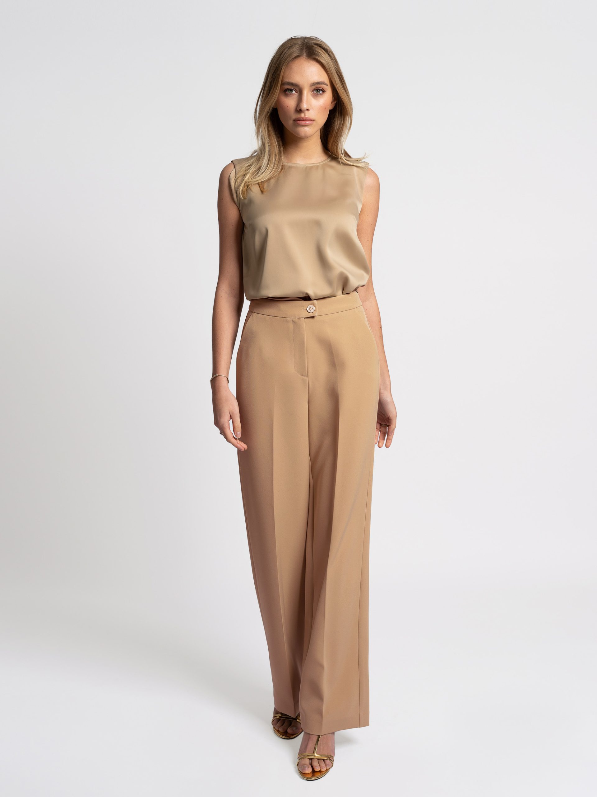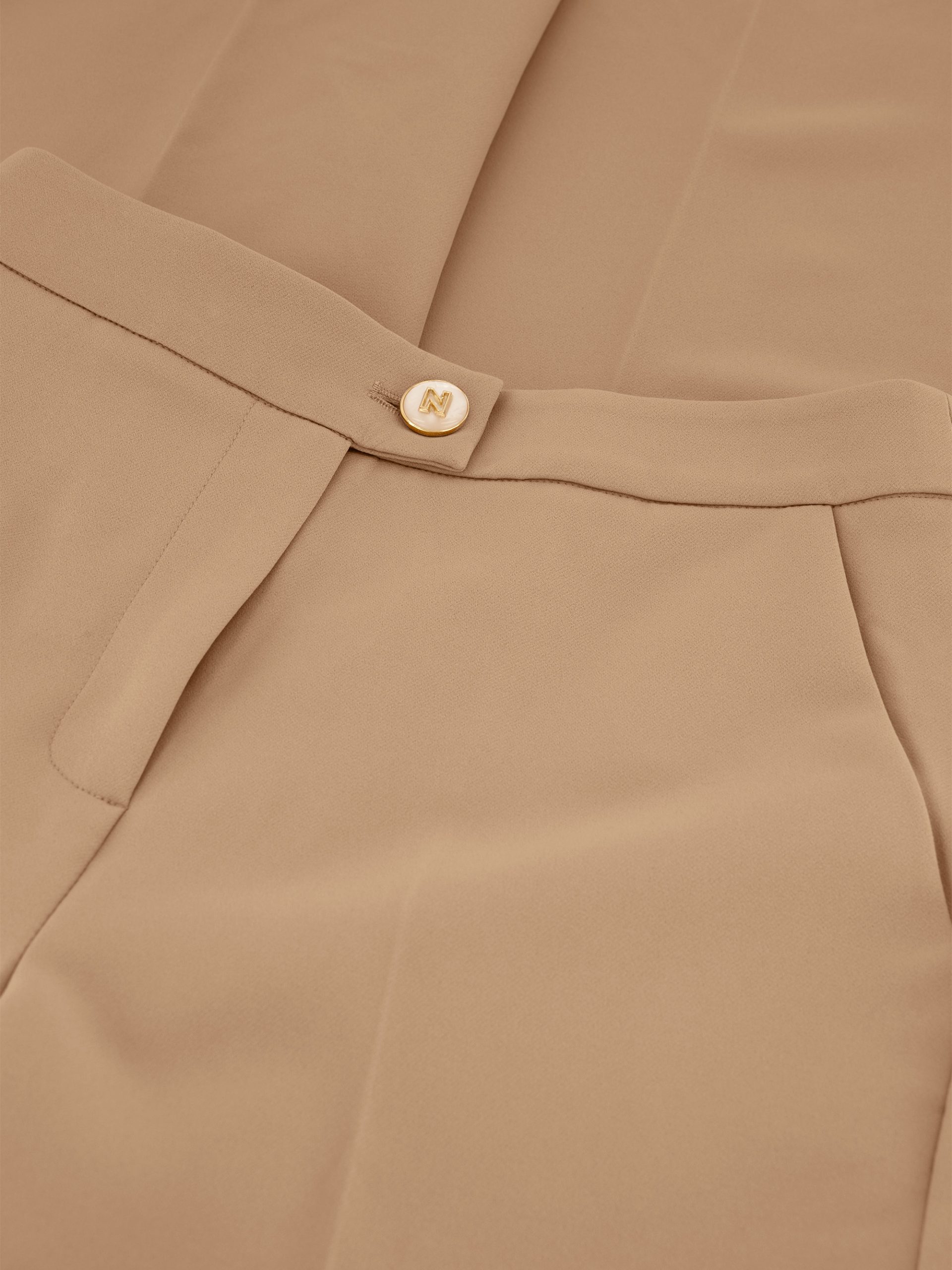 Product descriptionClassic pants with straight, loose legs, a mid-rise waist, and a pearl zipper and button closure. The trousers feature pockets and stretch fabric.