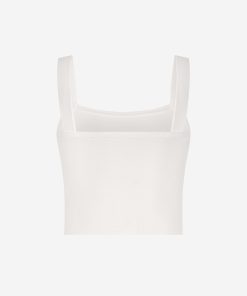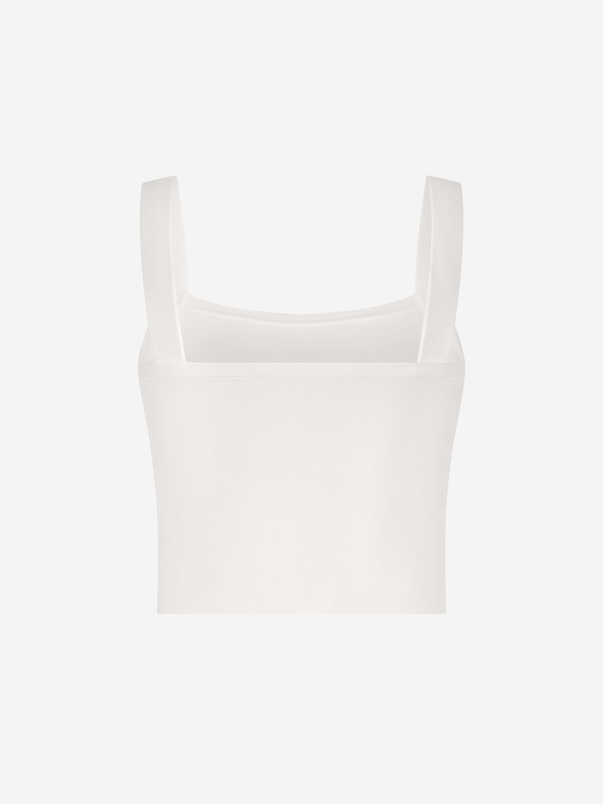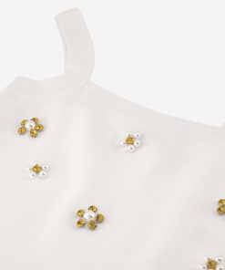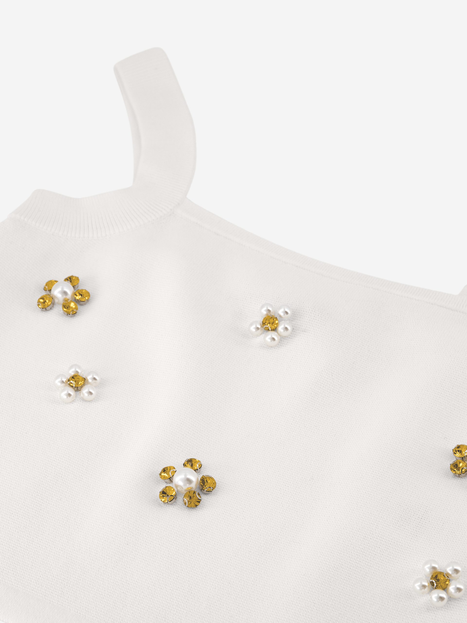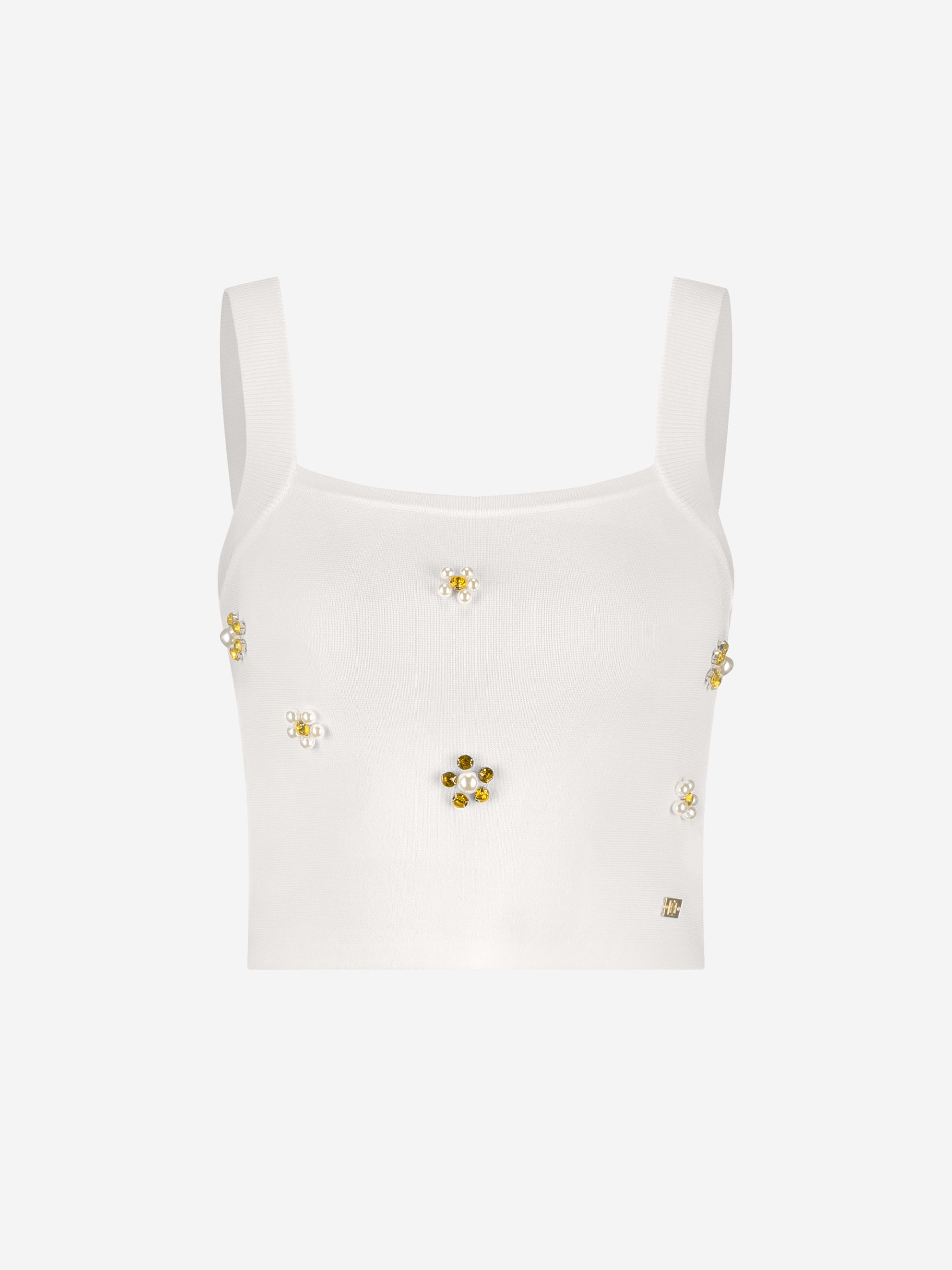 Cropped top with decorative flower details of pearls and rhinestones and a square neck. The top is provided with a stretchy fabric and a tight fit.