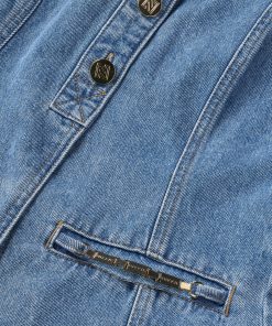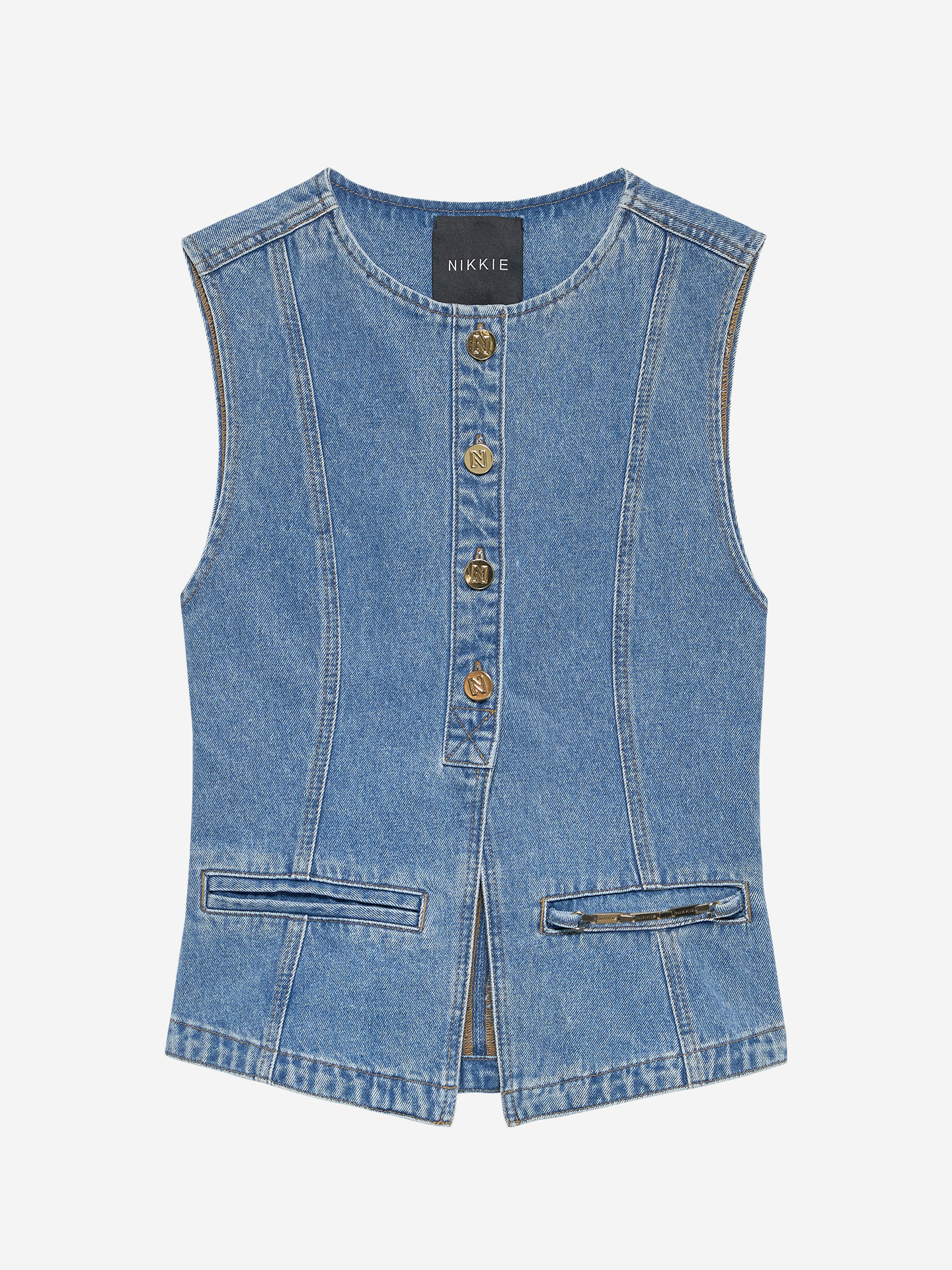 Product descriptionSleeveless denim vest with a round neck, button closure, and subtle chain detail.