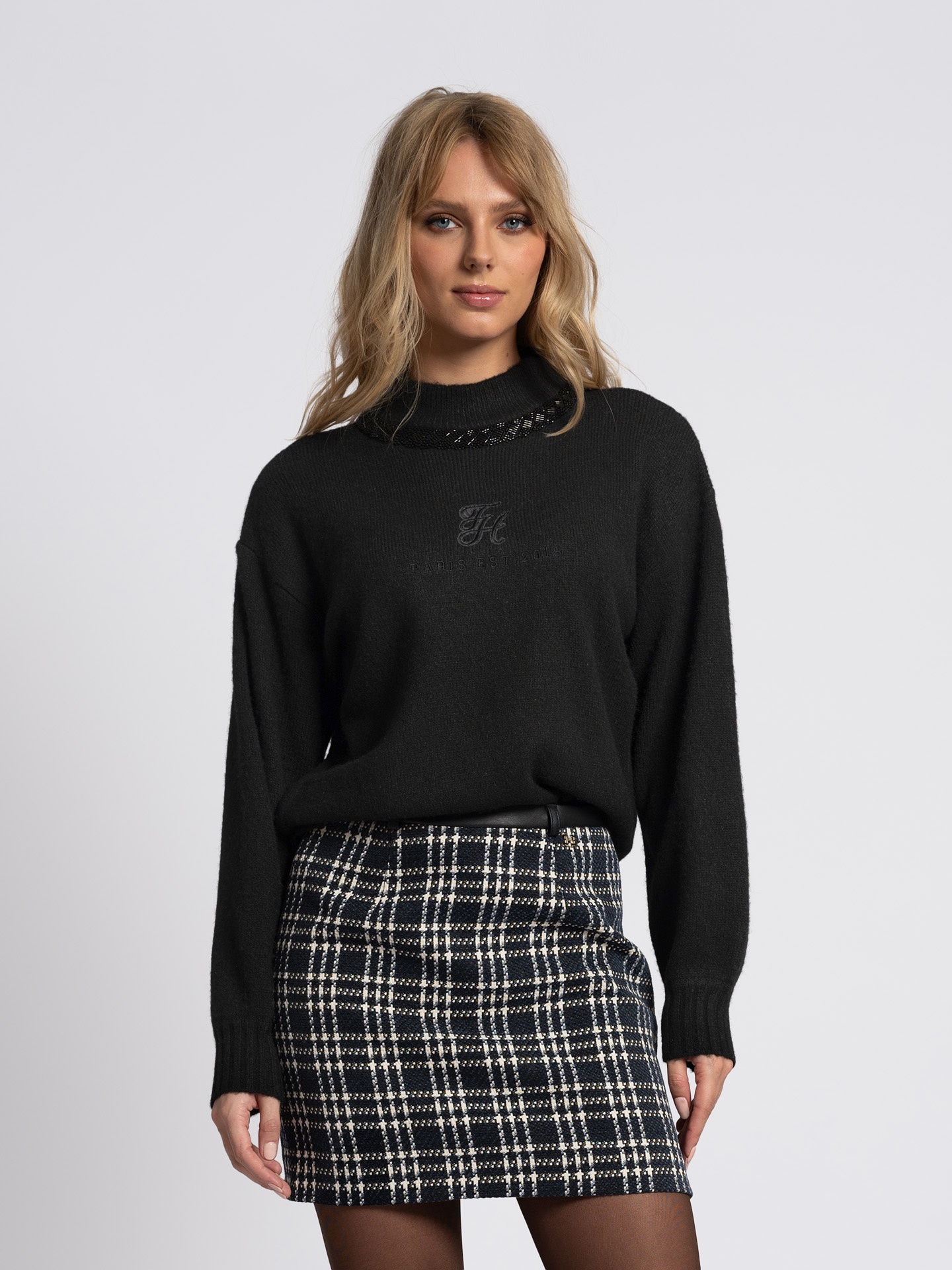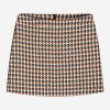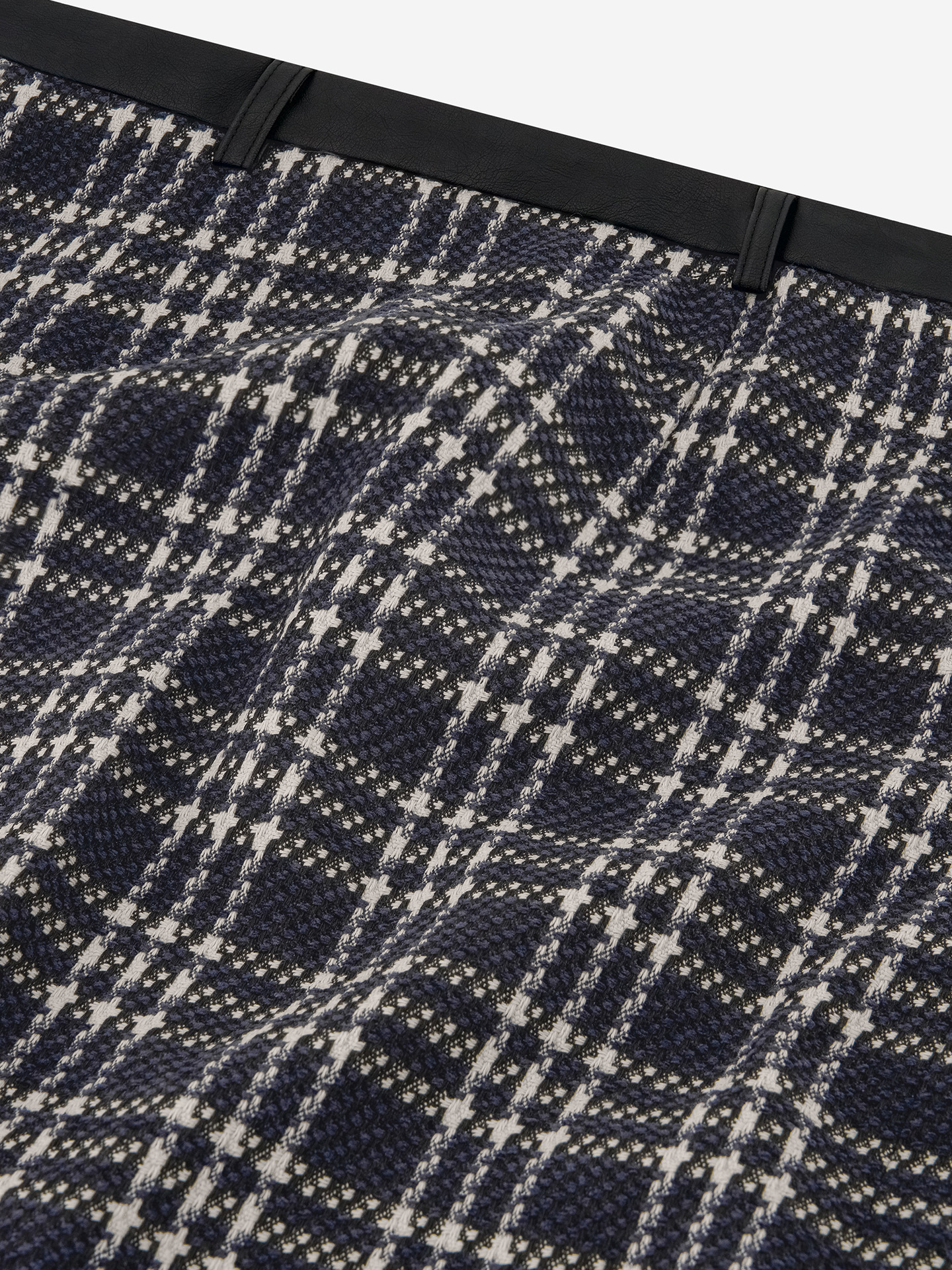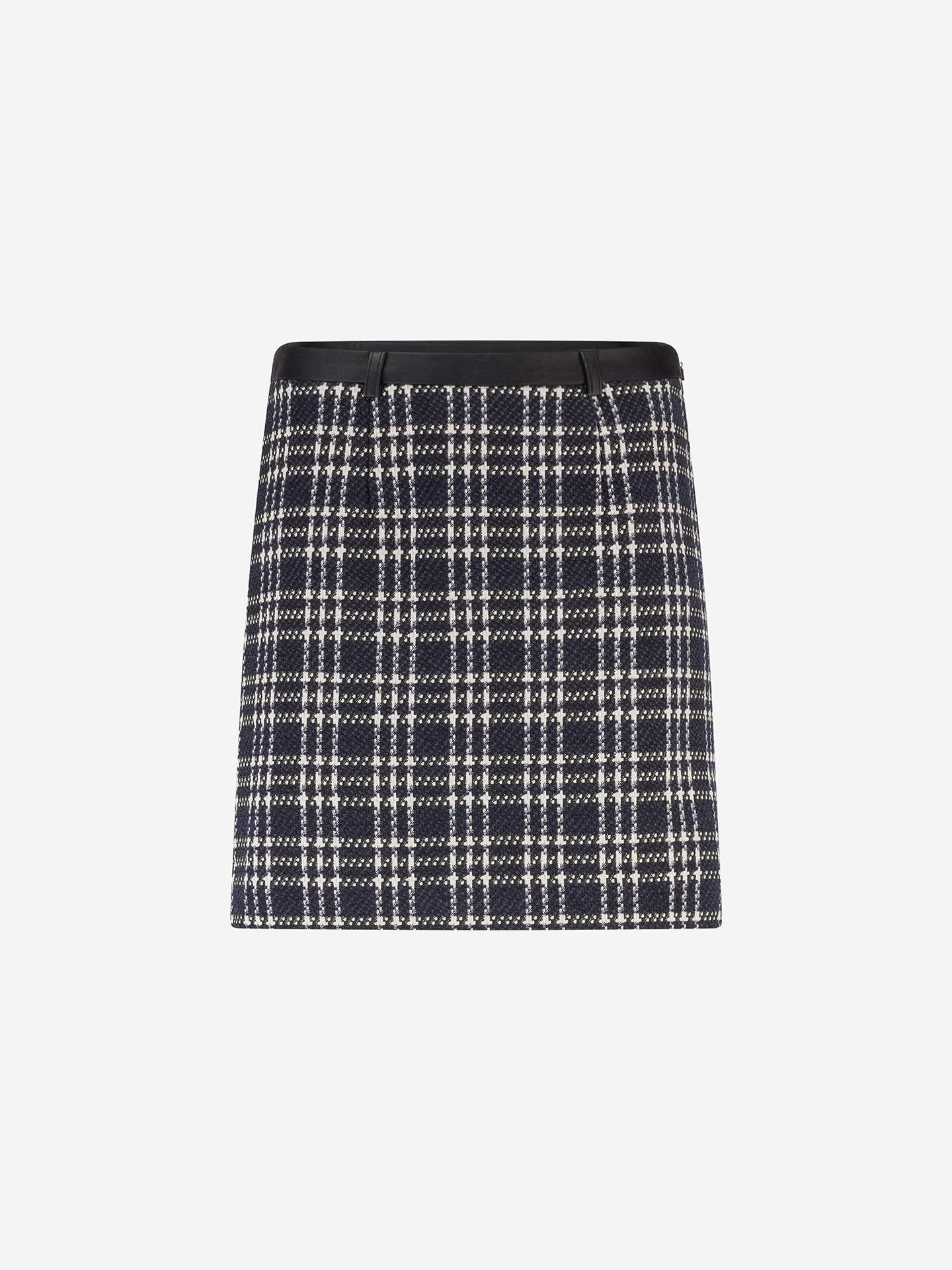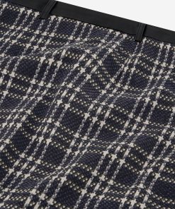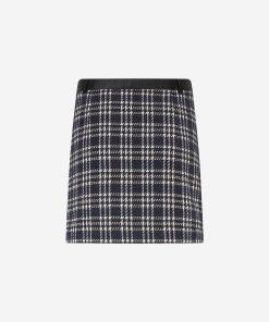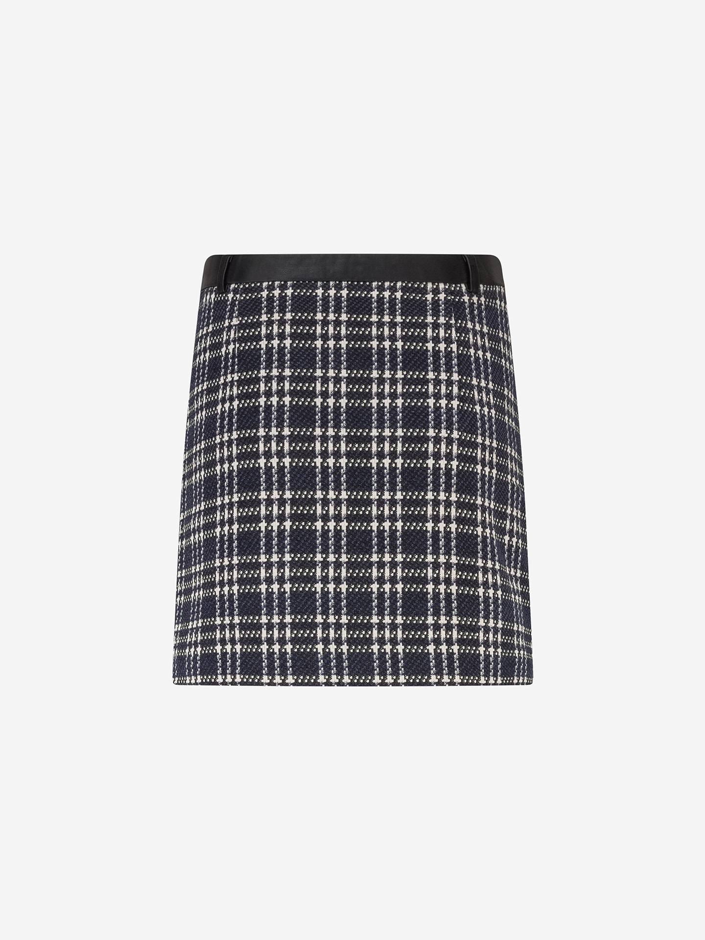 Product descriptionWoven skirt with a checked pattern, a faux leather waistband, and a mid-rise waist. The skirt has a zipper closure and a fitted fit.