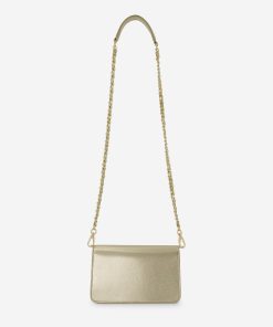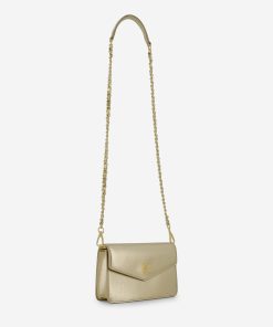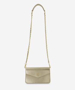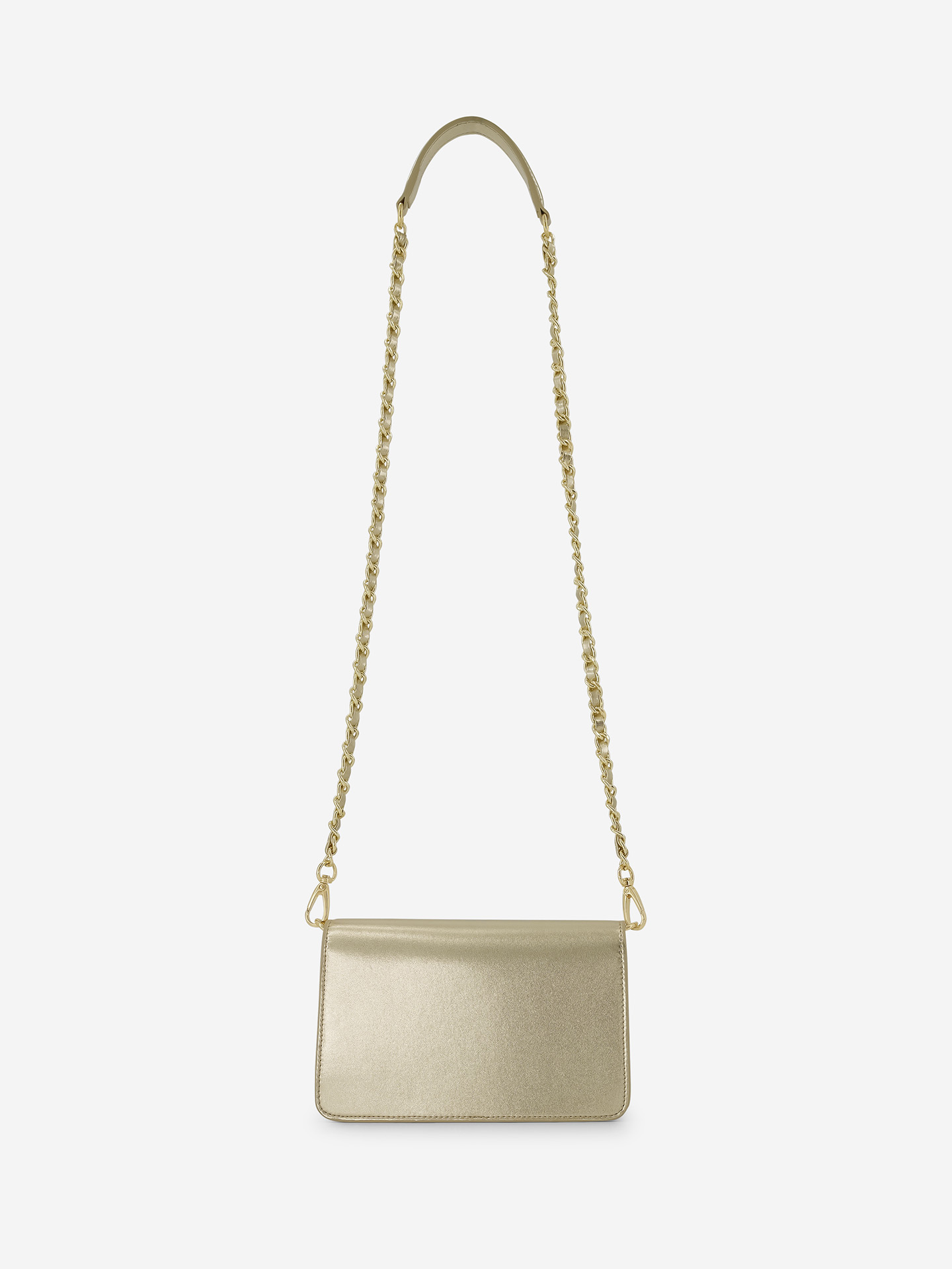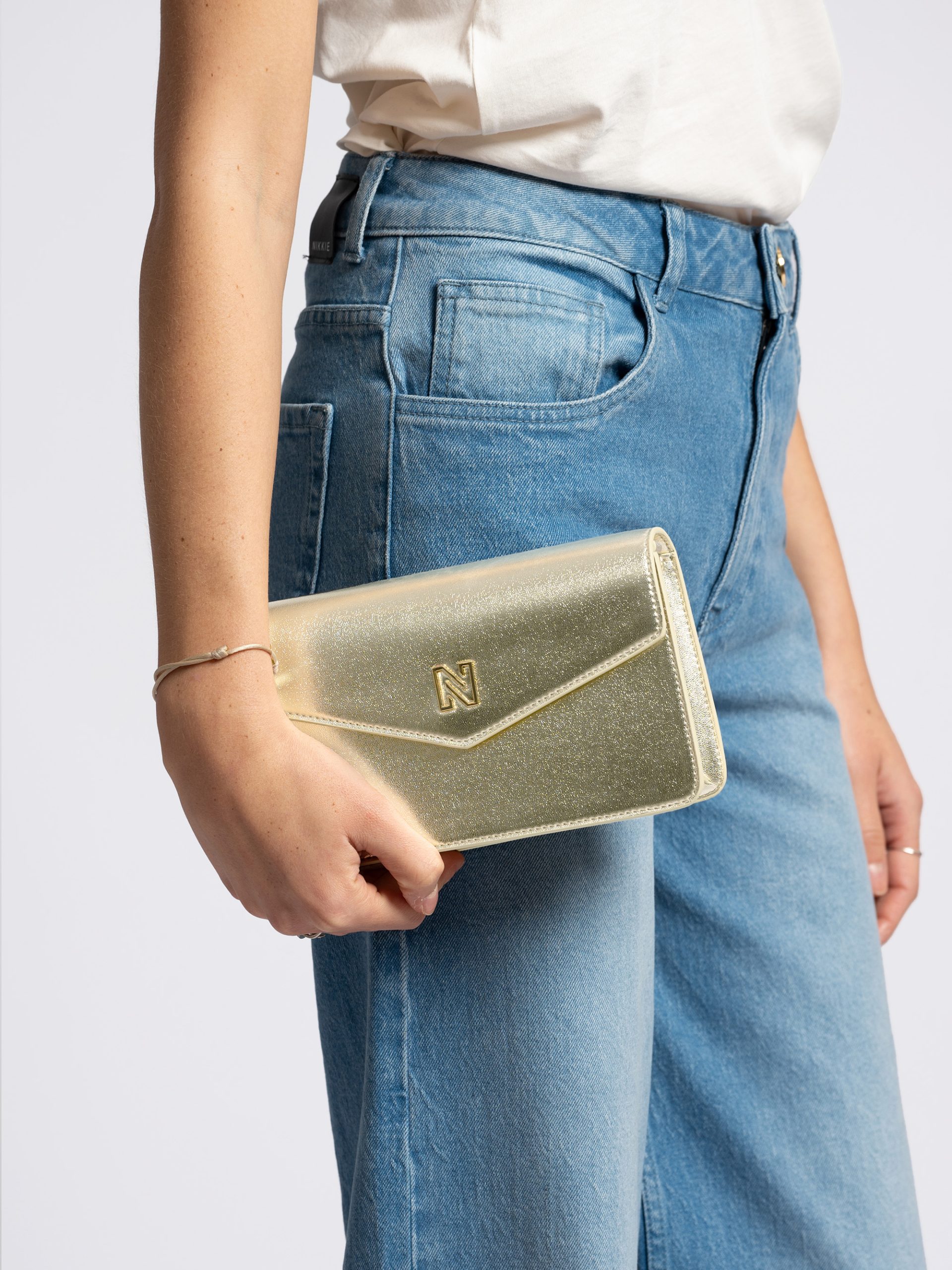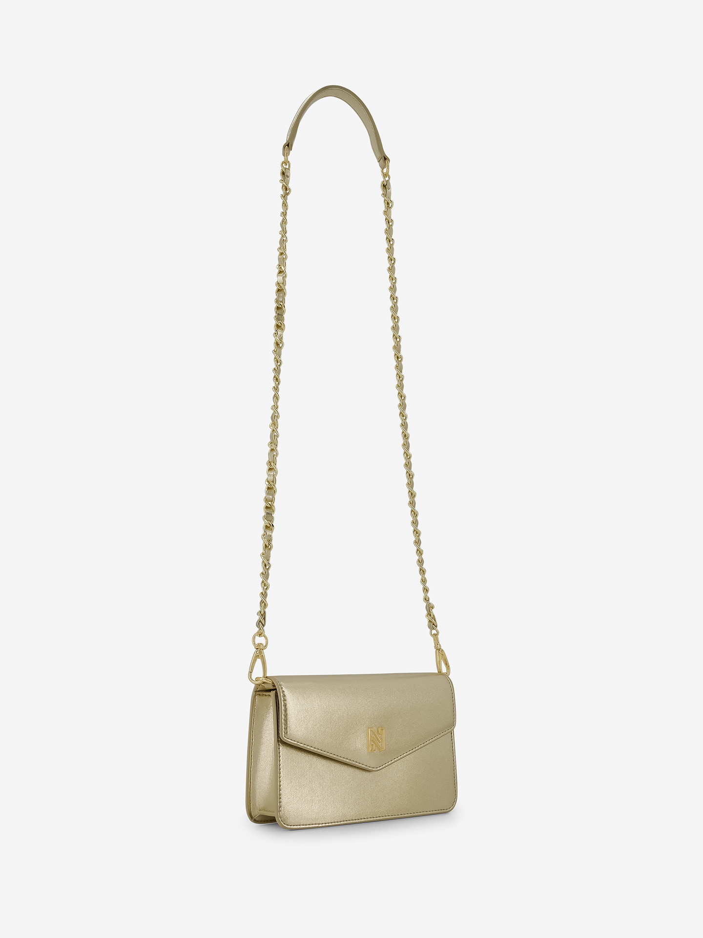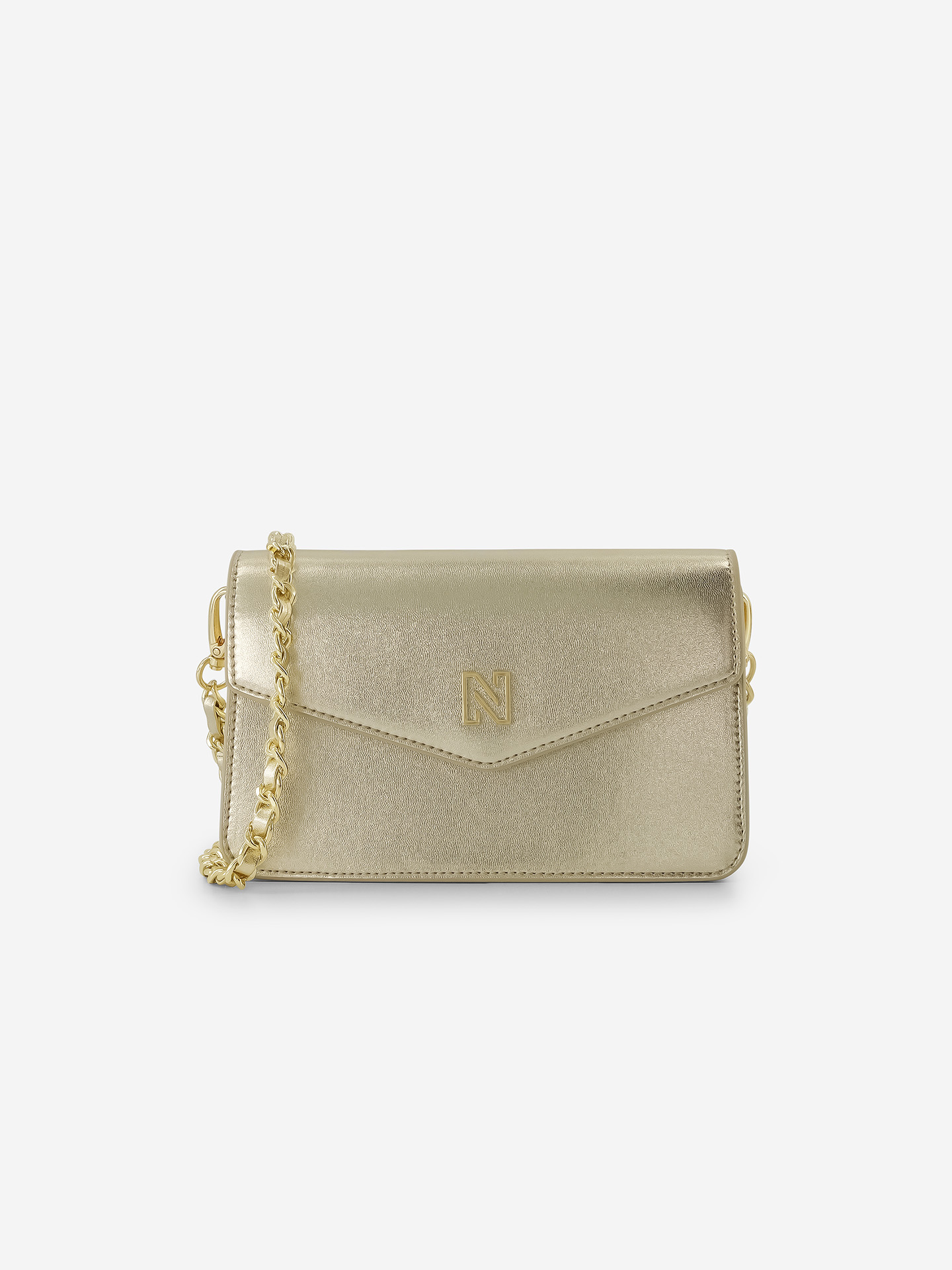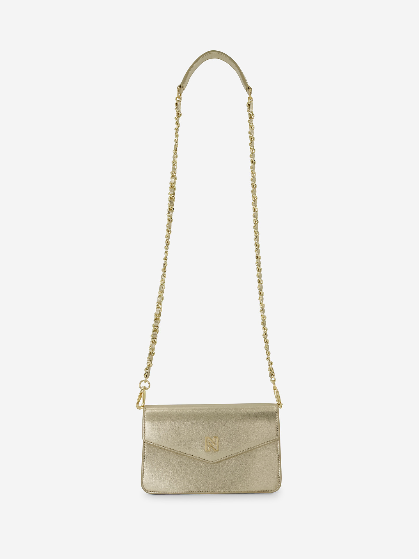 Product descriptionGold metallic shoulder bag with a detachable shoulder strap, a flap-over, and an inside pocket. The bag features an N logo and a magnetic snap closure.