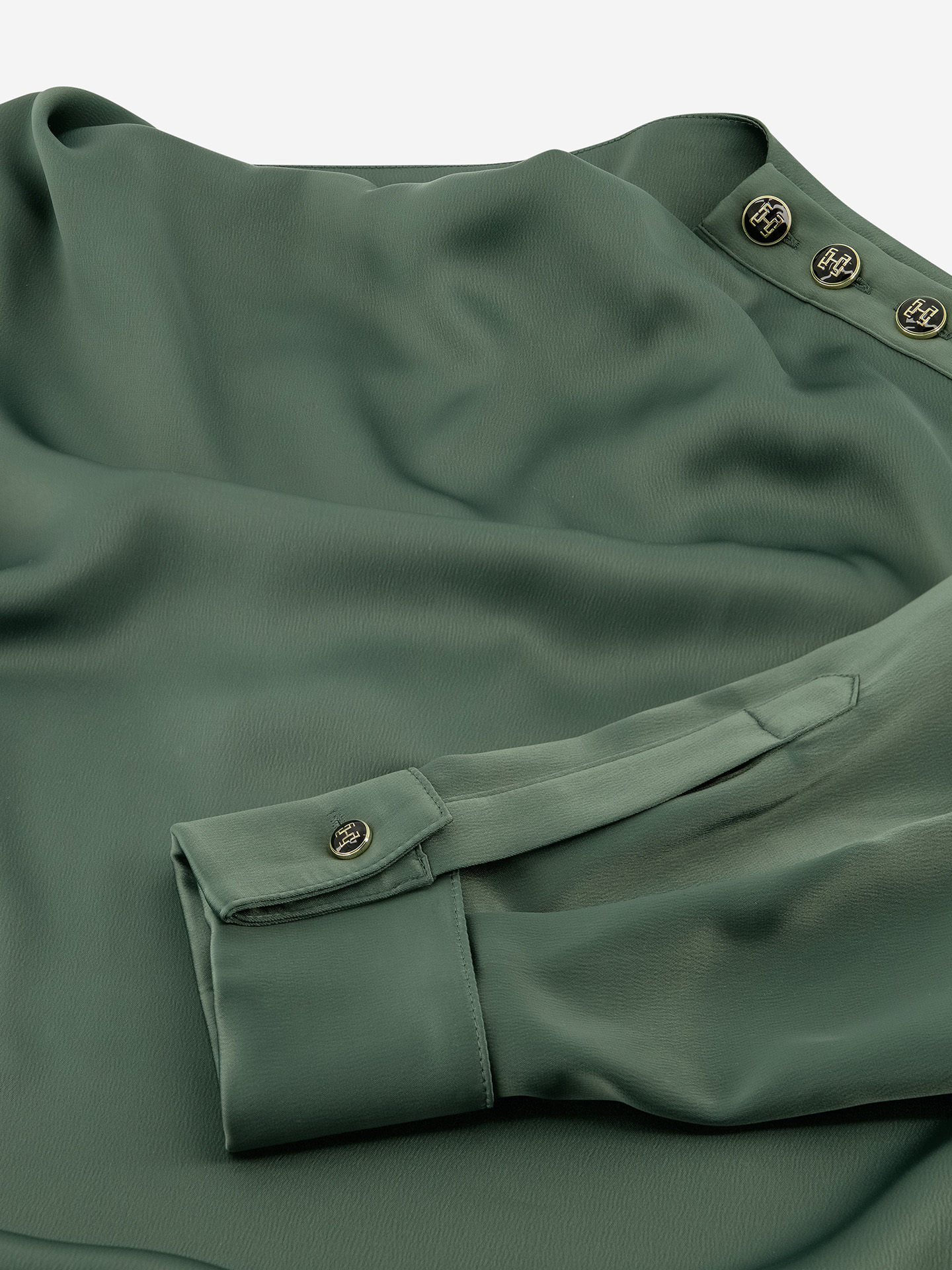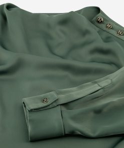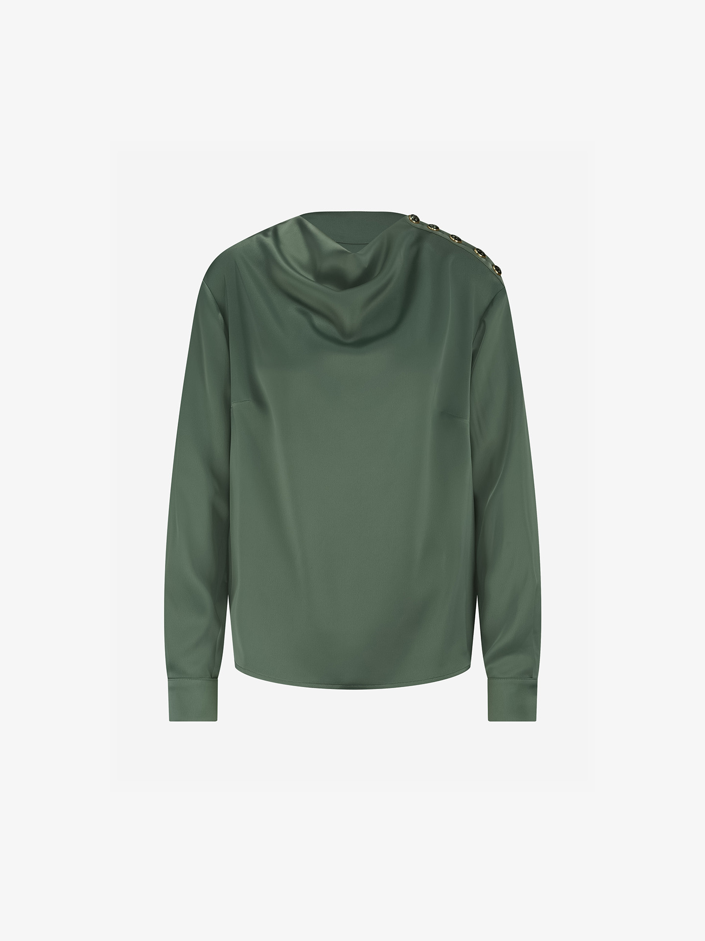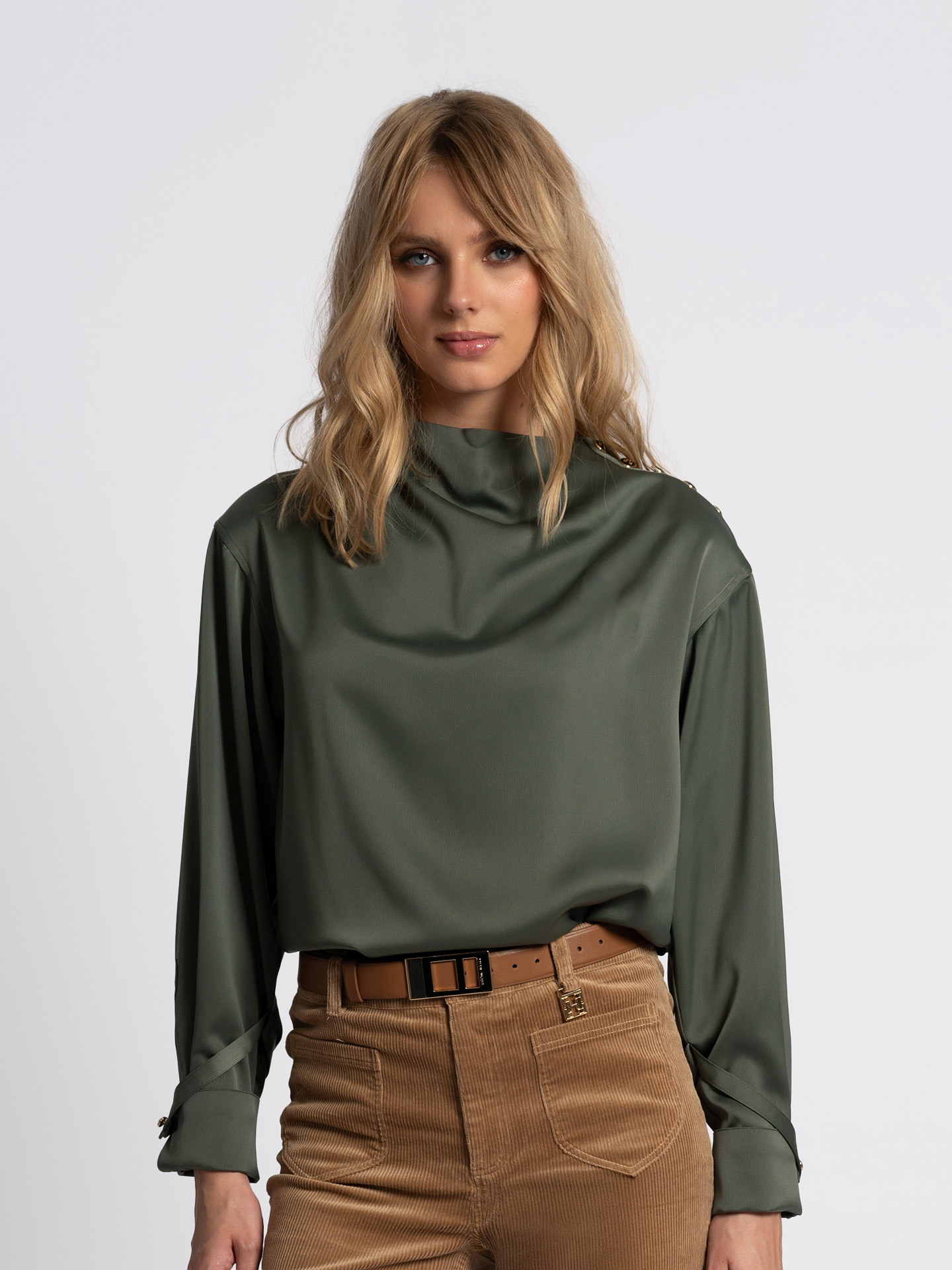 Product descriptionBlouse with a high turtleneck, a draped neckline, and an embroidered logo. The blouse features button details on the shoulder, a smooth fabric, and a relaxed fit.