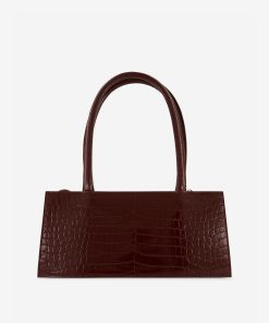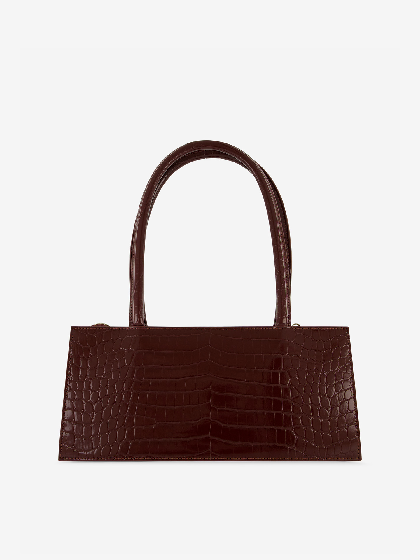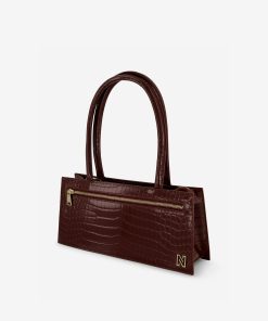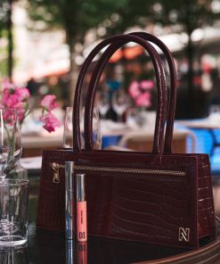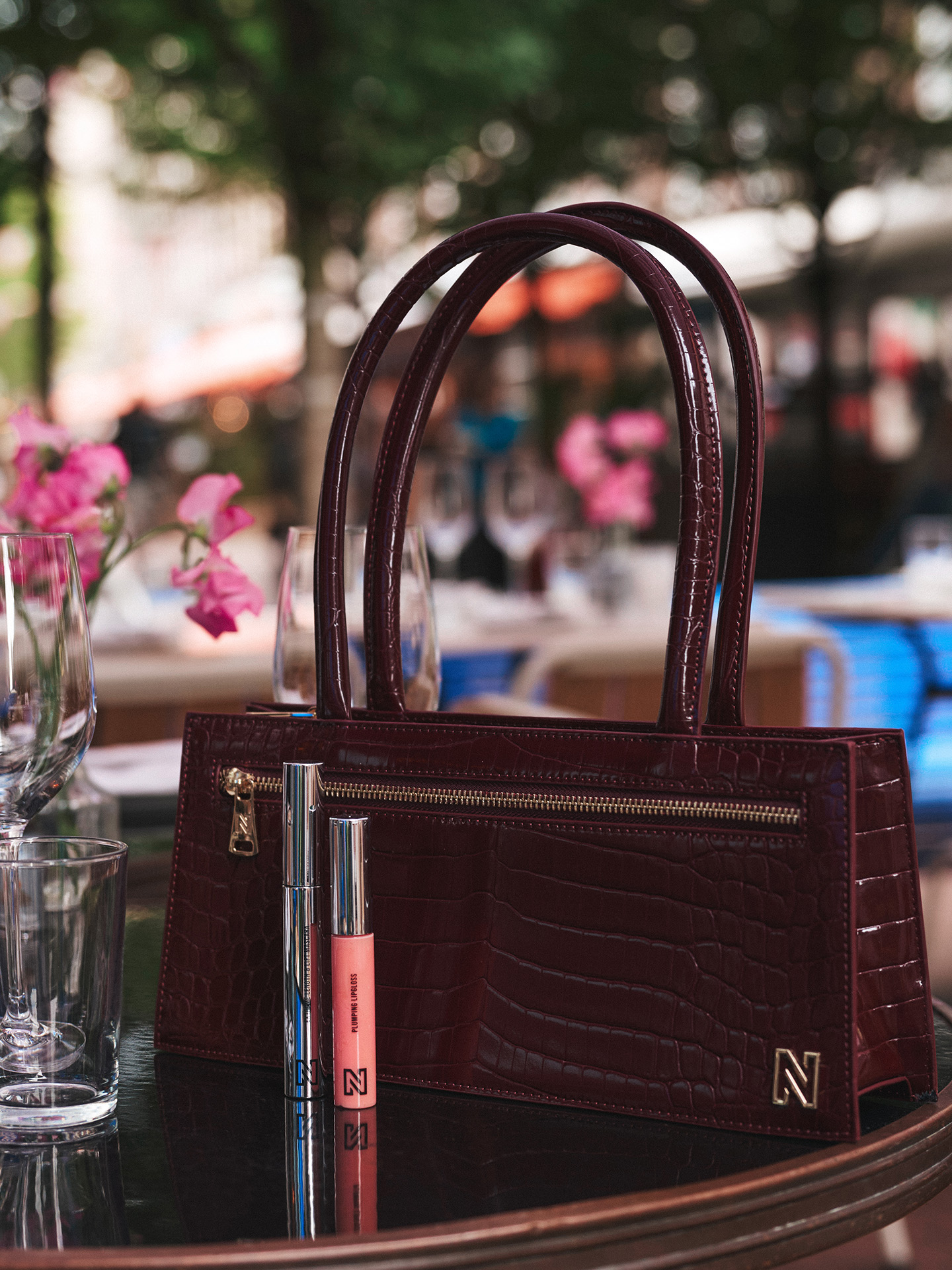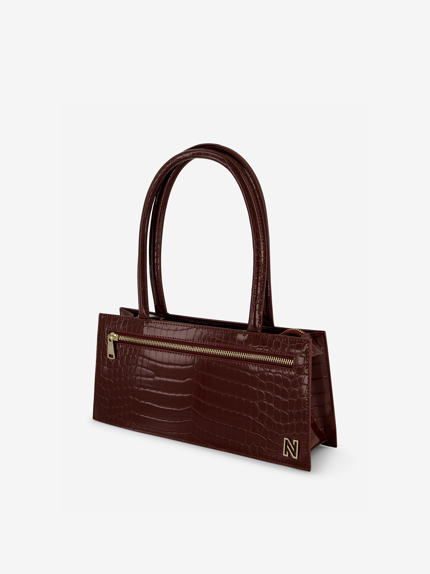 Rectangular bag in faux leather with a crocodile texture and two long handles. The bag features a zipper closure, an N logo, and a zipper detail.
