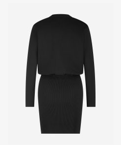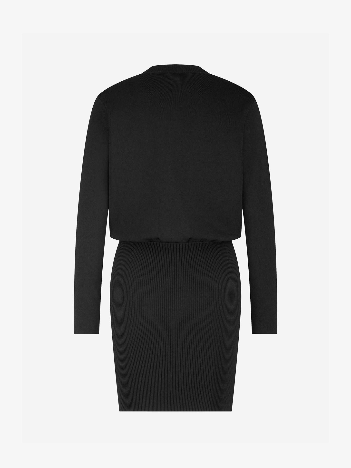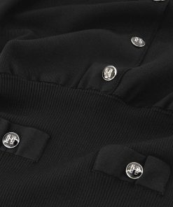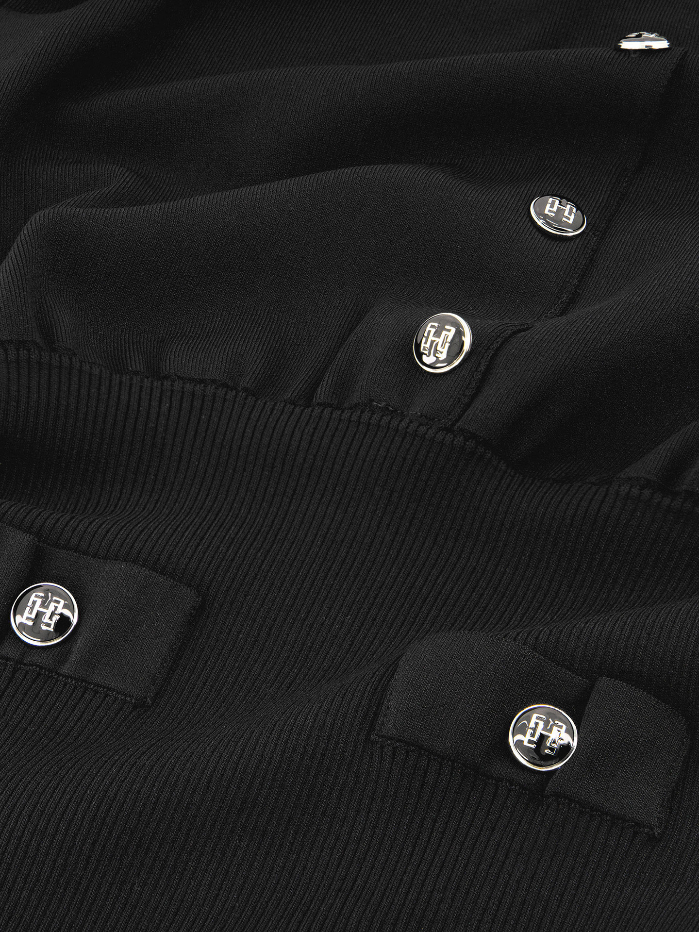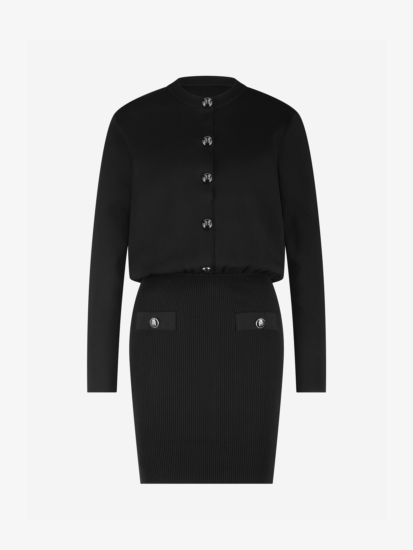 Product descriptionFitted dress that resembles a cardigan with a ribbed skirt. It features a button closure, a high round neck, and decorative pockets with luxurious button details.