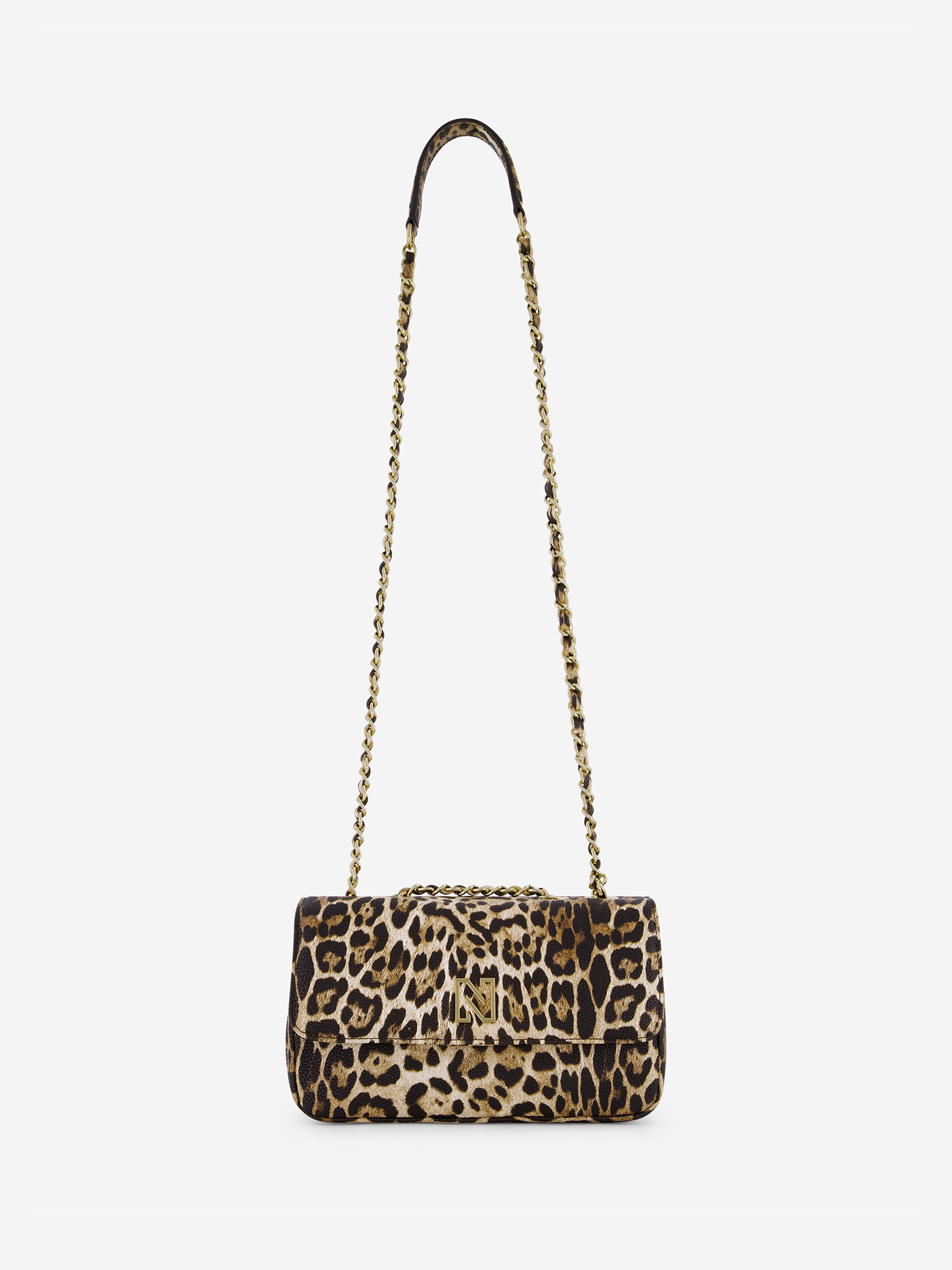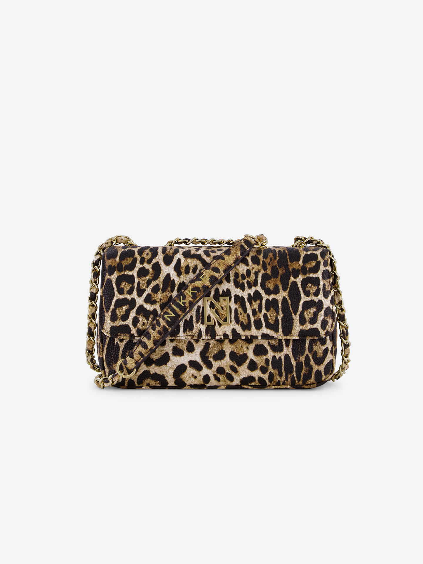 Product descriptionLeopard print shoulder bag with a detachable and adjustable chain strap, NIKKIE logo, and a flap-over design.