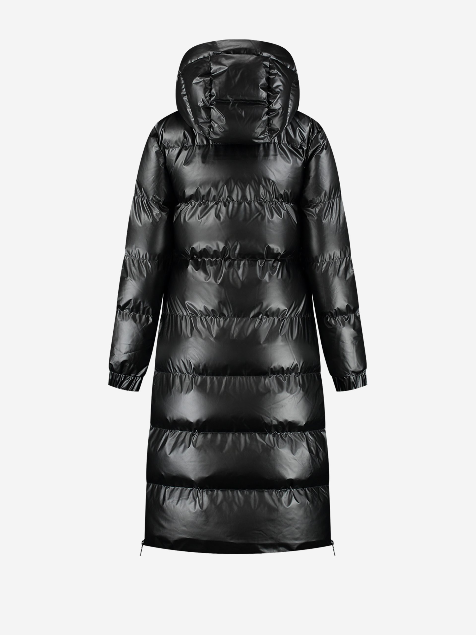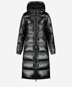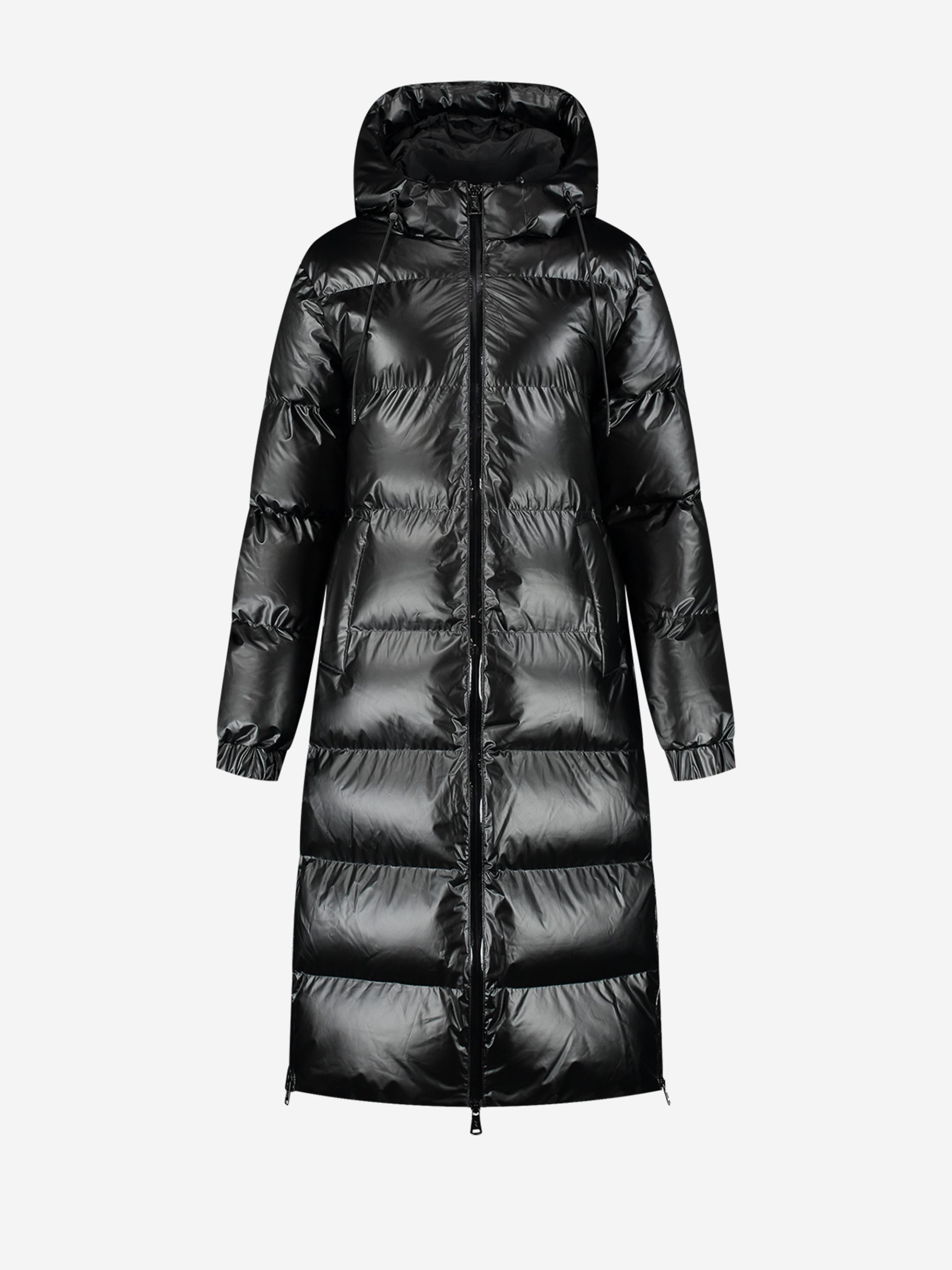 A long puffer jacketwith a metallic look, features a hood with drawstrings and a center andbottom/side zipper closure. The jacket has pockets, no stretch and provides aregular, comfortable fit.