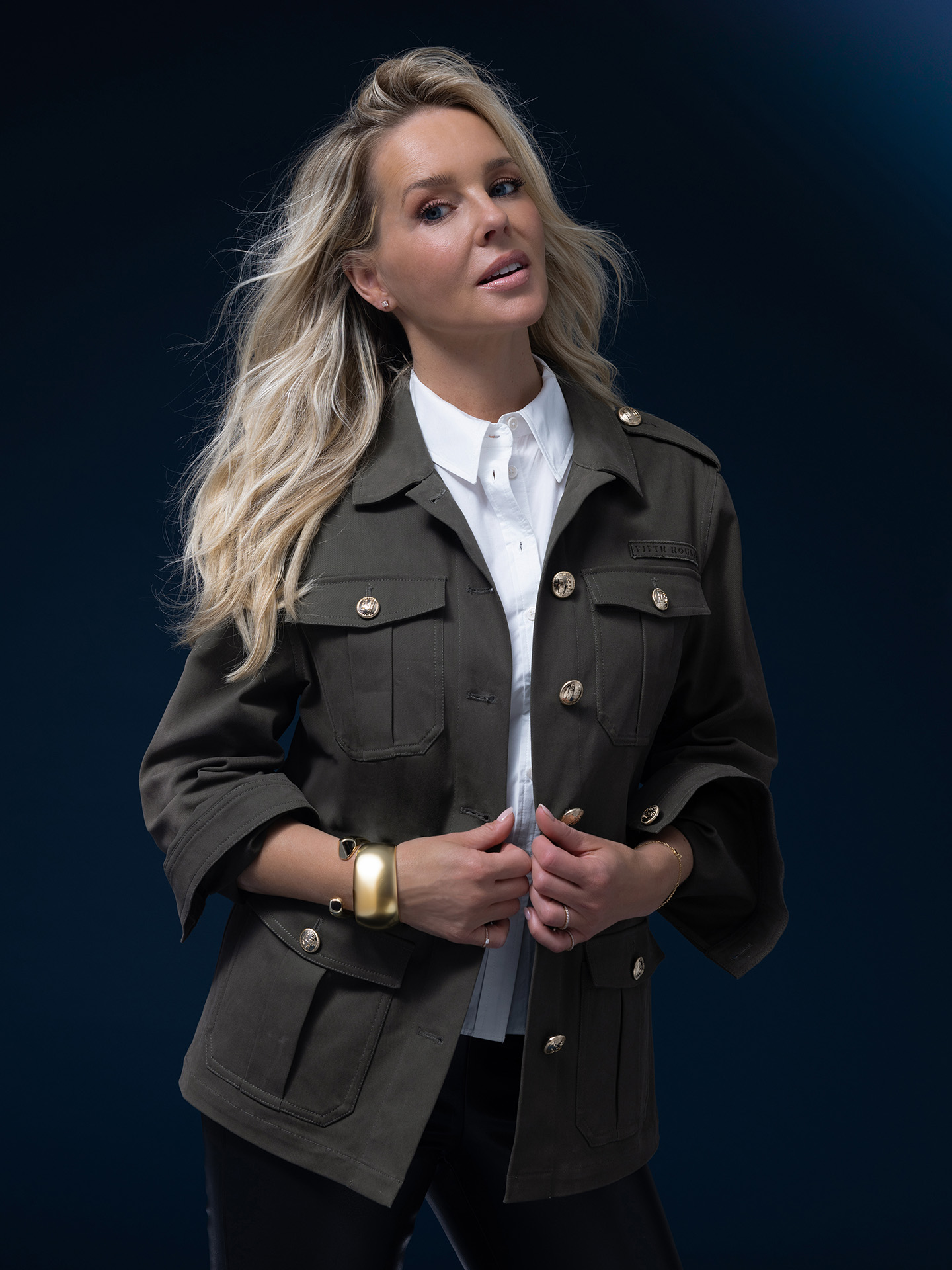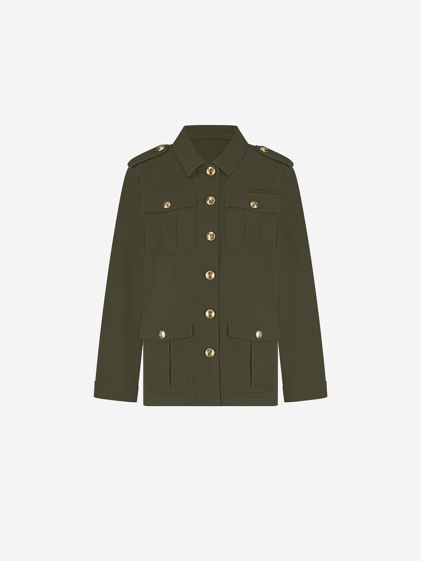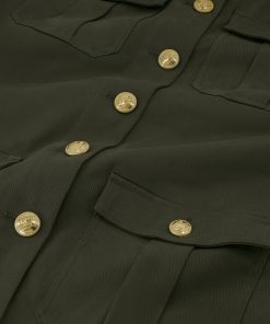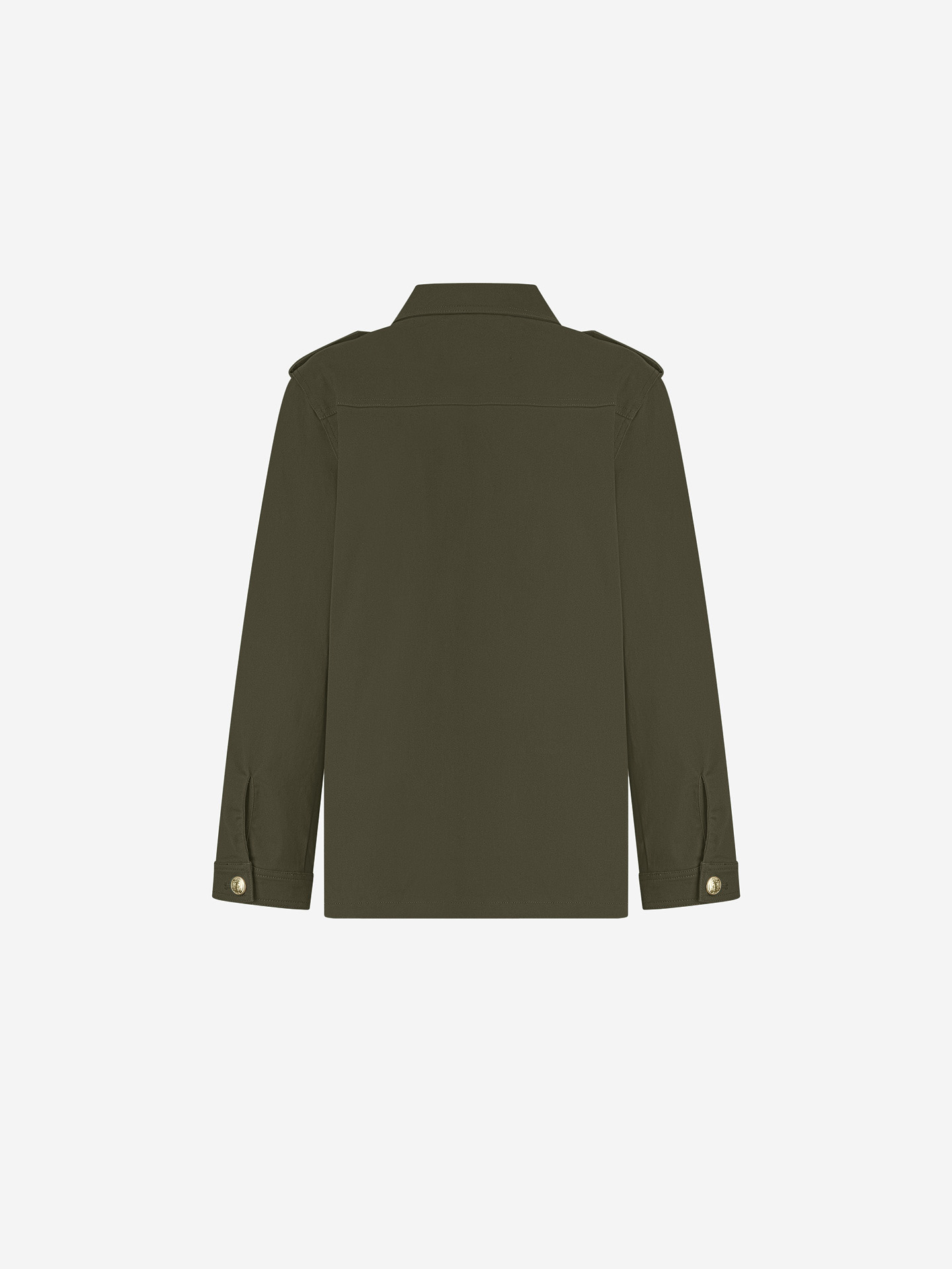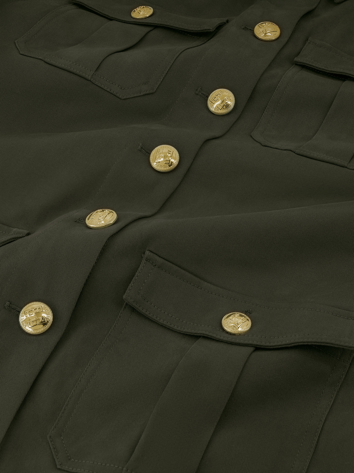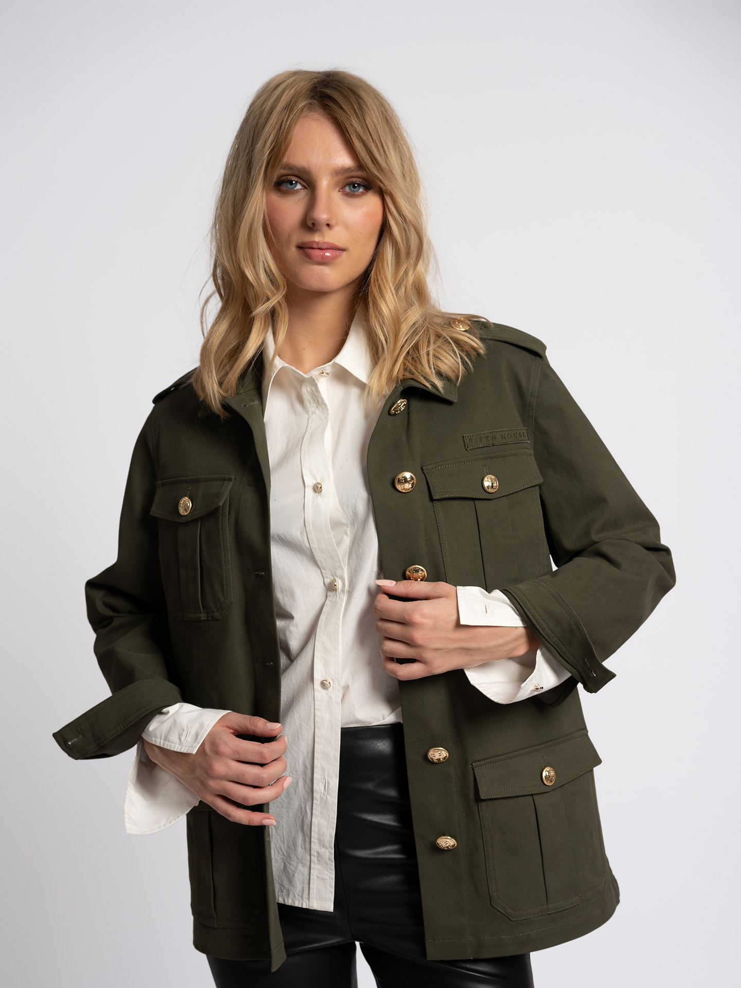 Product descriptionLoose-fitting jacket with a collar, a button closure with an engraved logo, and multiple flap pockets. The jacket features button details on the shoulders and an embroidered logo.