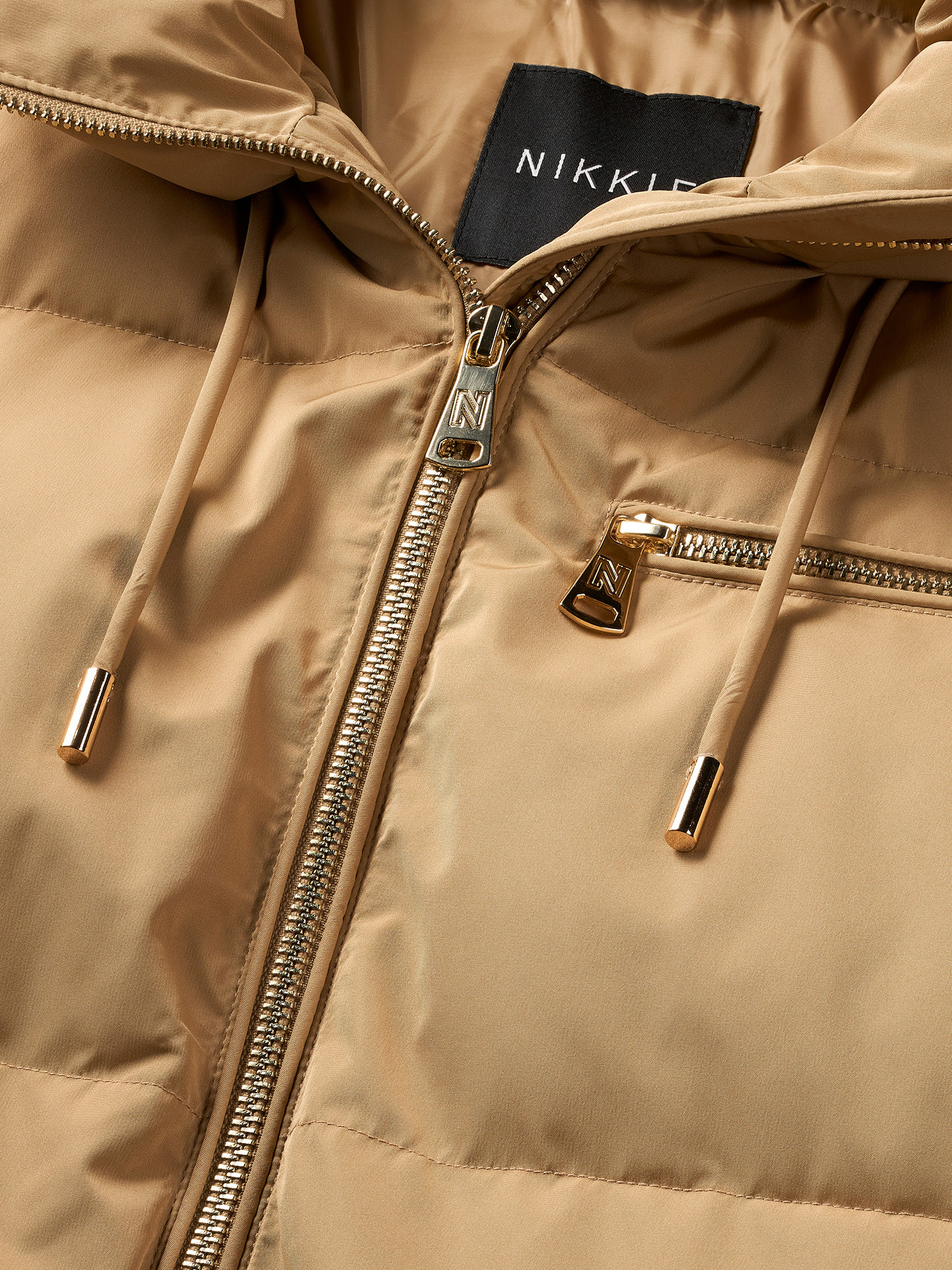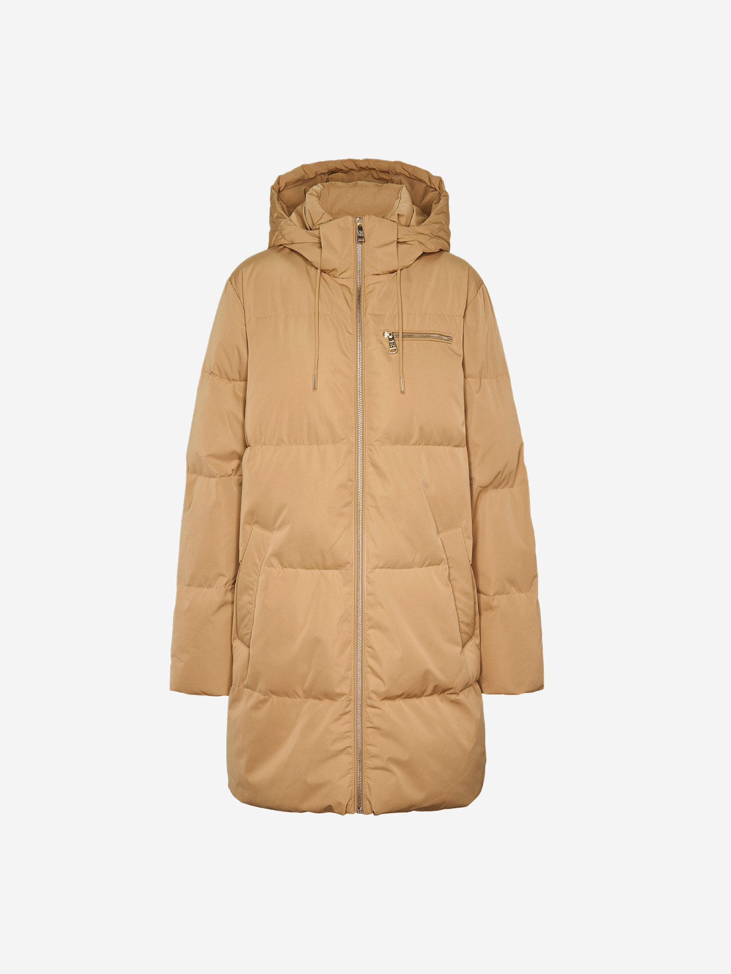Product descriptionMid-length, quilted puffer jacket with a hood with drawstrings, a zipper closure, and two large slit pockets. The jacket features a zippered chest pocket and a loose fit.