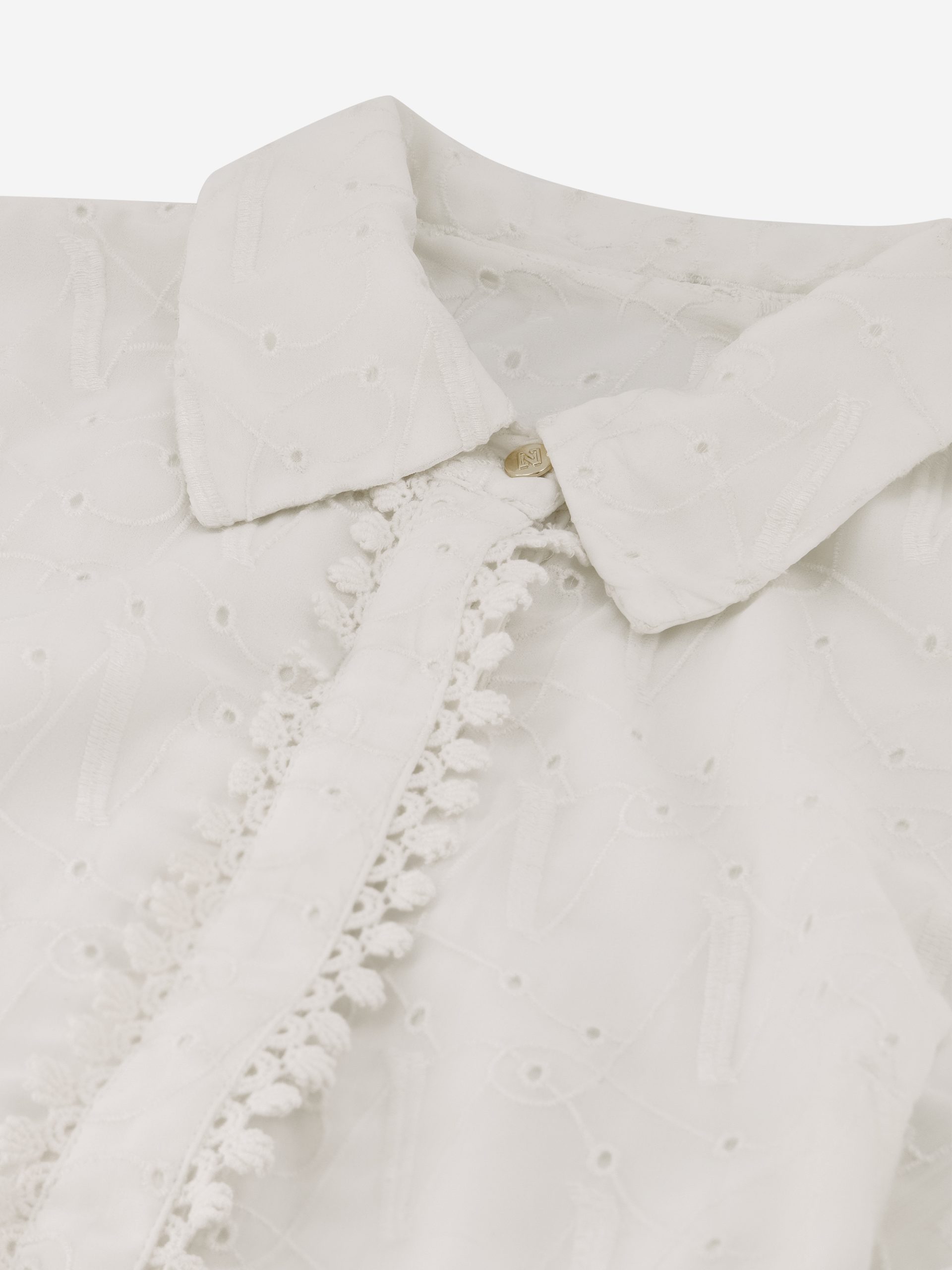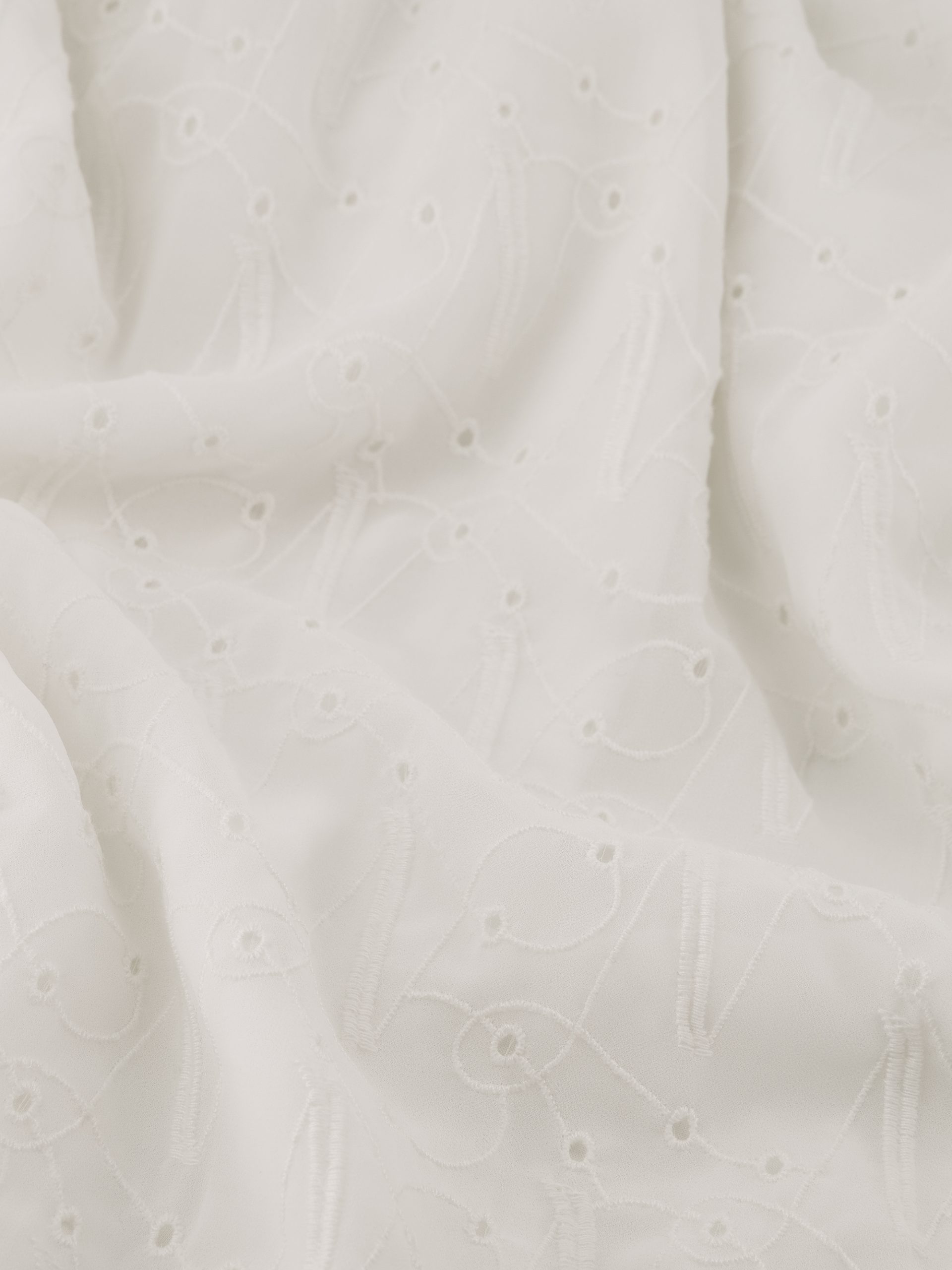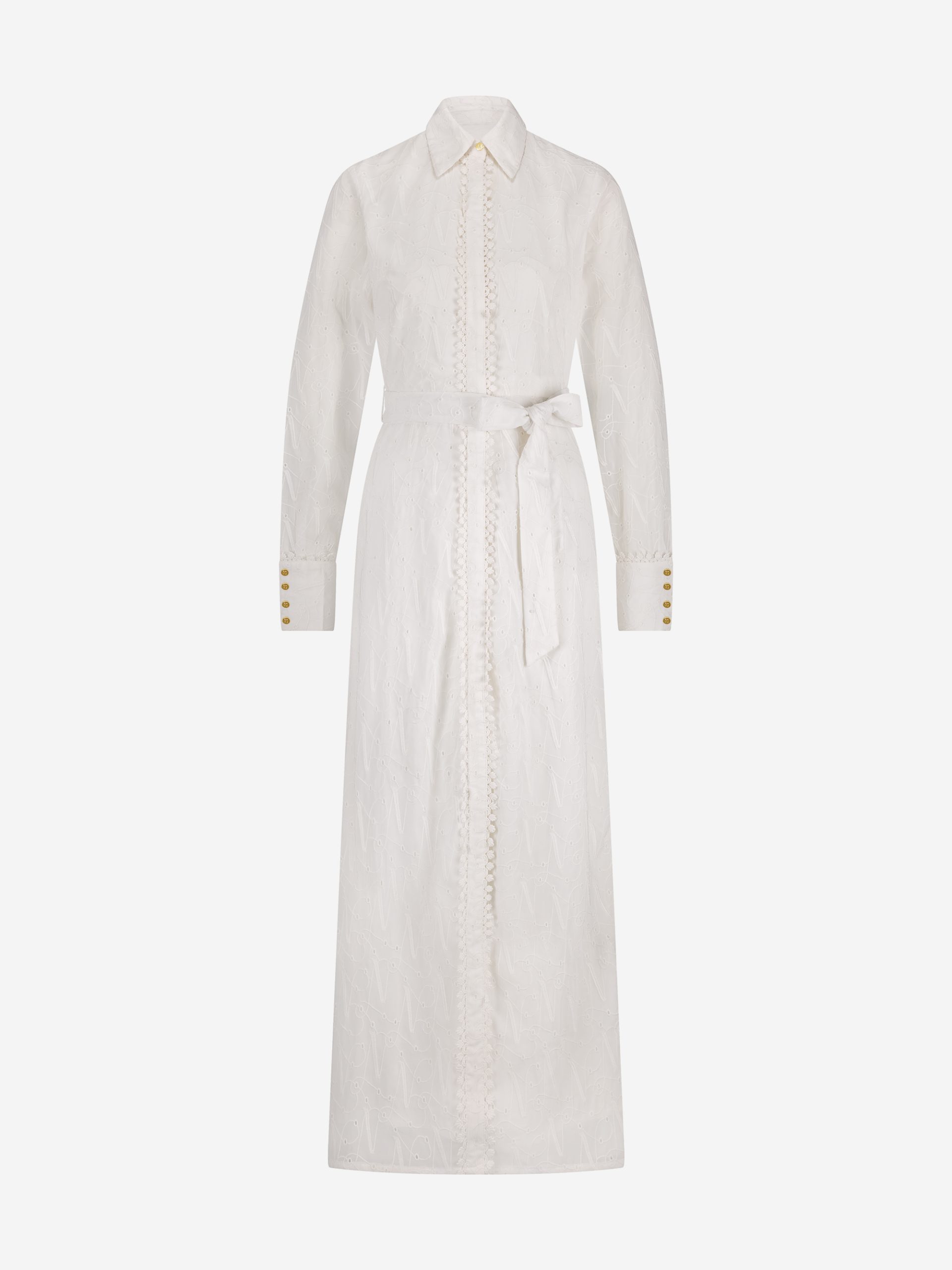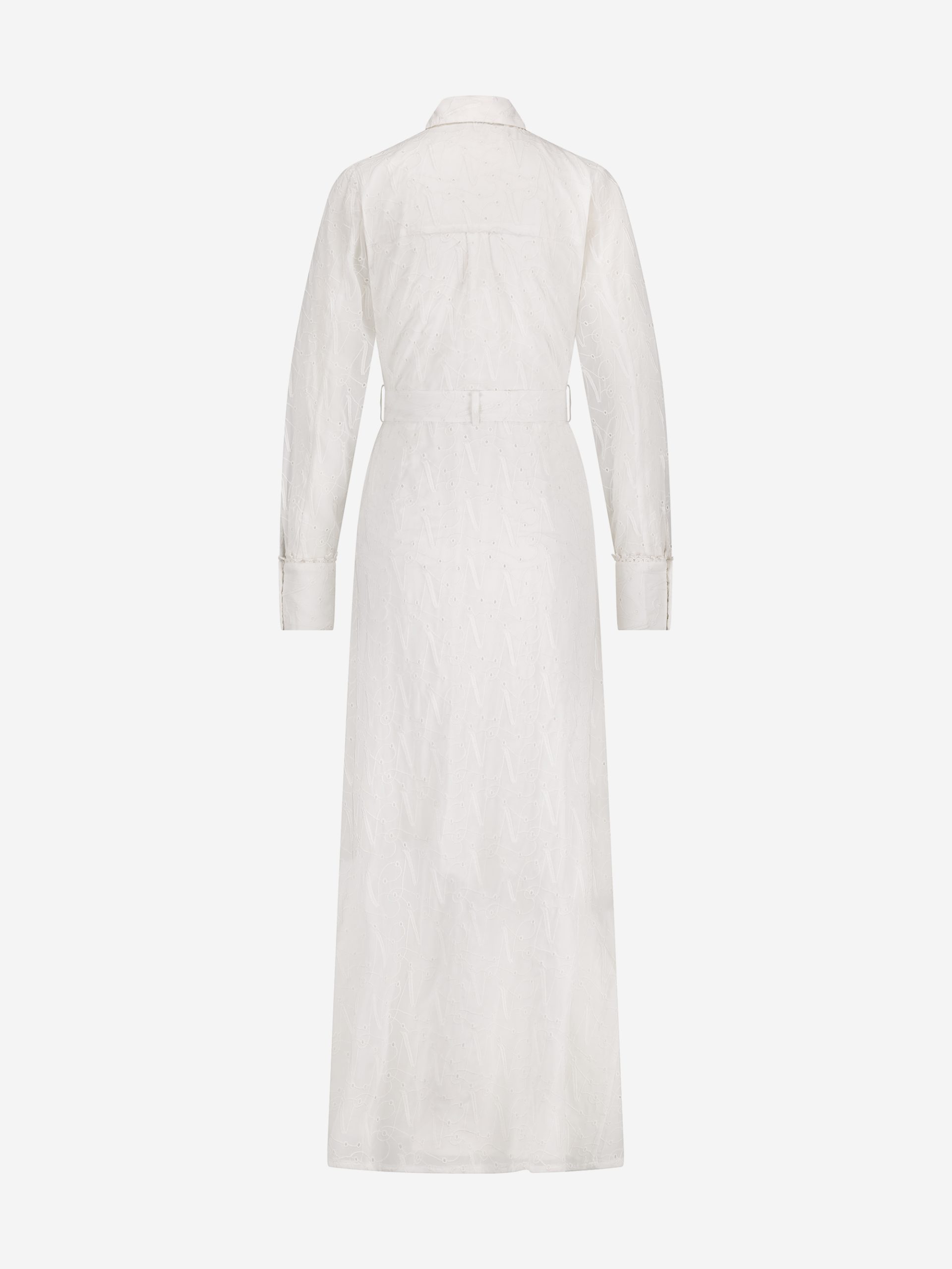 Product descriptionLong blouse dress in broderie anglaise with a tie belt and a collar. The maxi dress has a regular fit and a button closure.