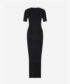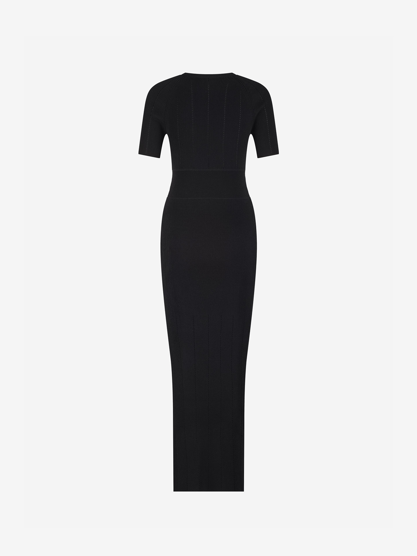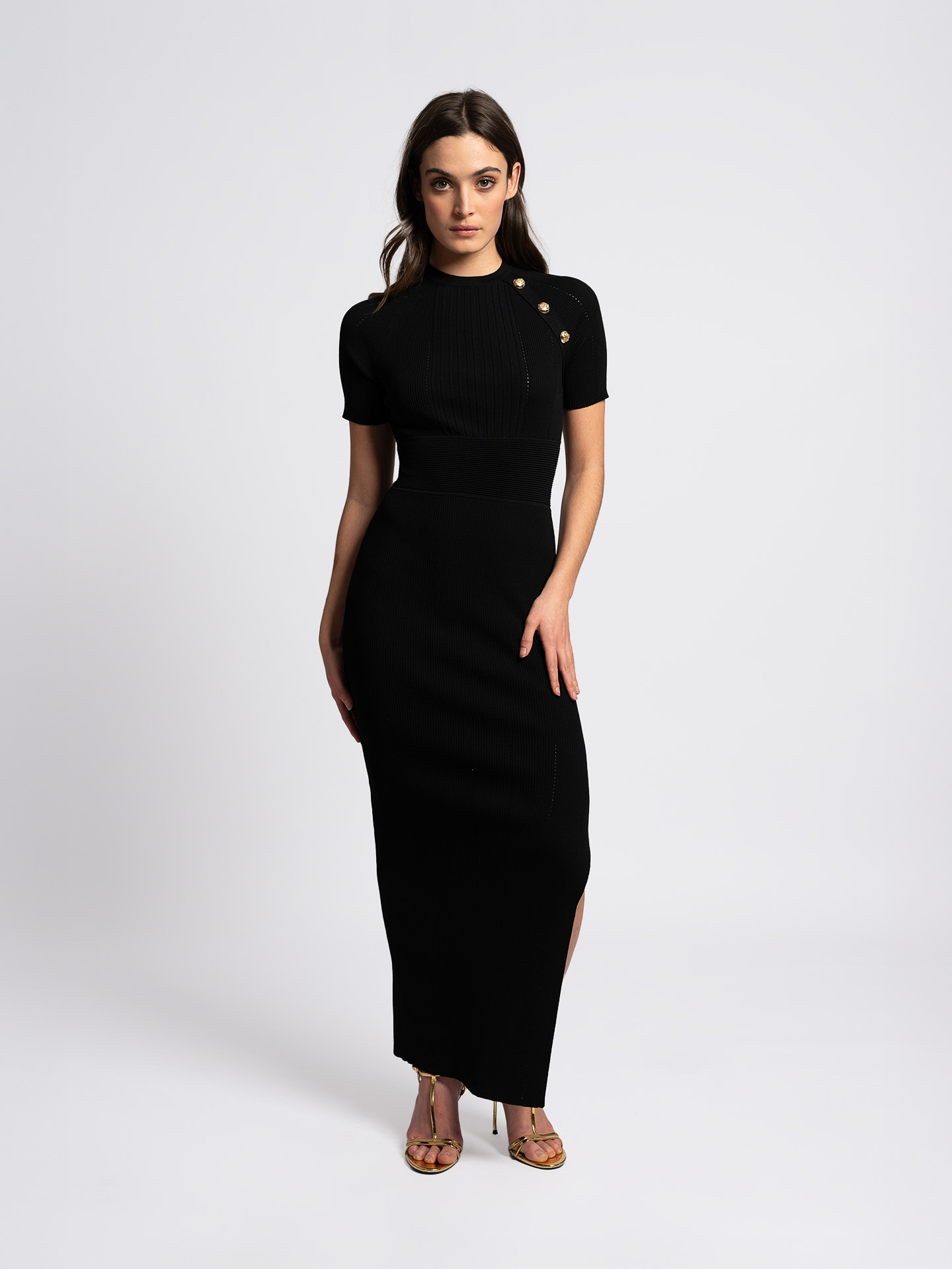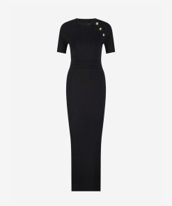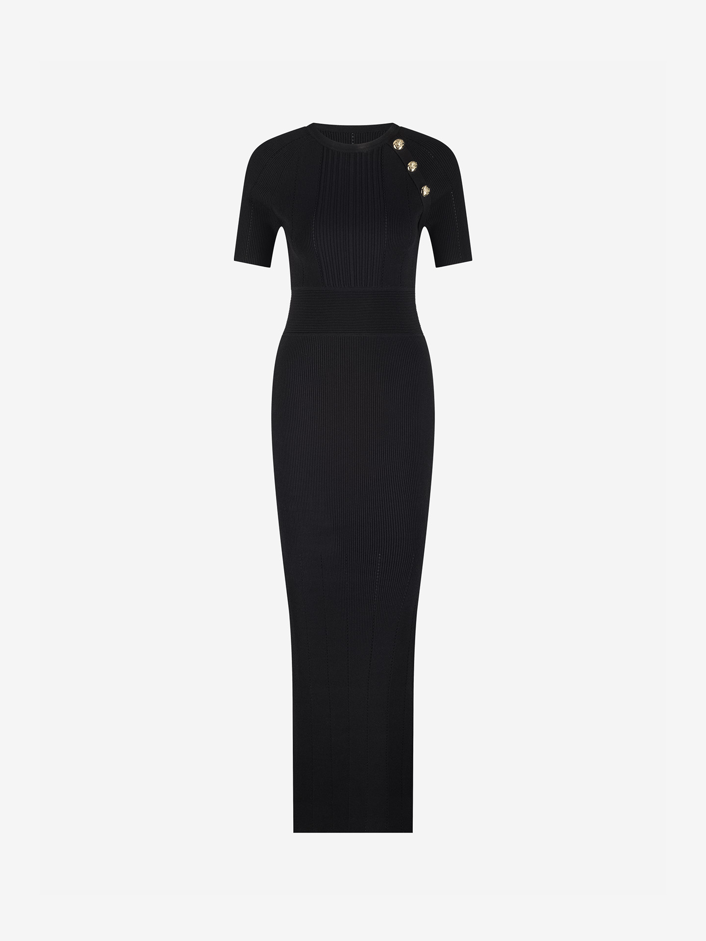 Product descriptionKnitted maxi dress with a vertical ribbed texture, a round neckline, and button details. The dress has short sleeves and a regular fit.