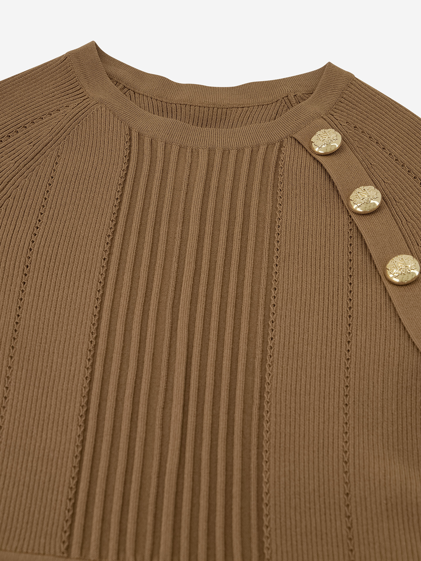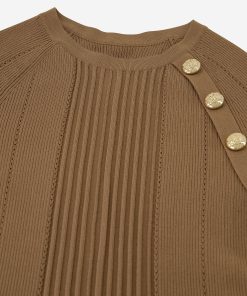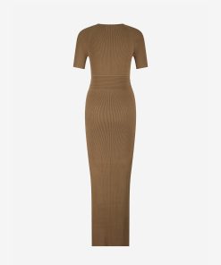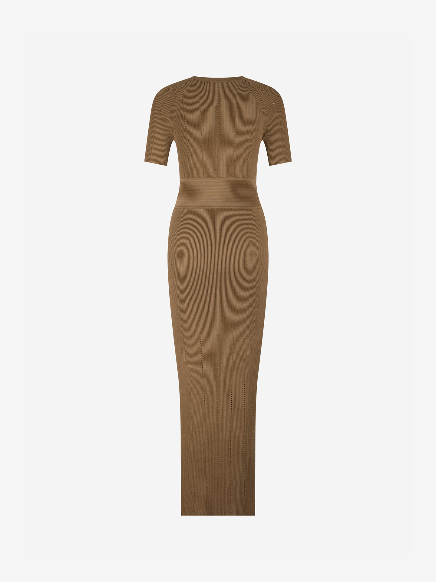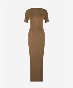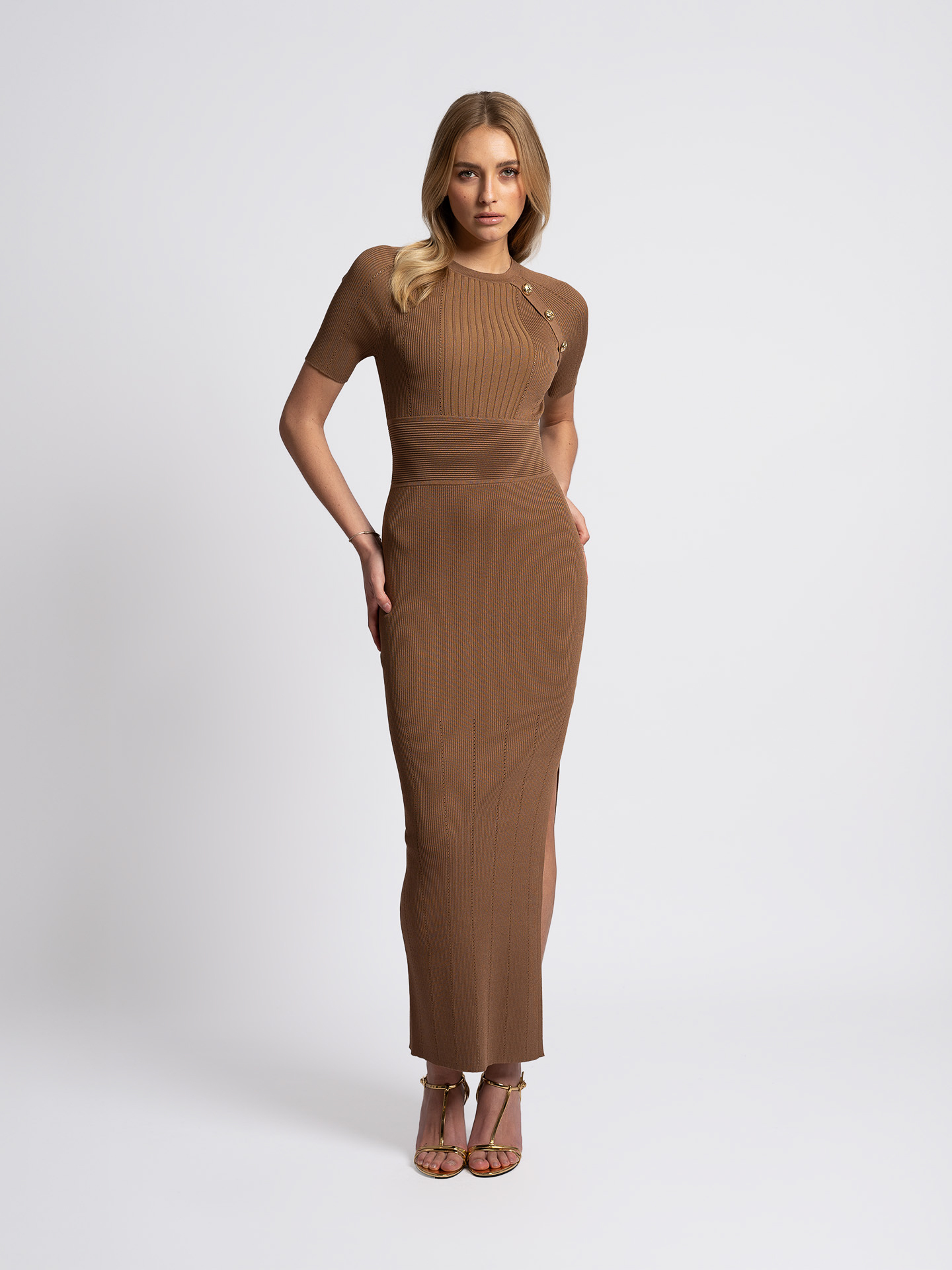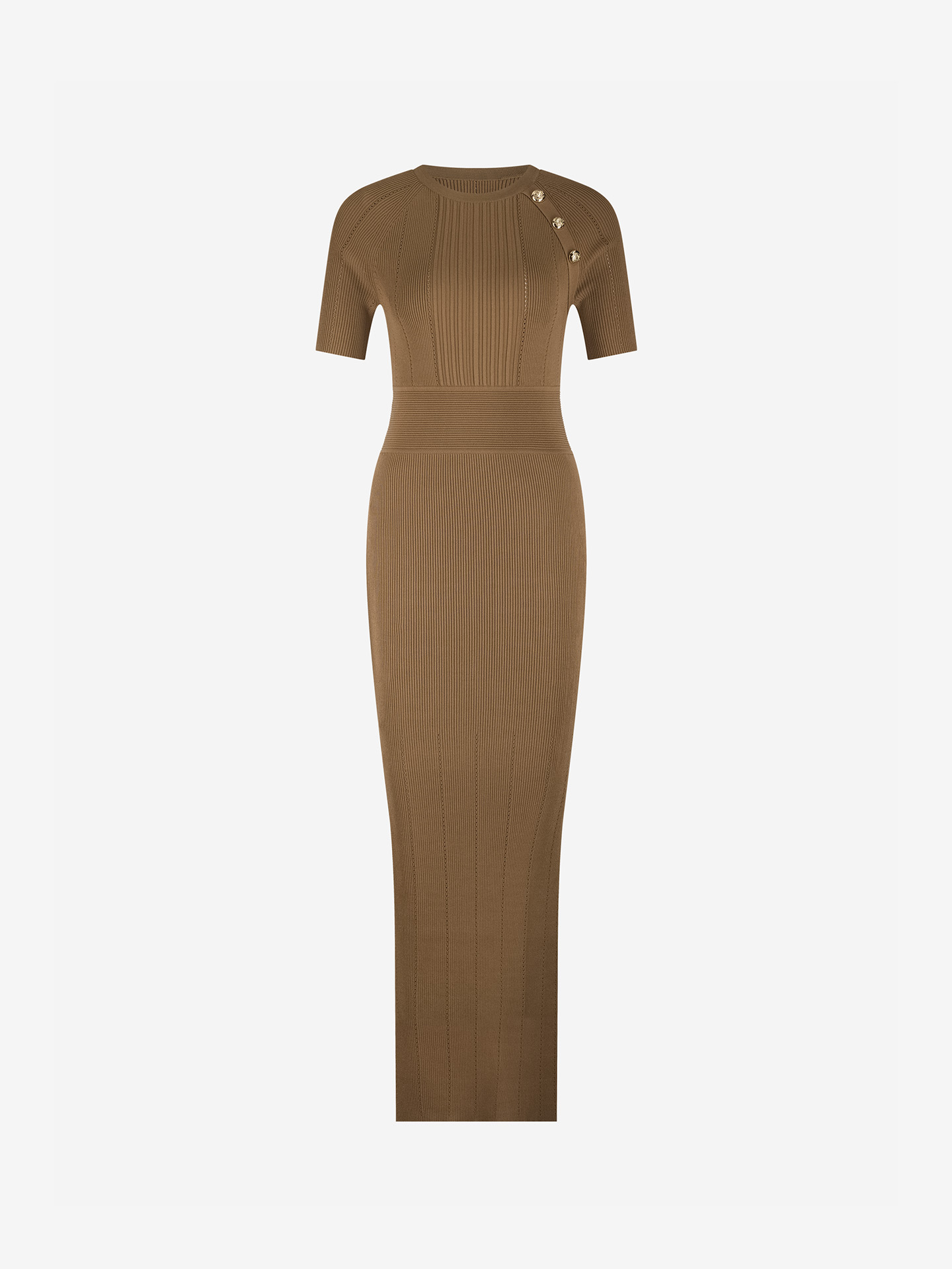 Product descriptionKnitted maxi dress with a vertical ribbed texture, a round neckline, and button details. The dress has short sleeves and a regular fit.