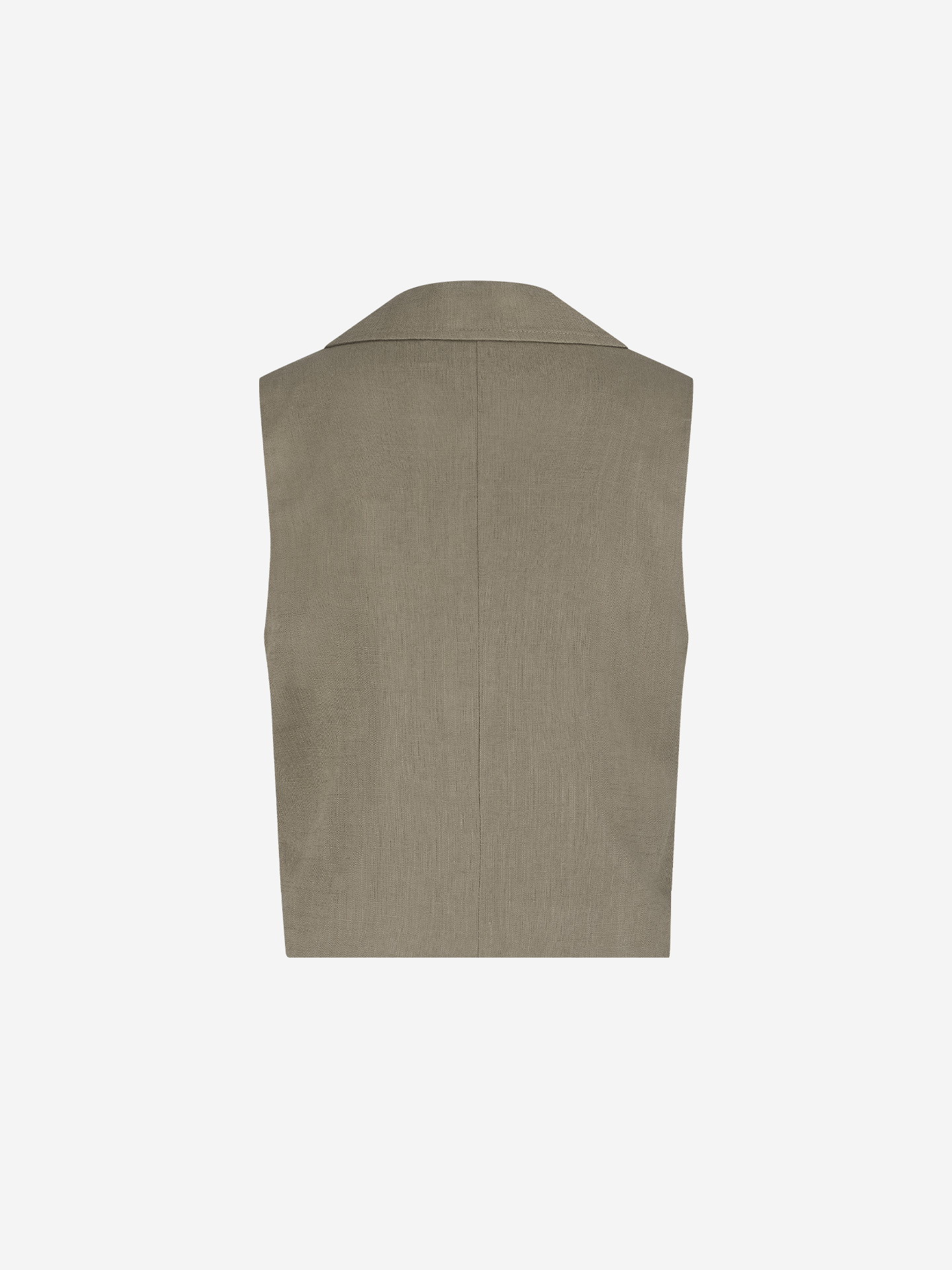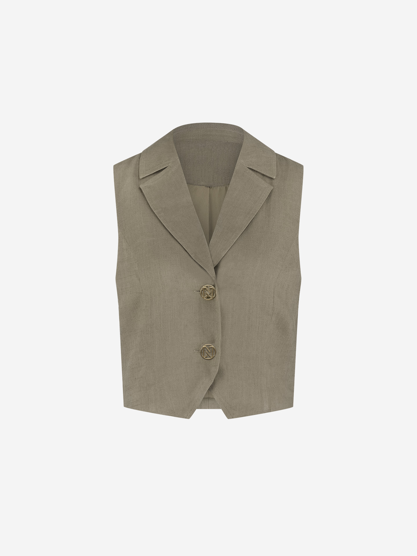 Product descriptionCropped waistcoat with a mixed texture, V-neck, classic collar and a closure with decorative N-buttons.