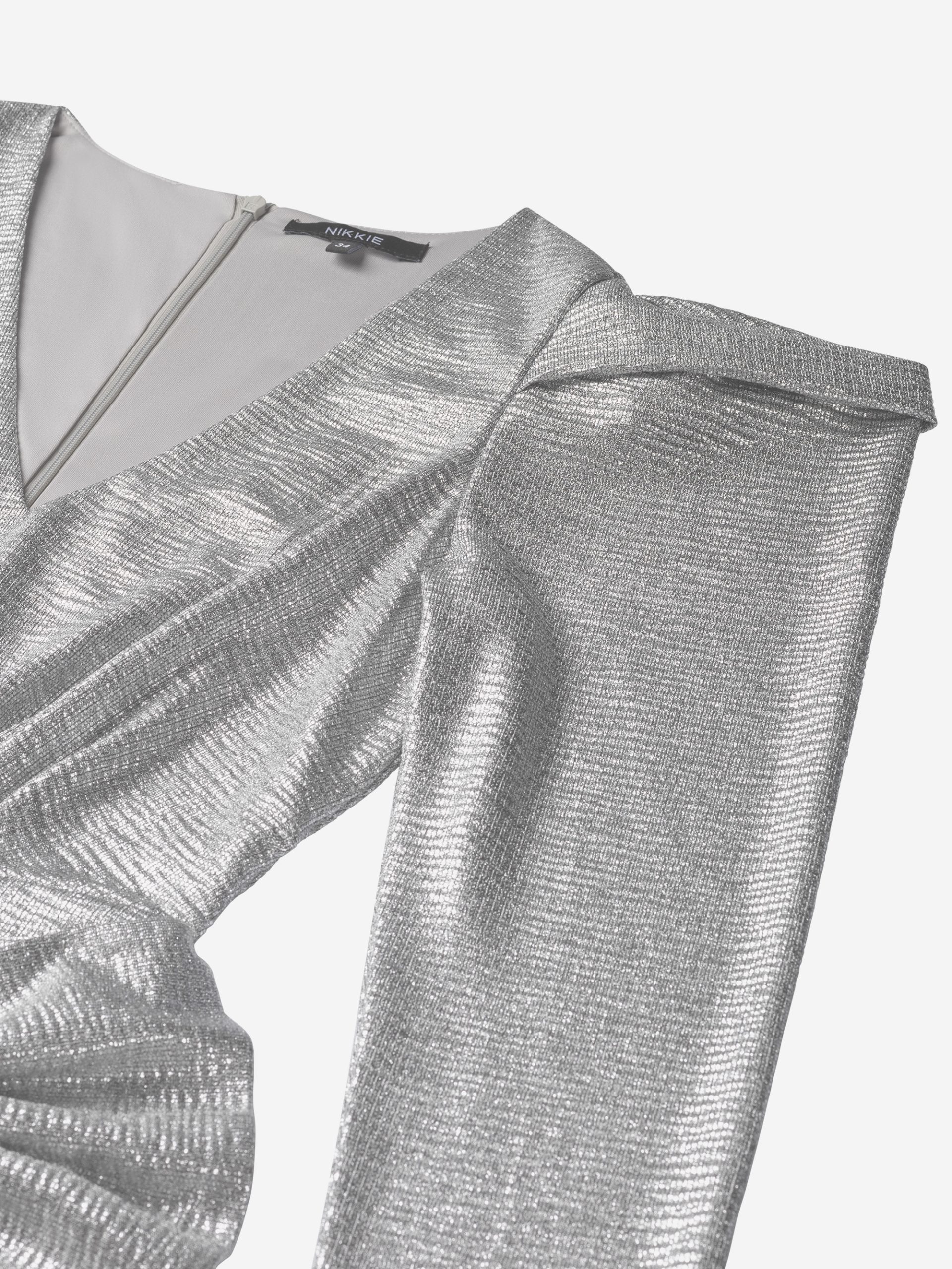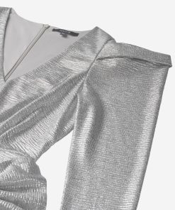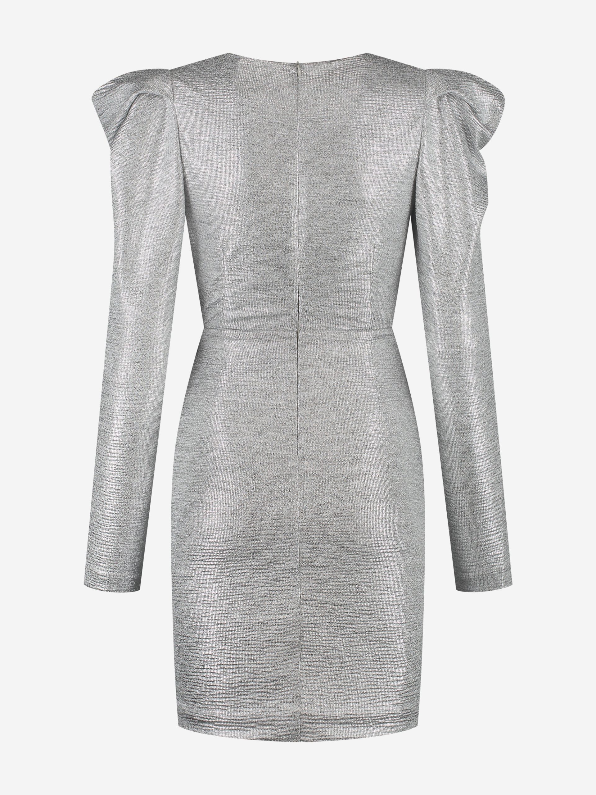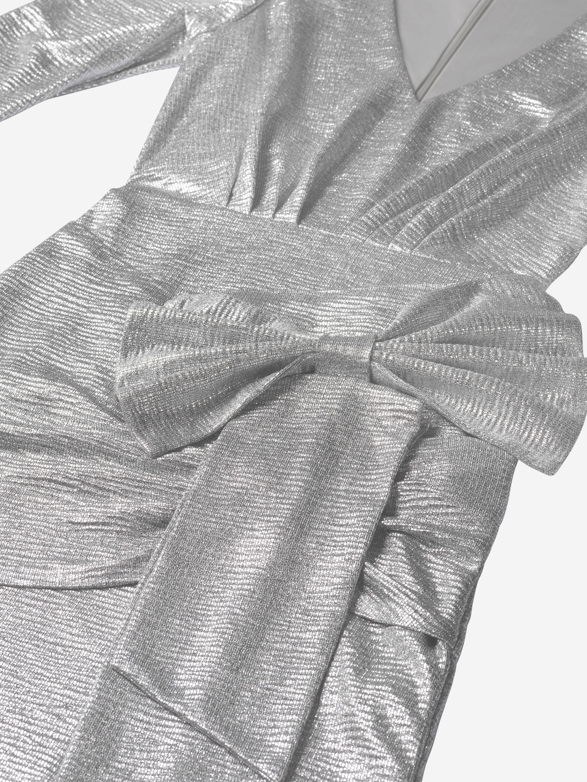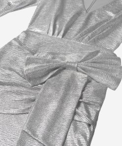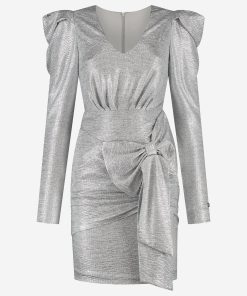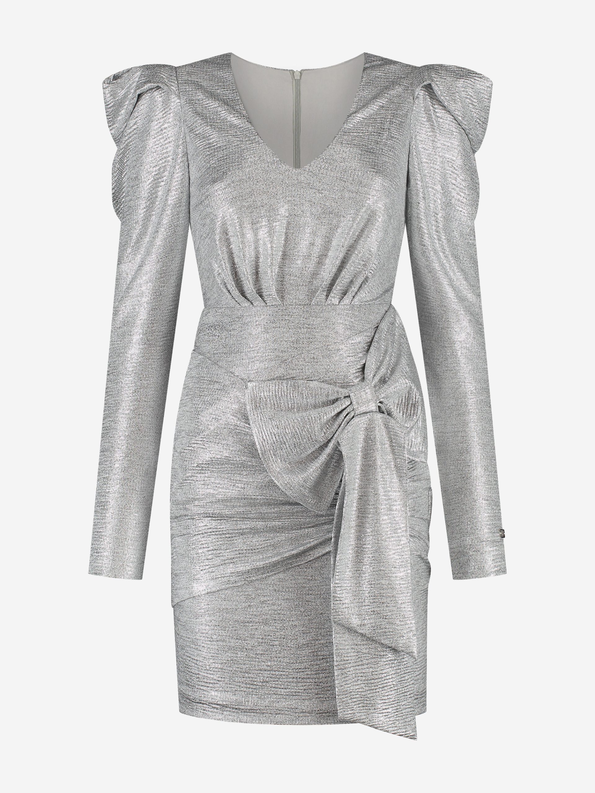 Product descriptionFitted metallic dress with puff sleeves and a large bow detail, which is attached. The dress has a low V-neck, a concealed zipper and lots of stretch.
