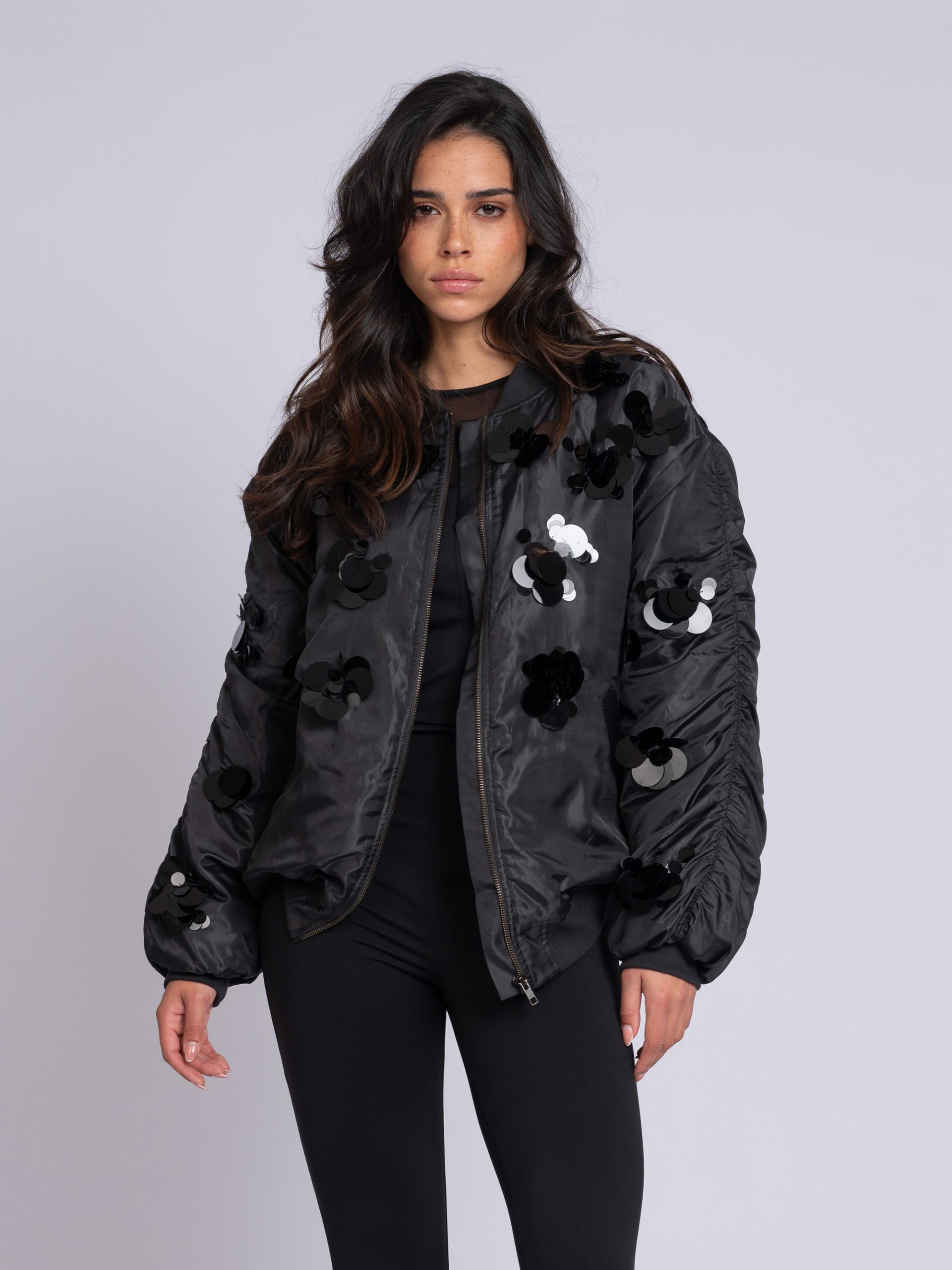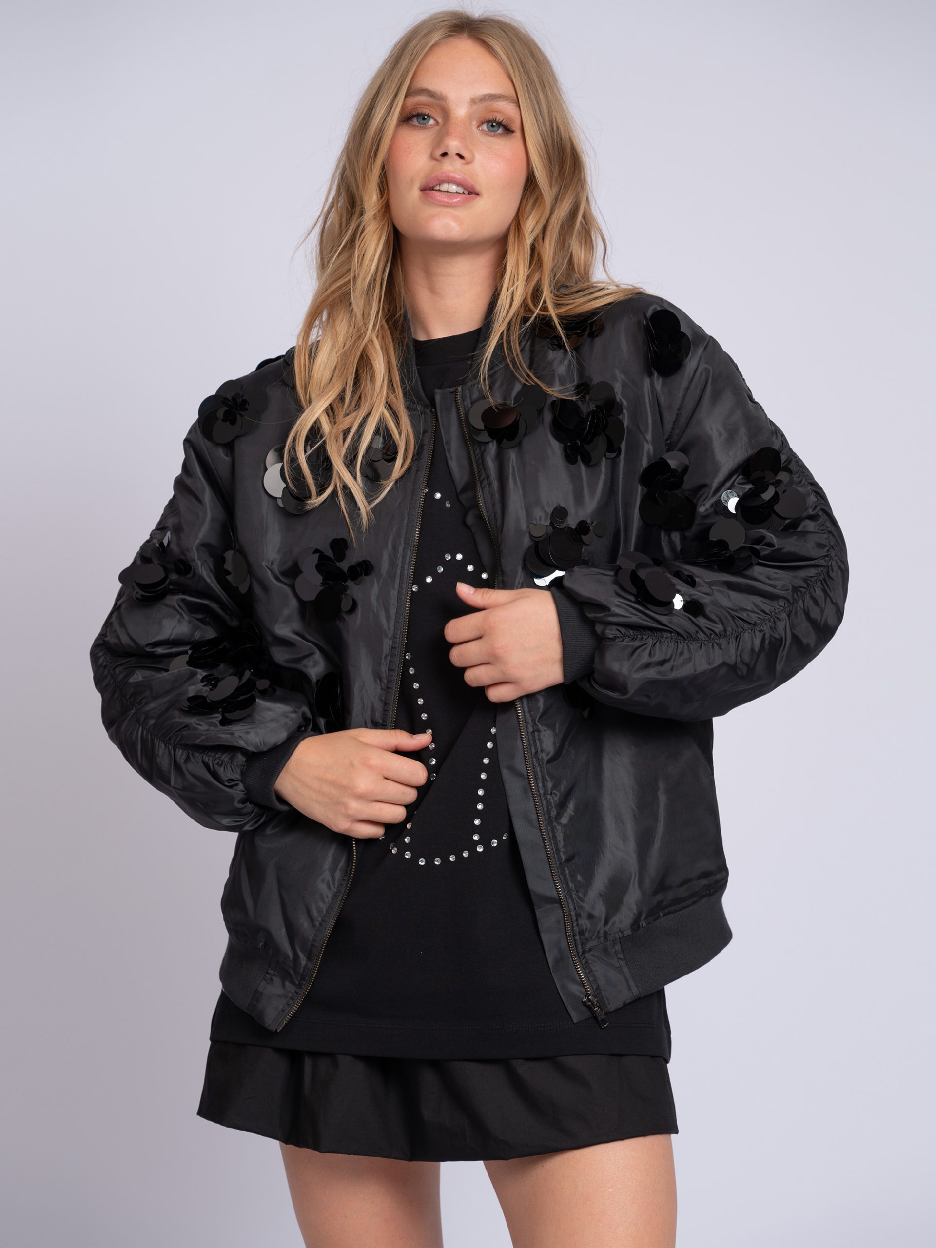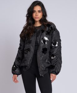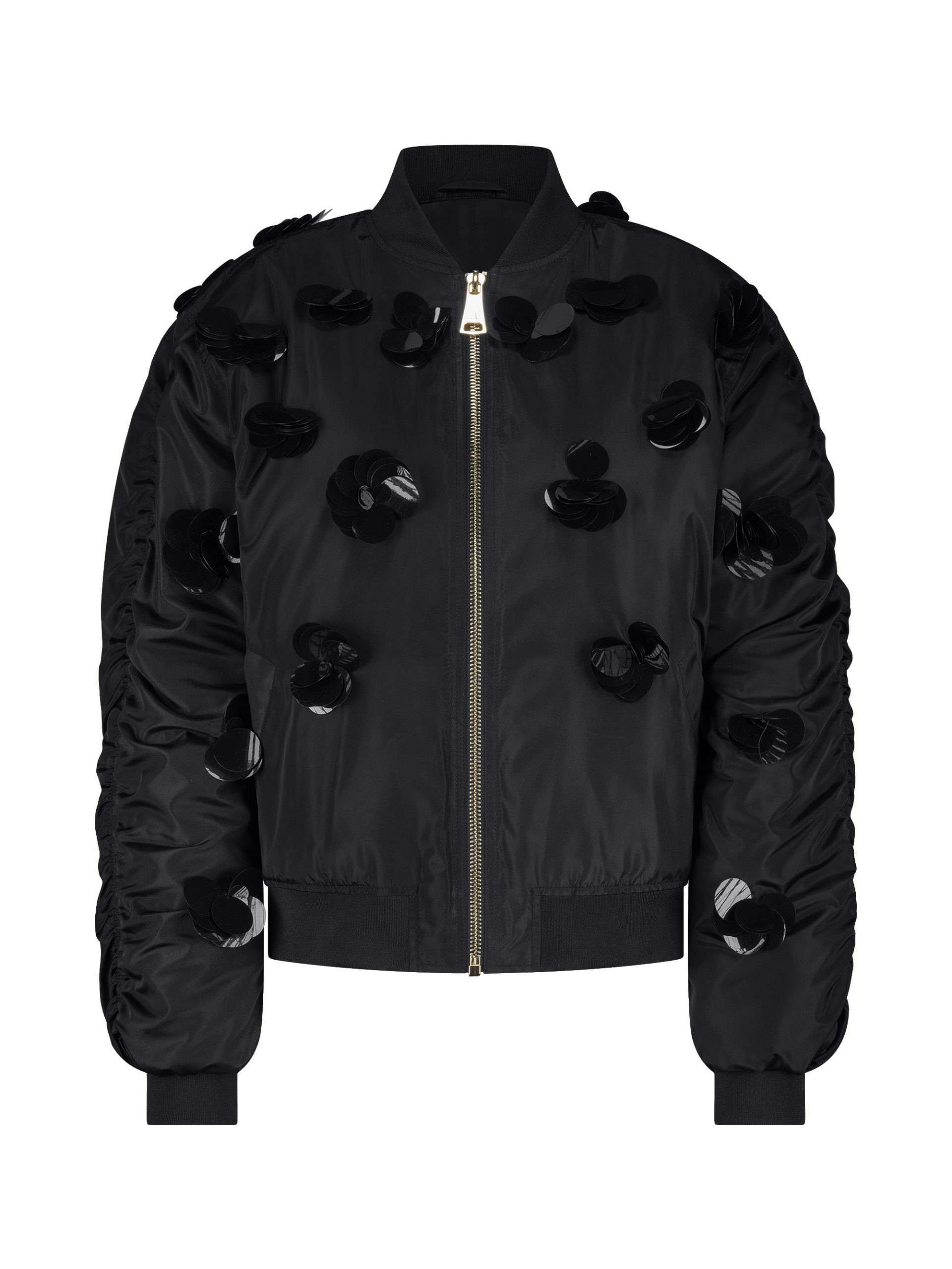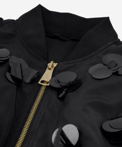 Product descriptionBomber jacket with decorative sequins in flower shapes, pleated sleeves and a ribbed collar. The jacket has a shiny, lightly padded fabric, finished with pockets and a zipper.