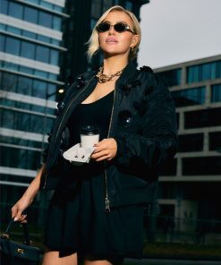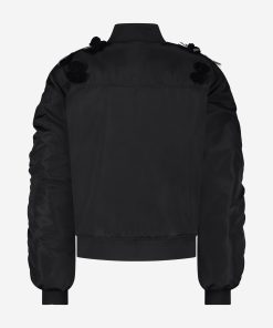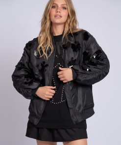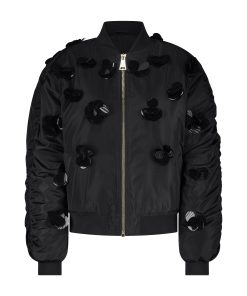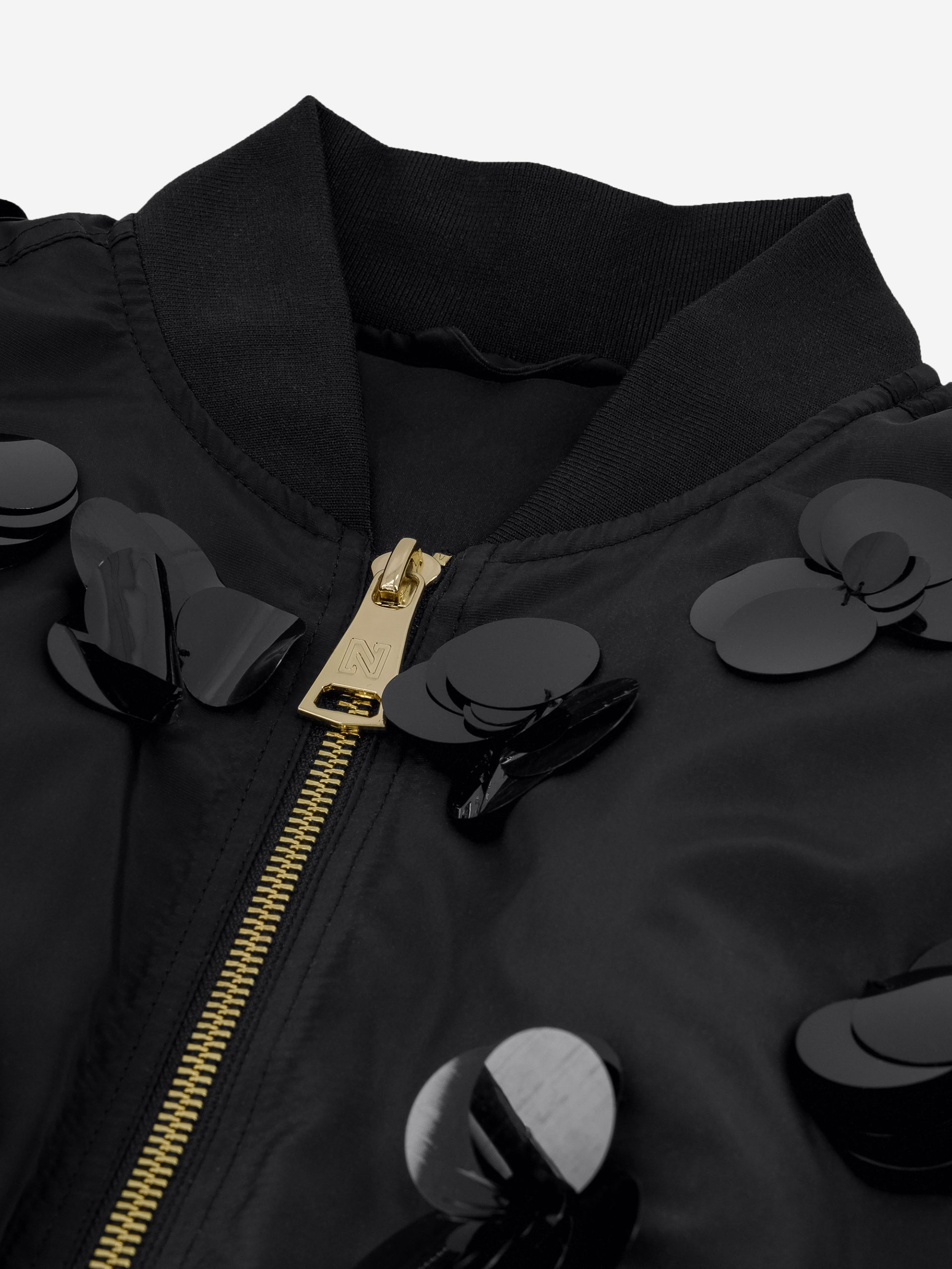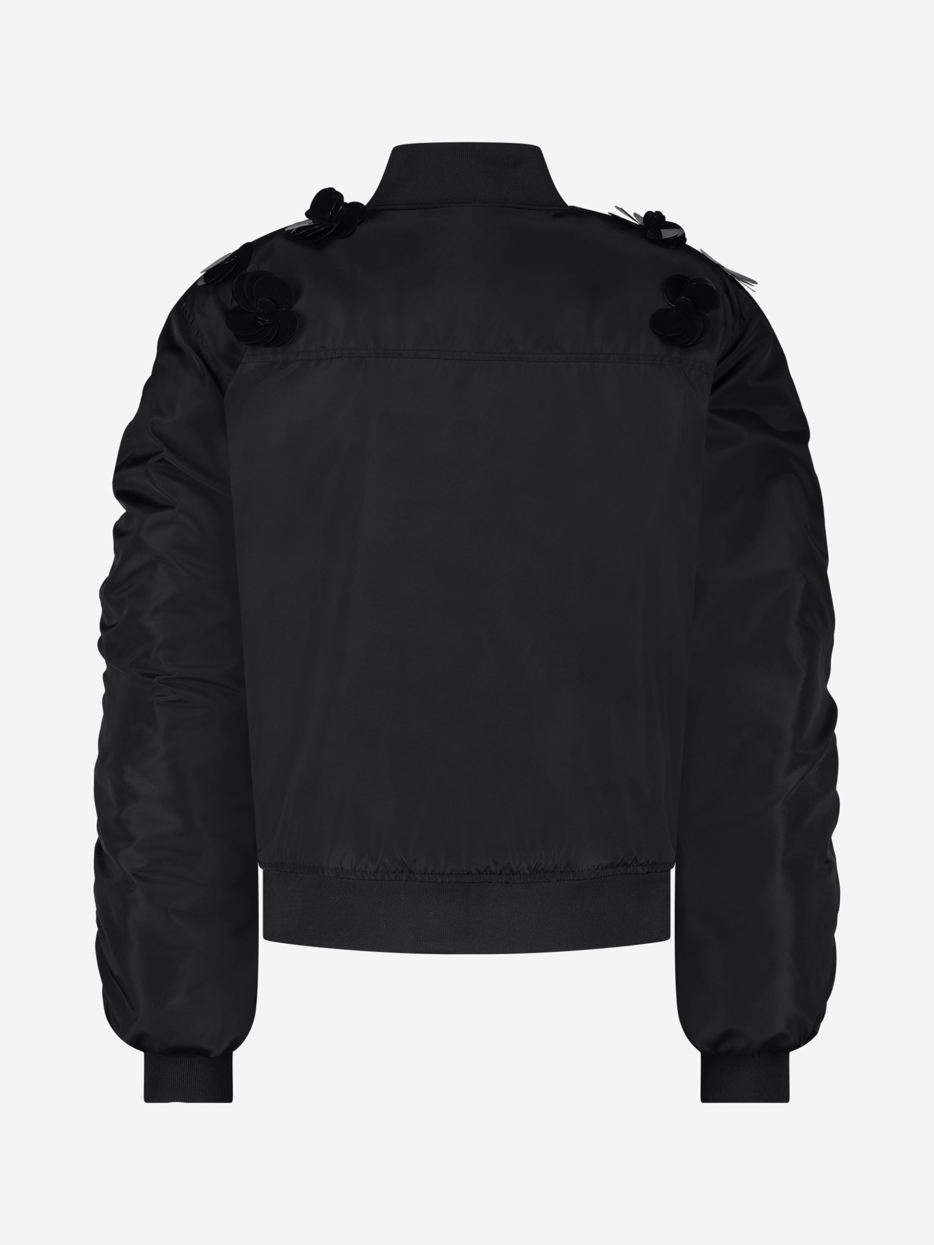 Product descriptionBomber jacket with decorative sequins in flower shapes, pleated sleeves and a ribbed collar. The jacket has a shiny, lightly padded fabric, finished with pockets and a zipper.