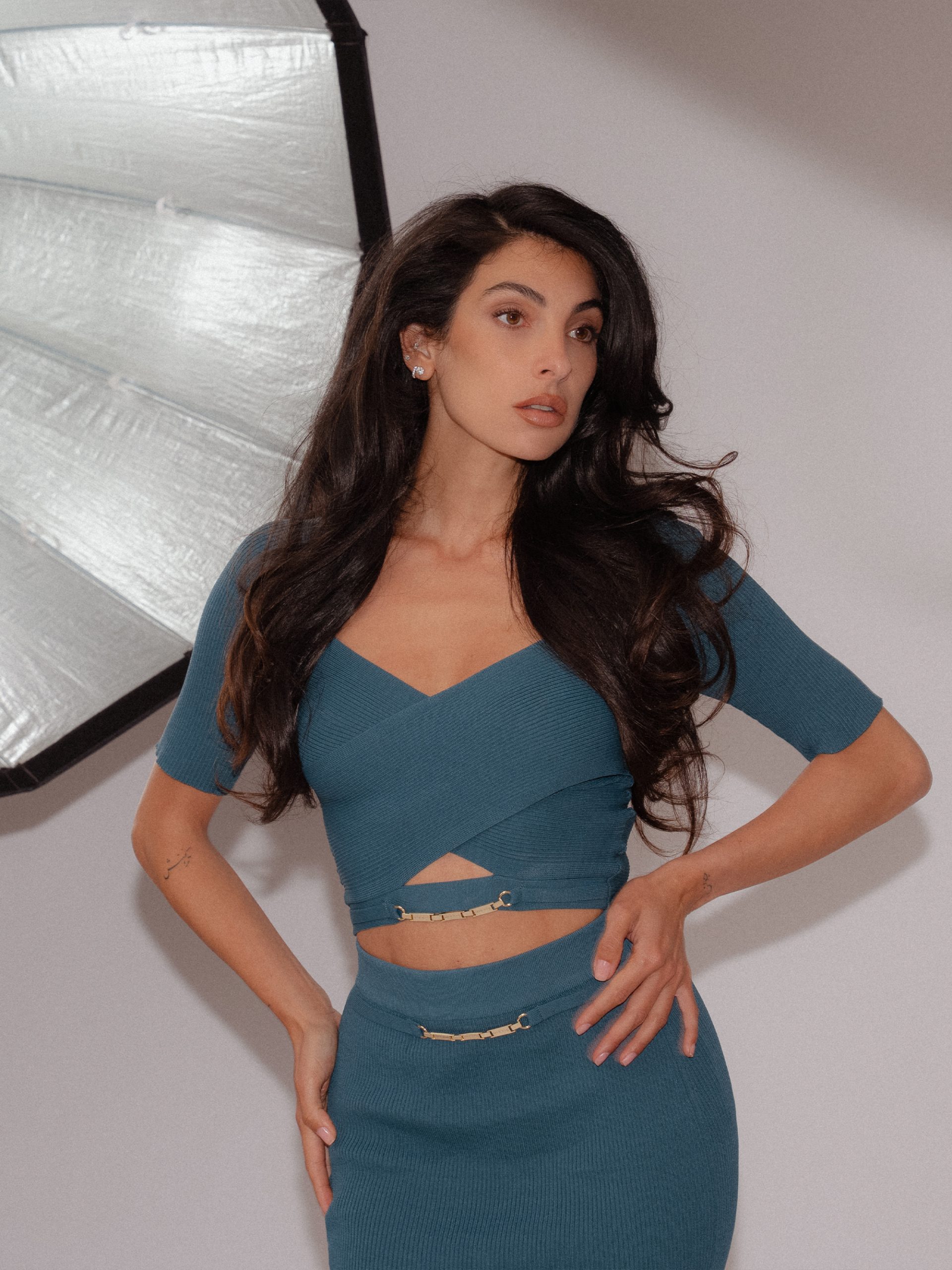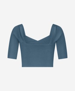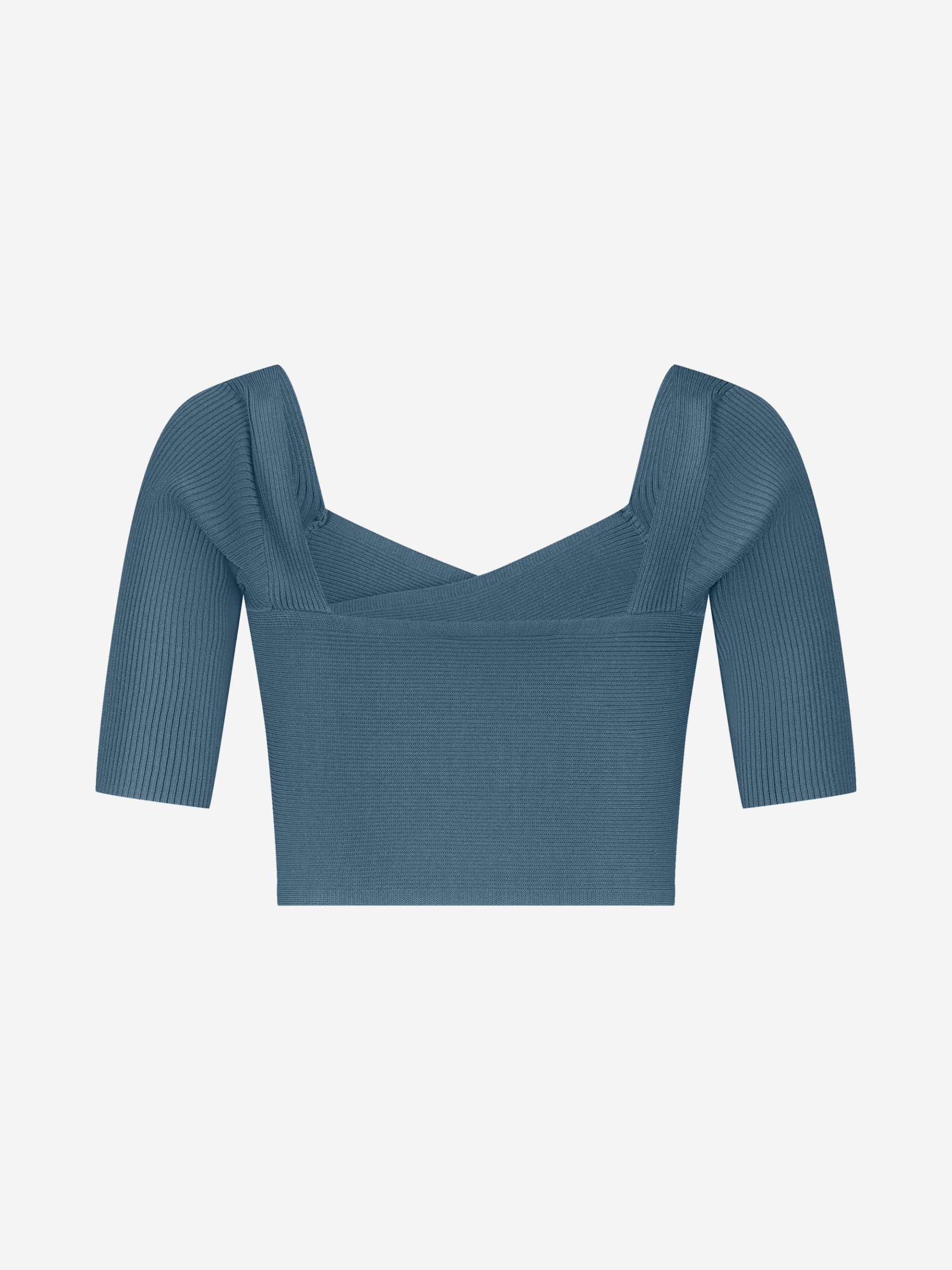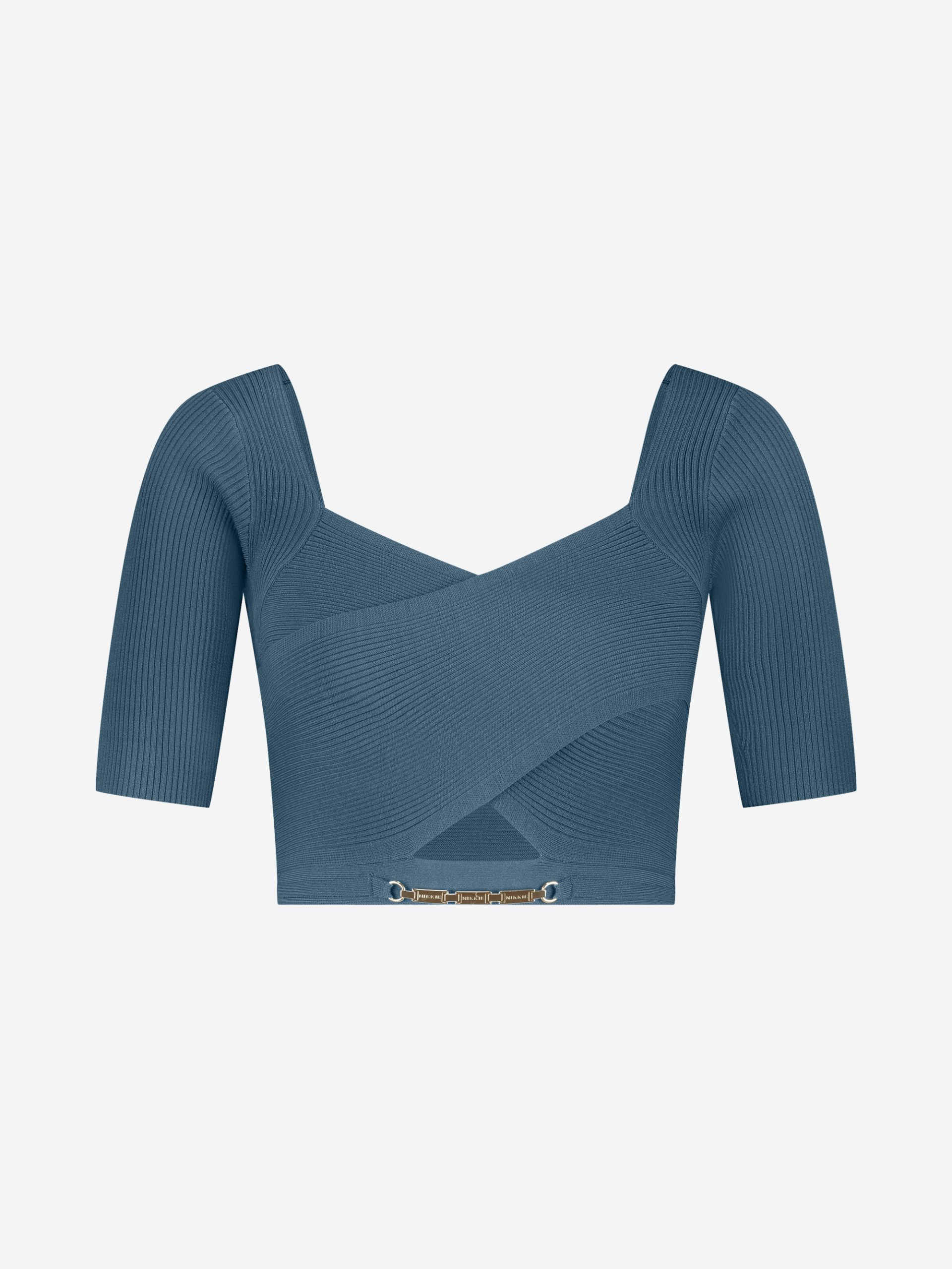 Product descriptionCropped ribbed top with a square neckline and crossover detail at the front. Featuring half-length sleeves, a fitted fit and a subtle gold-tone chain accent.