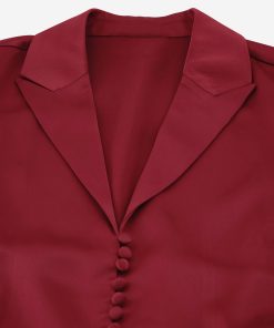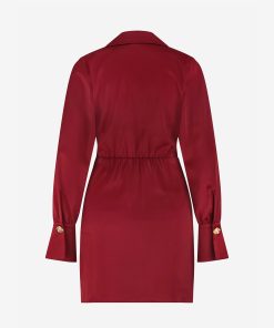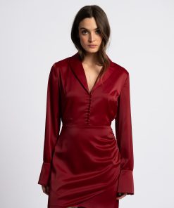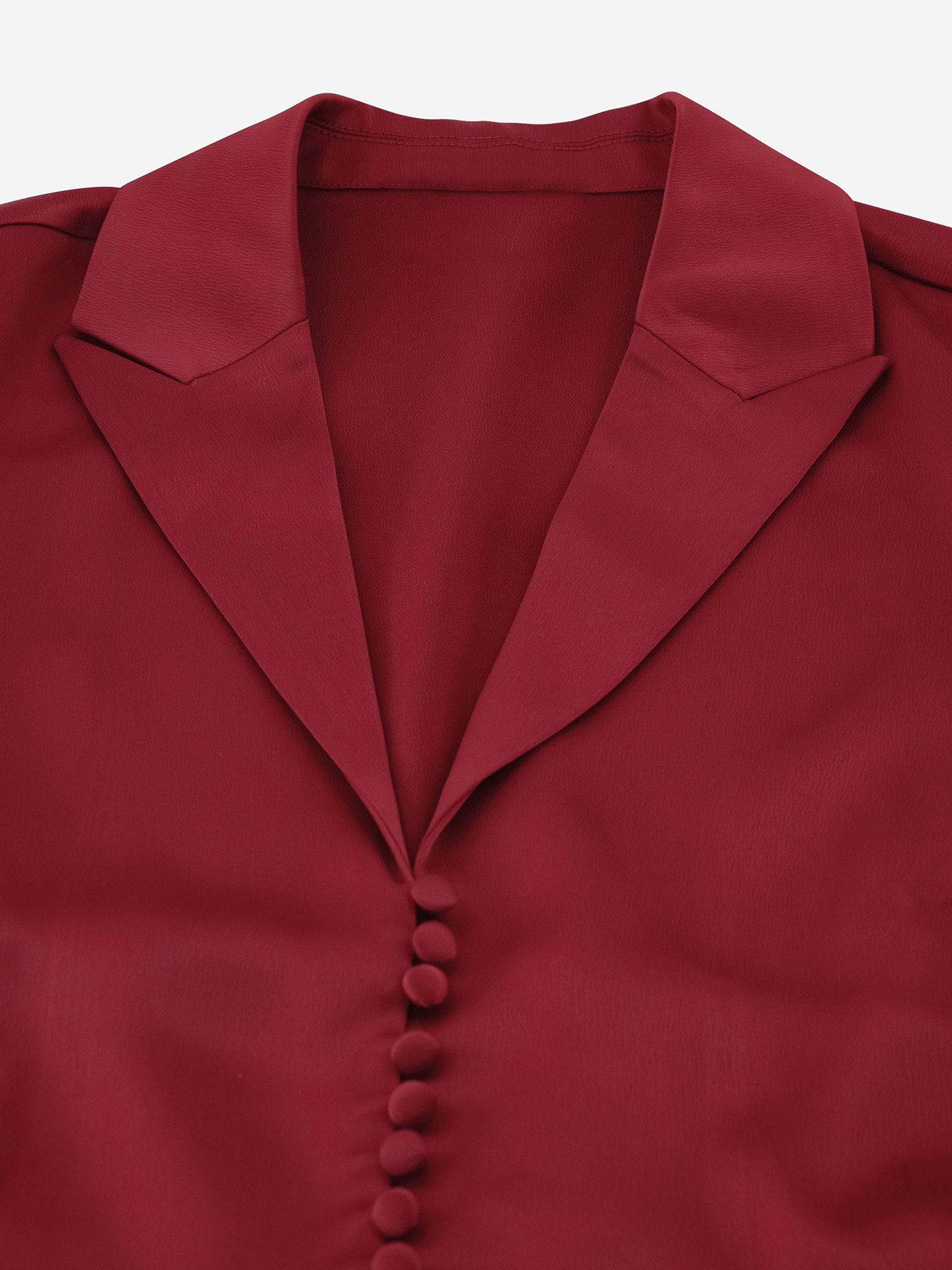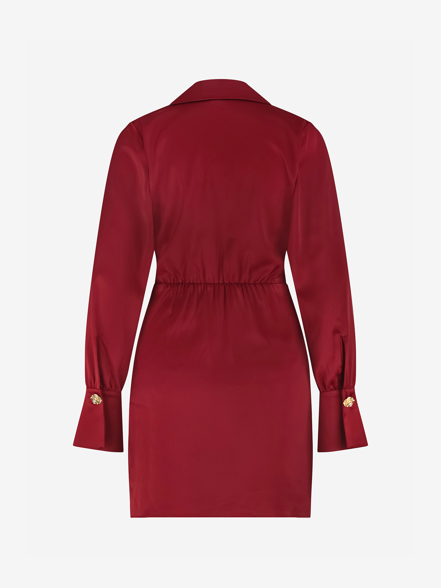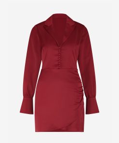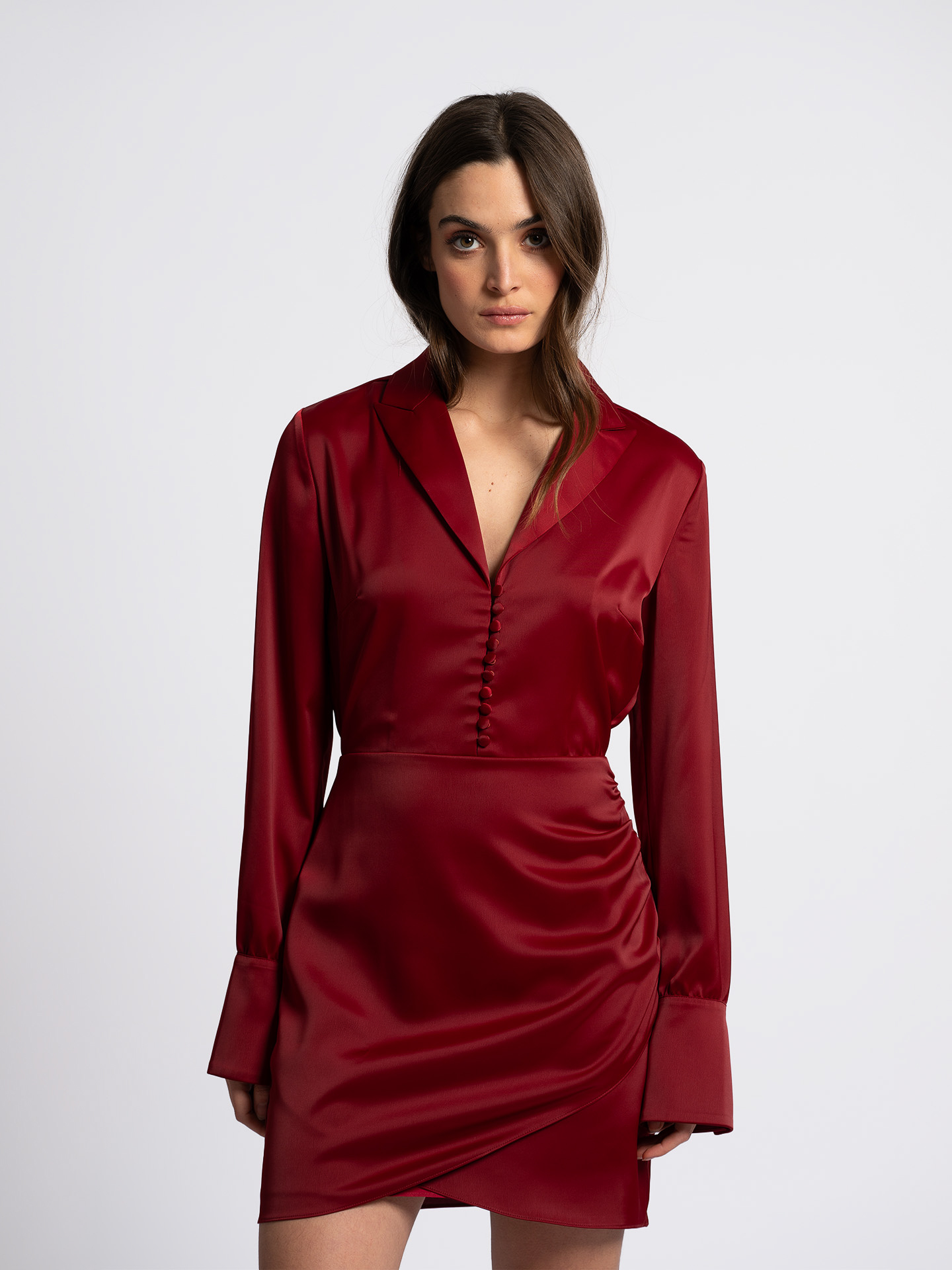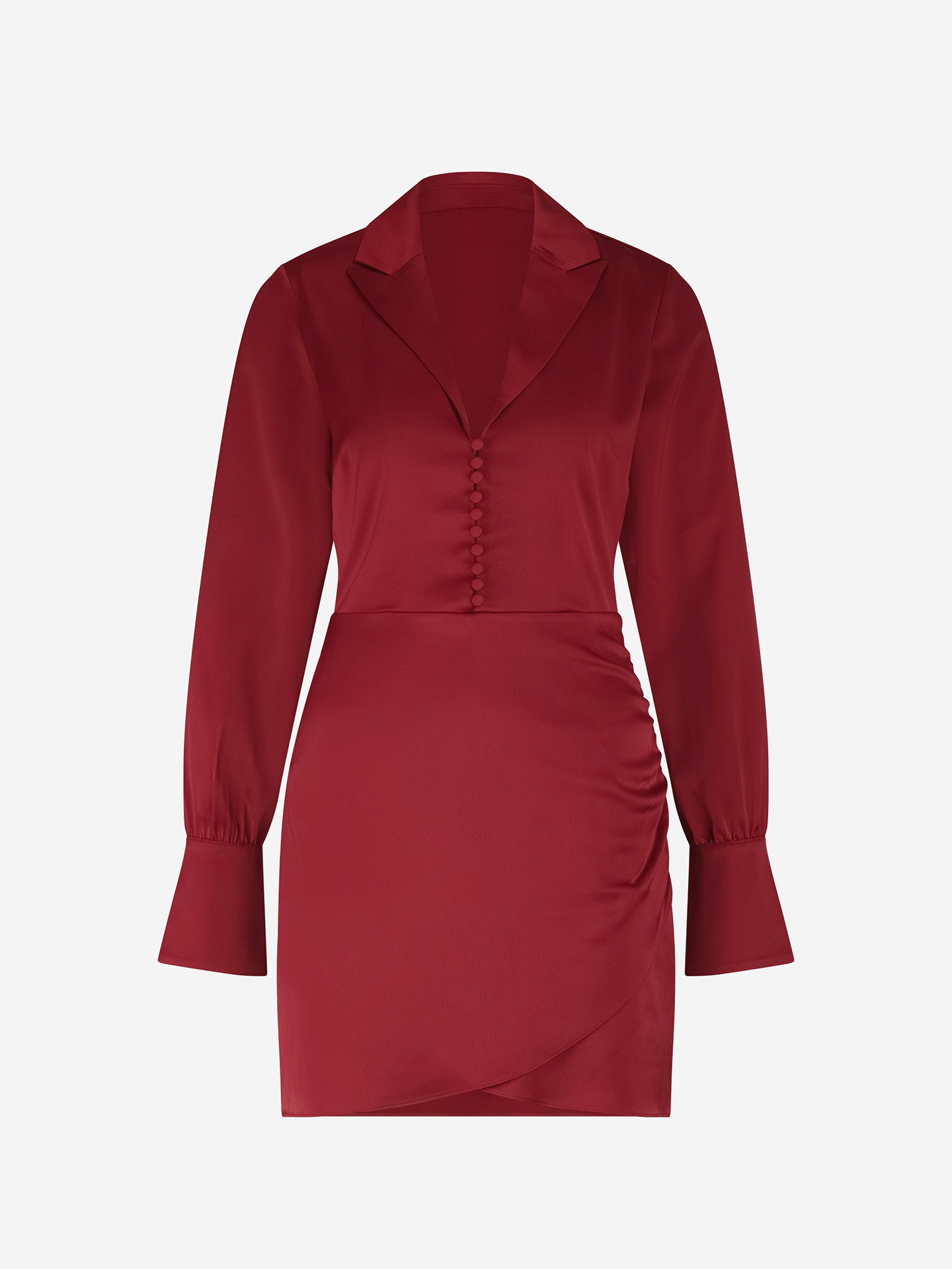 Satin dress with a lapel collar, asymmetric wrapover, and a fitted silhouette.