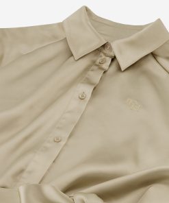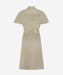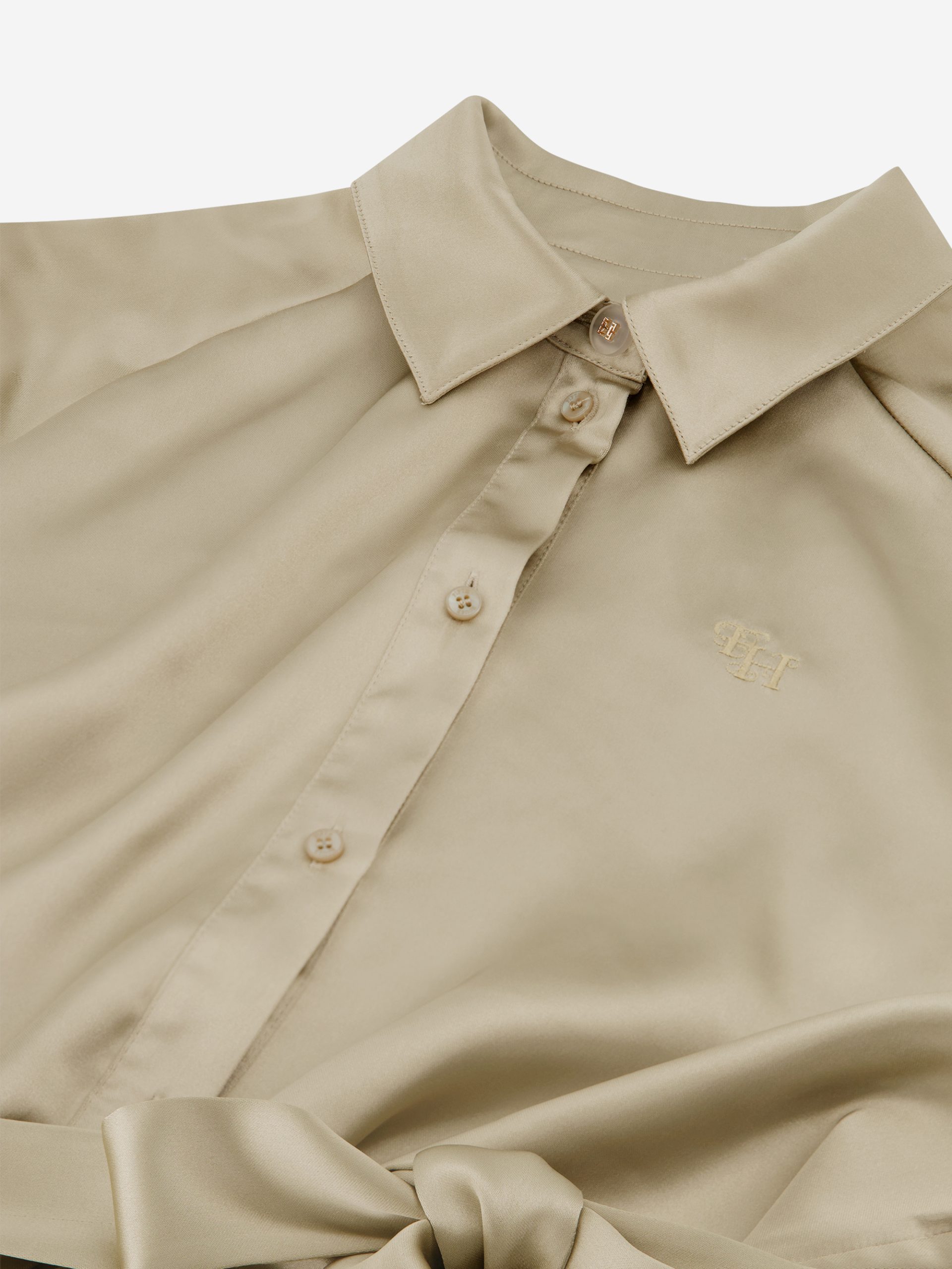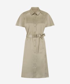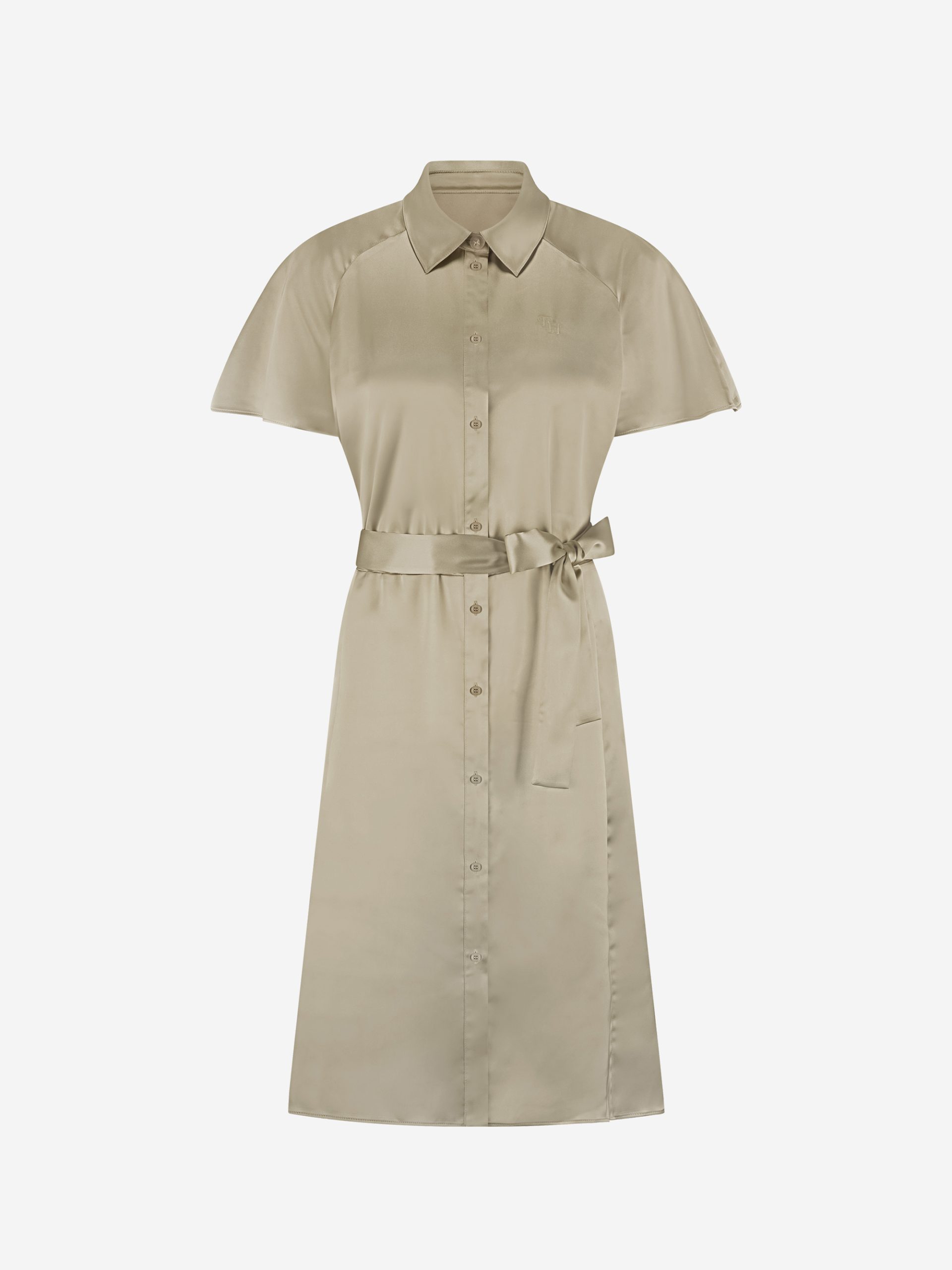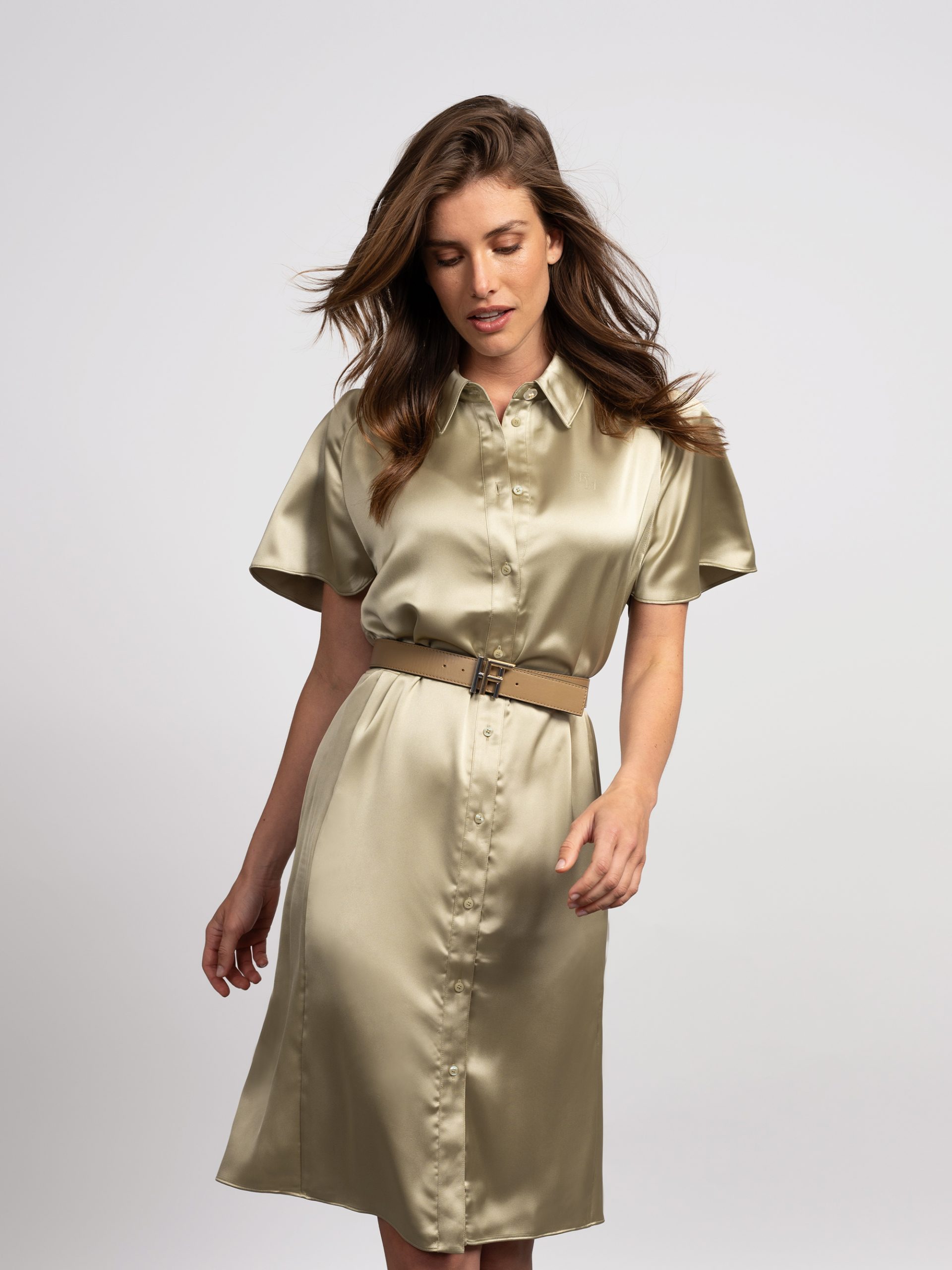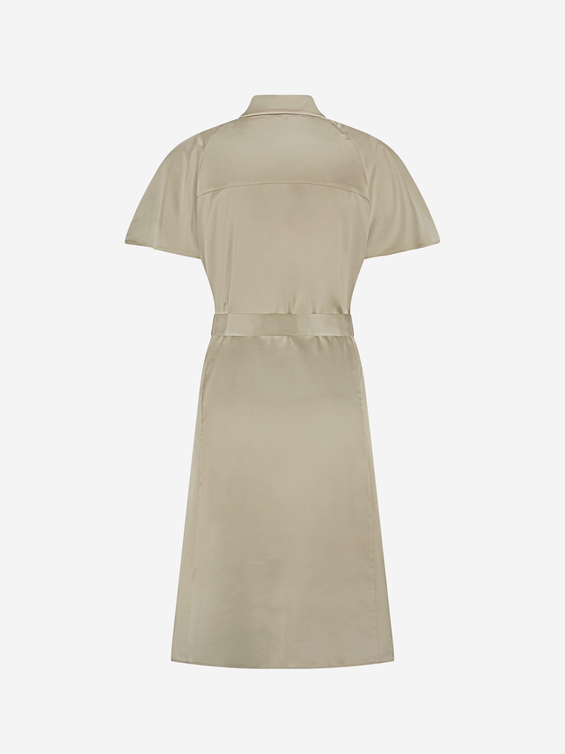 Product descriptionSatin dress with a belt, a collar and butterfly sleeves. The dress has a button closure and a loose fit.