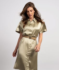Product descriptionSatin dress with a belt, a collar and butterfly sleeves. The dress has a button closure and a loose fit.