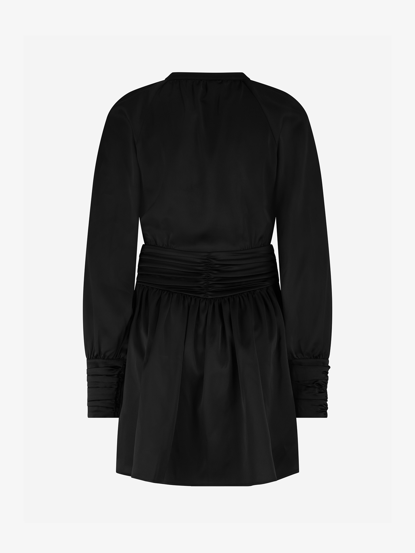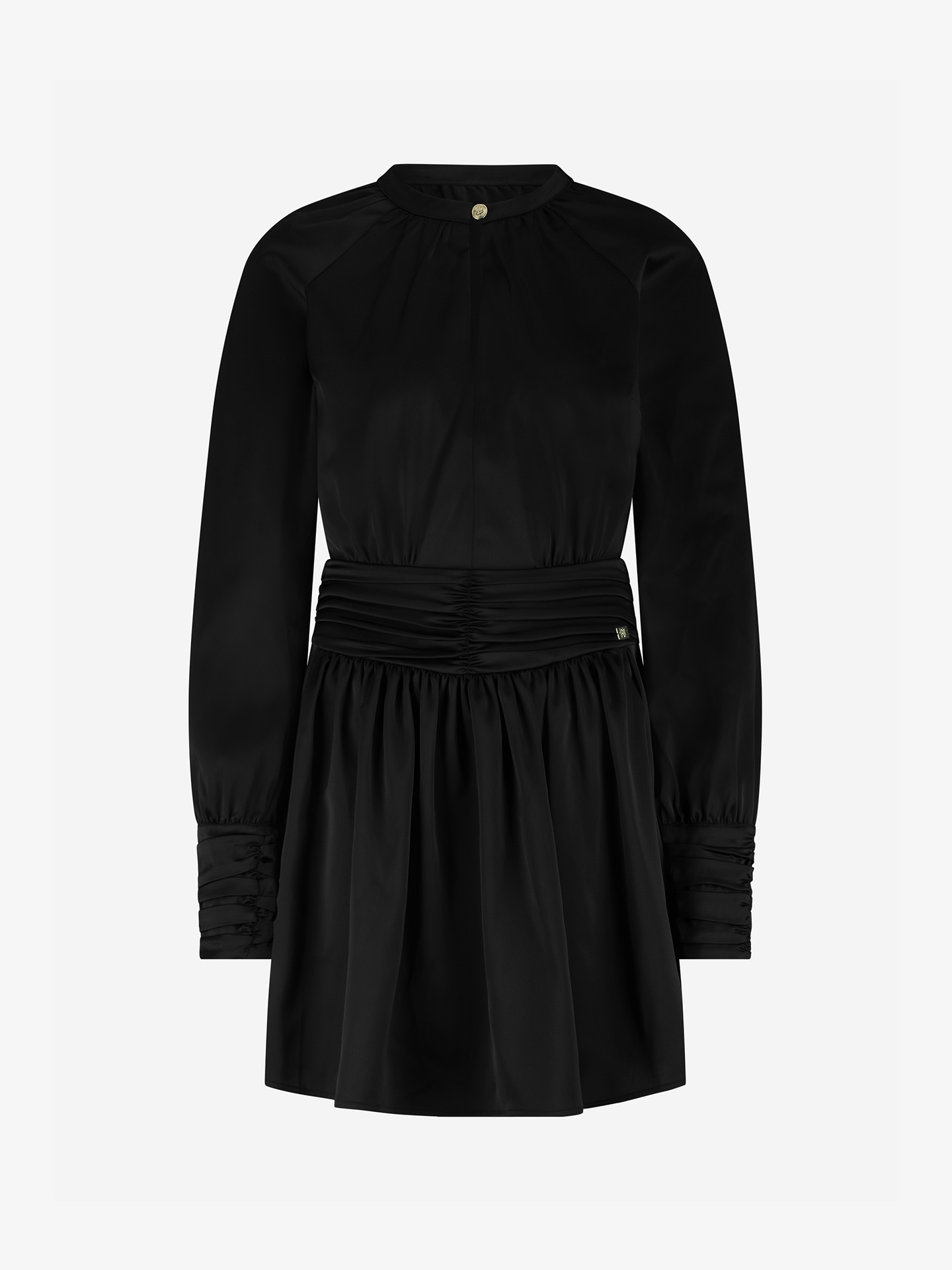 Product descriptionSatin dress with a draped waistband and cuffs, a high round neck with a button detail, and a concealed zipper. The dress features pleats and an A-line fit.