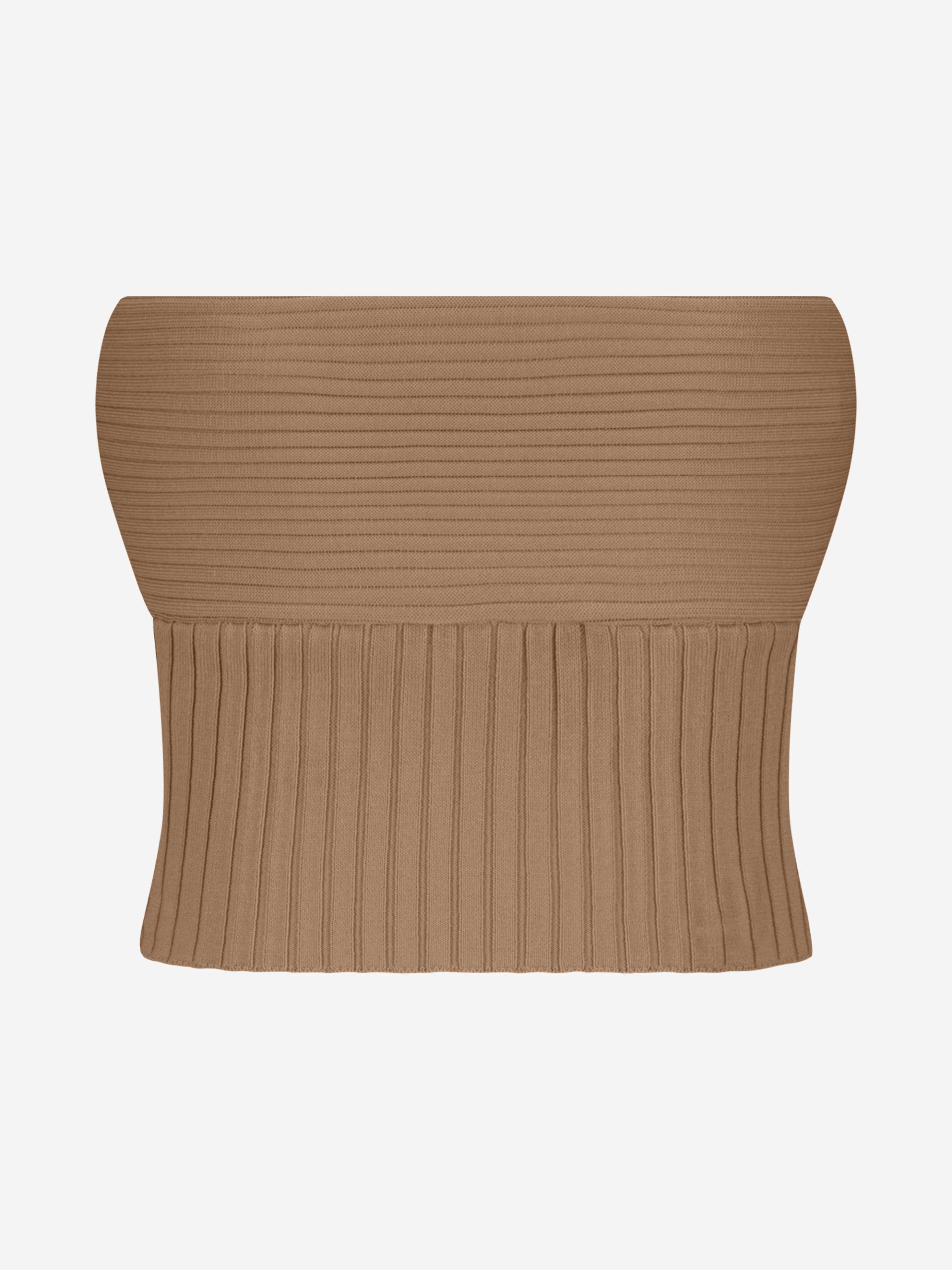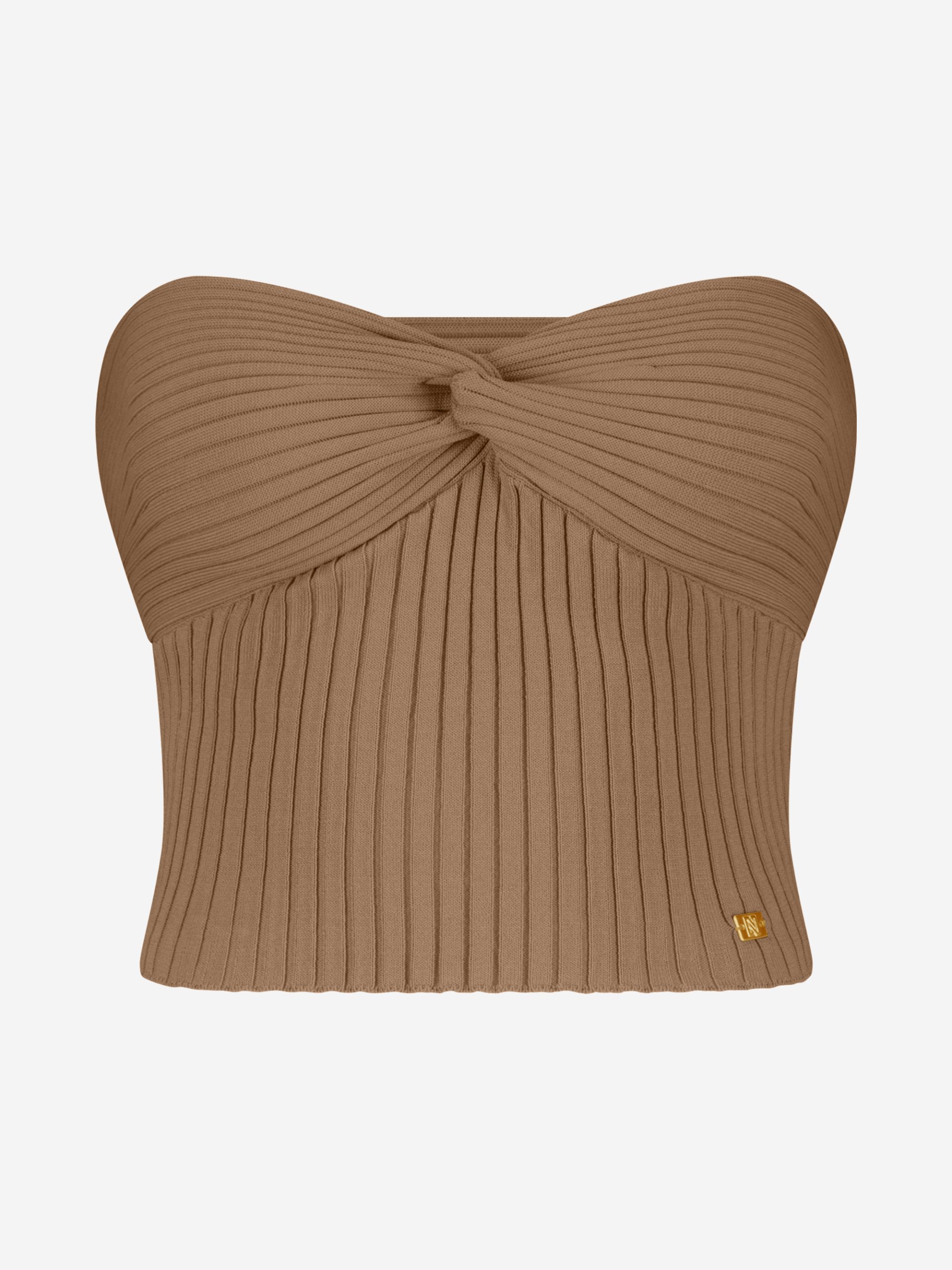 Product descriptionShort bandeau top with a twisted detail at the bust, a tight fit and a ribbed fabric.