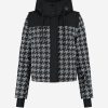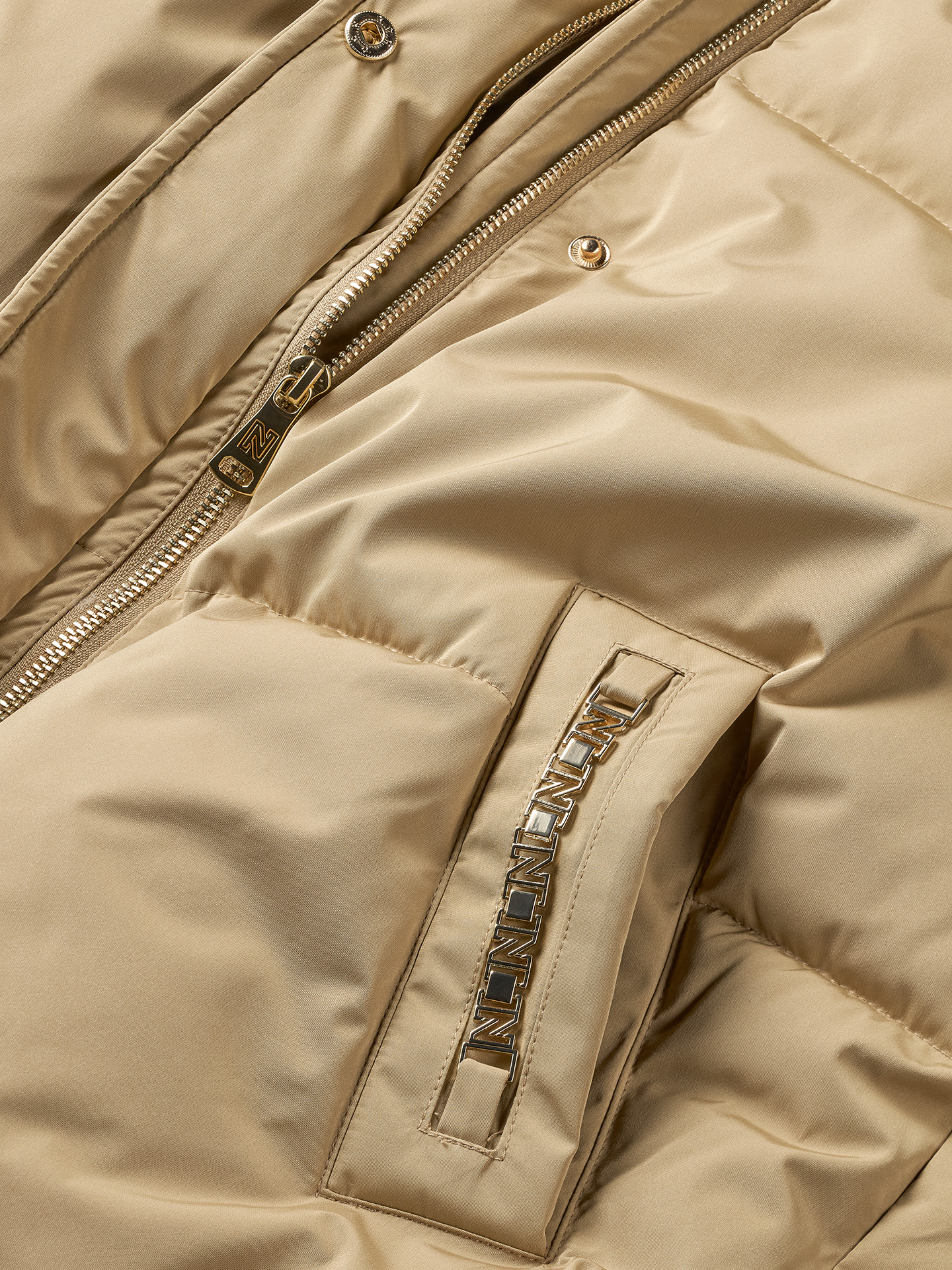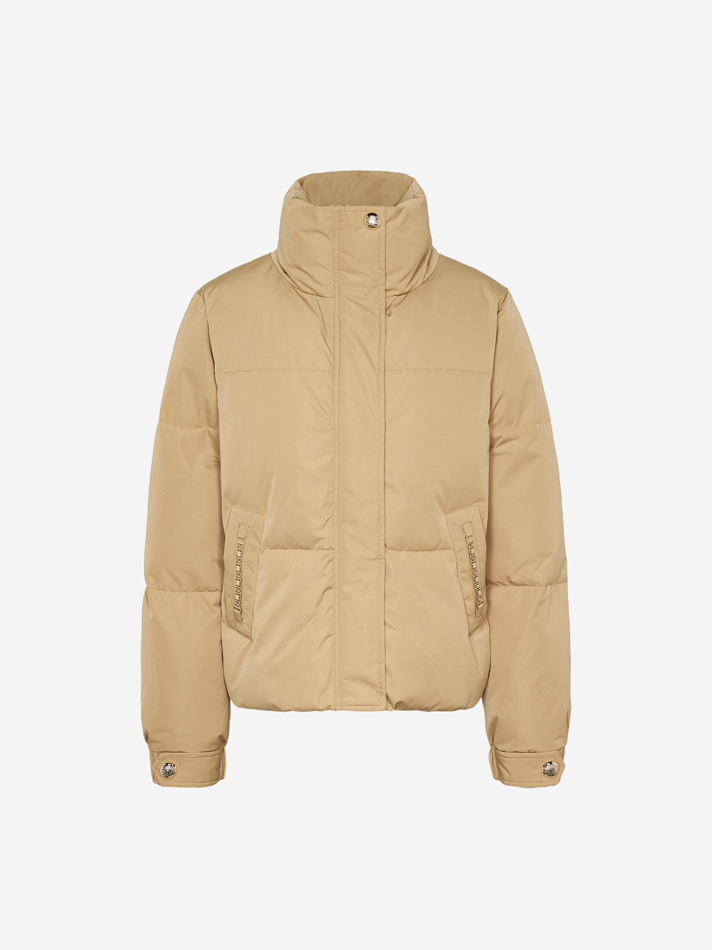 Product descriptionShort puffer jacket with a high stand-up collar, a zip and snap closure, and pockets with a chain detail.