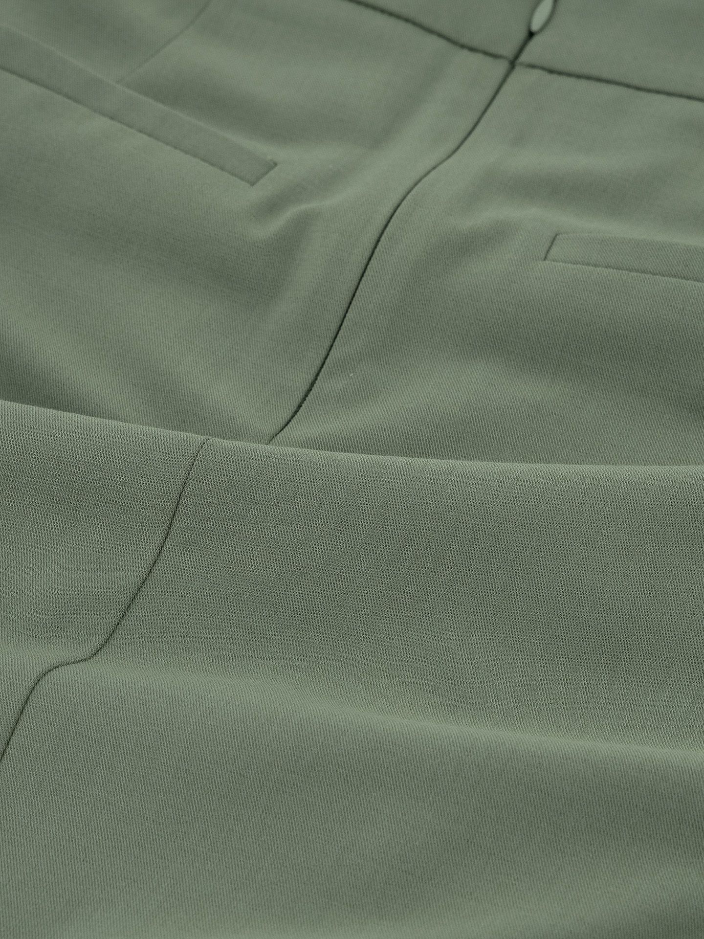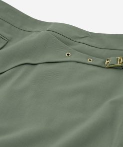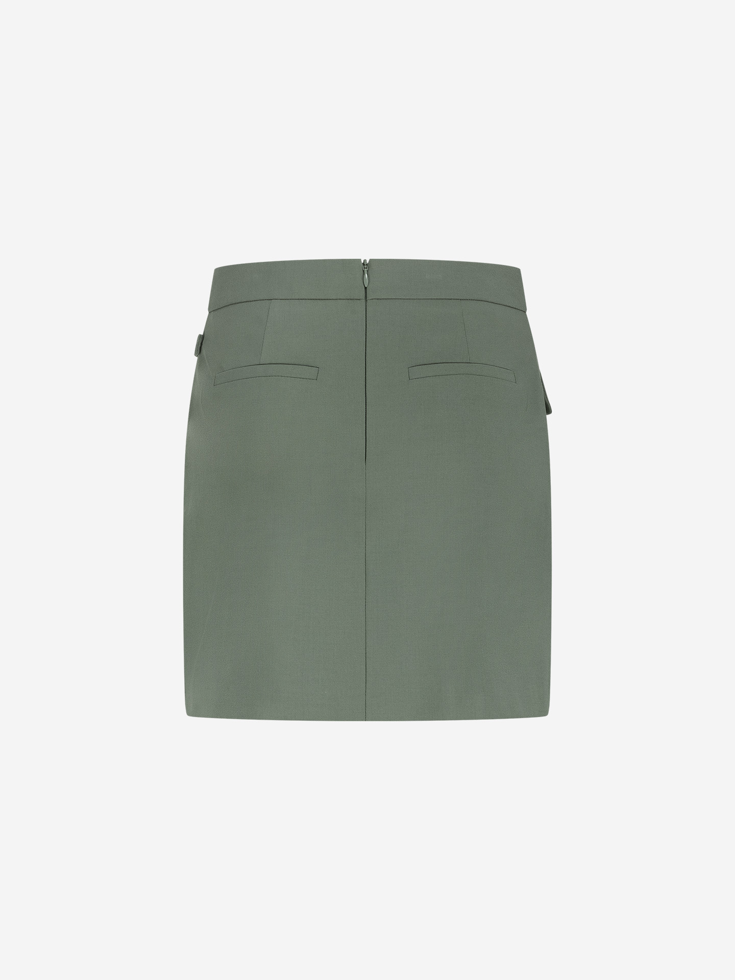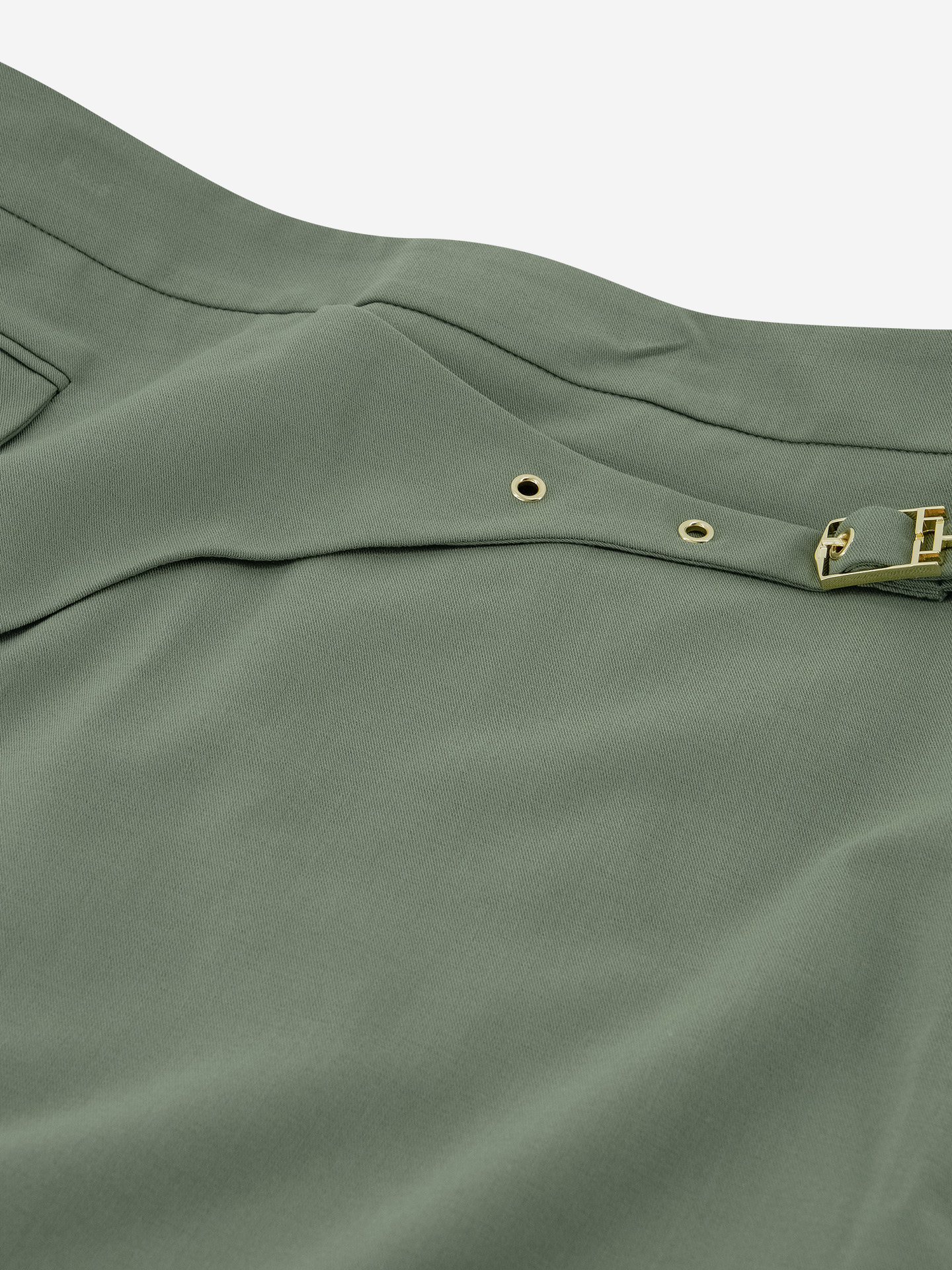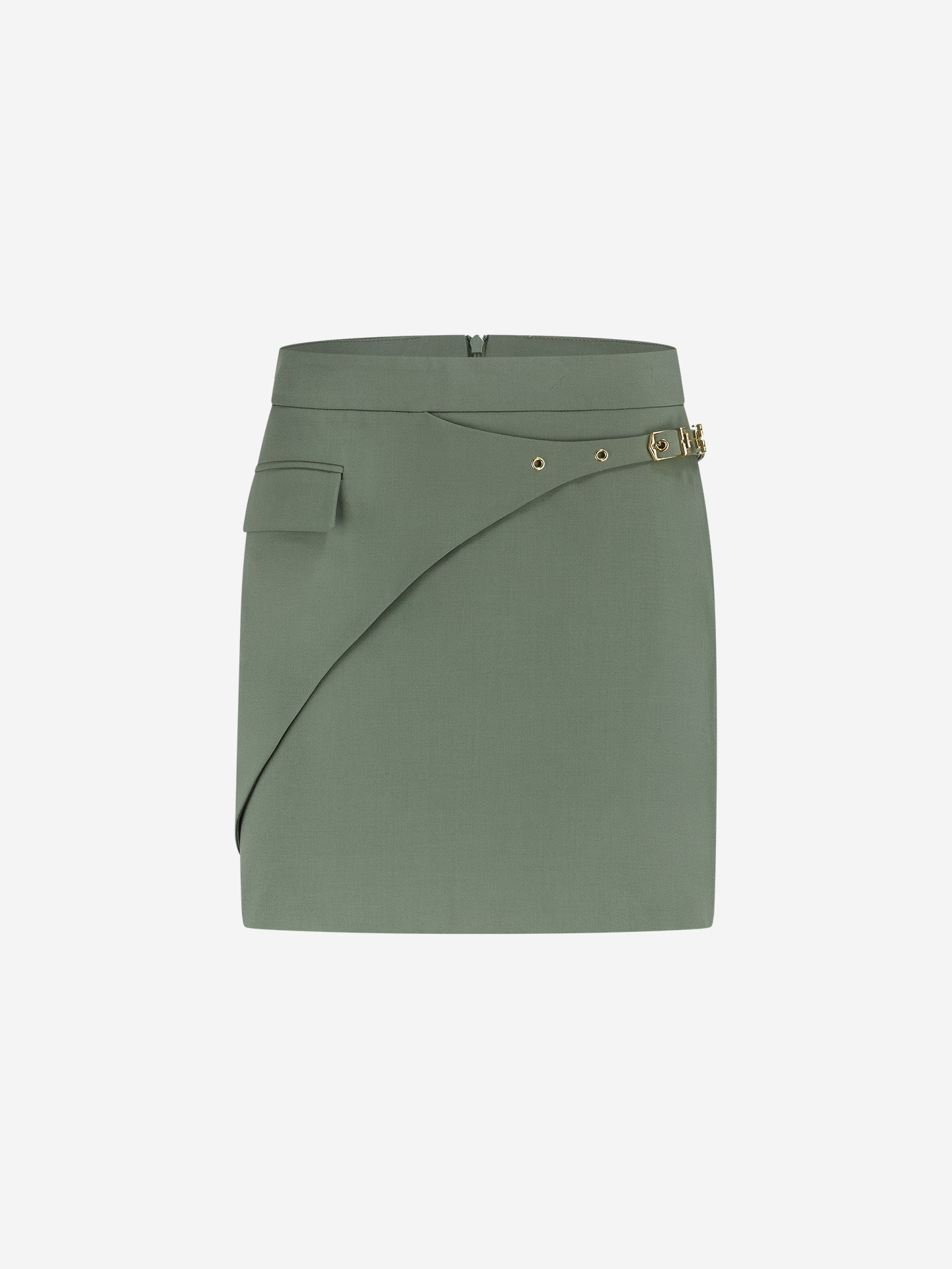 Product descriptionFitted skirt with an asymmetrical wrap front, a mid-rise waist, and a decorative belt with a buckle. The skirt closes with a zipper.