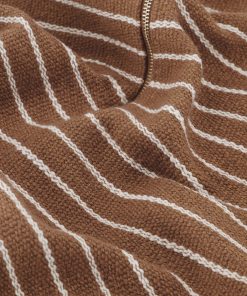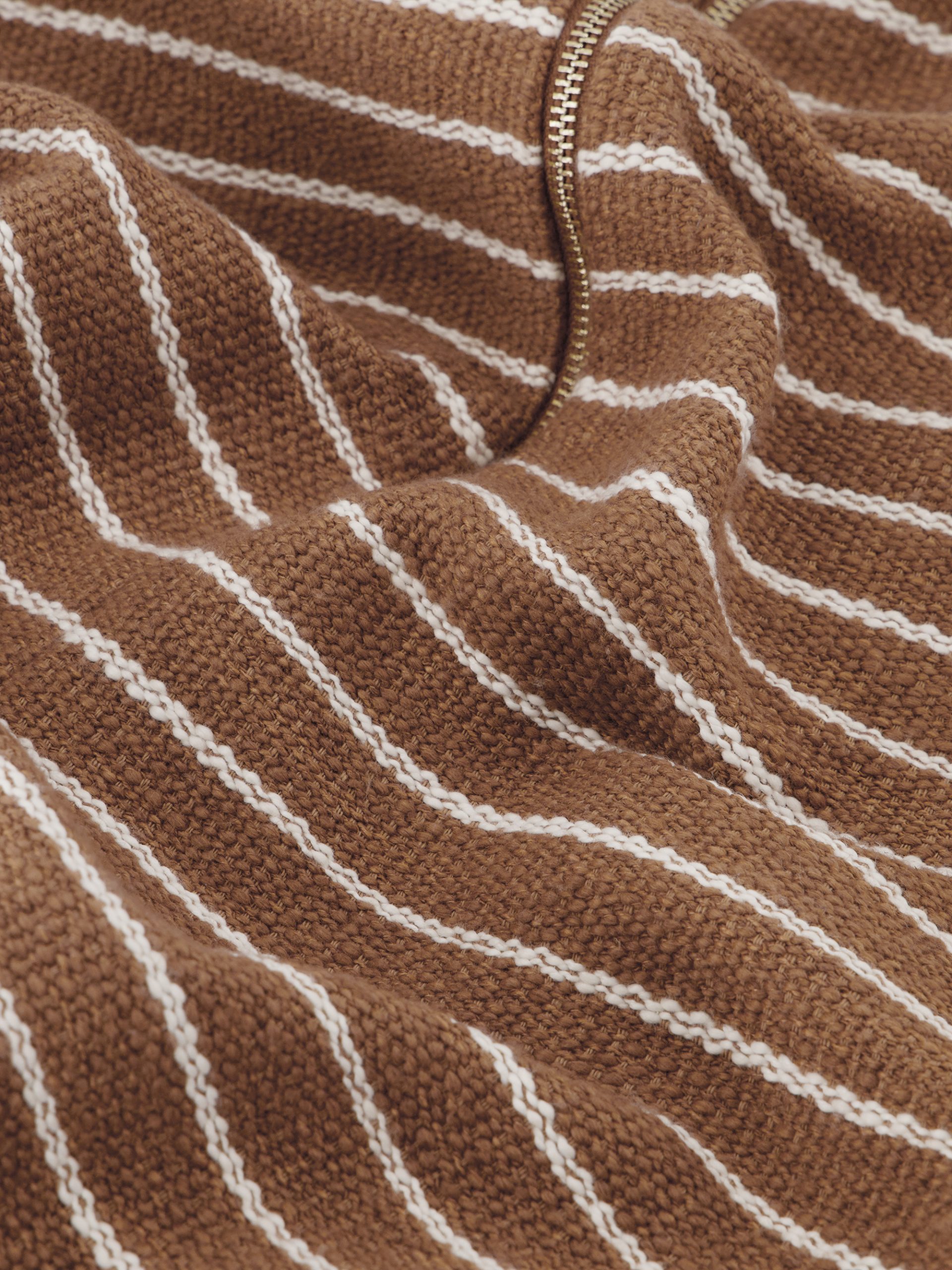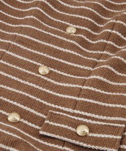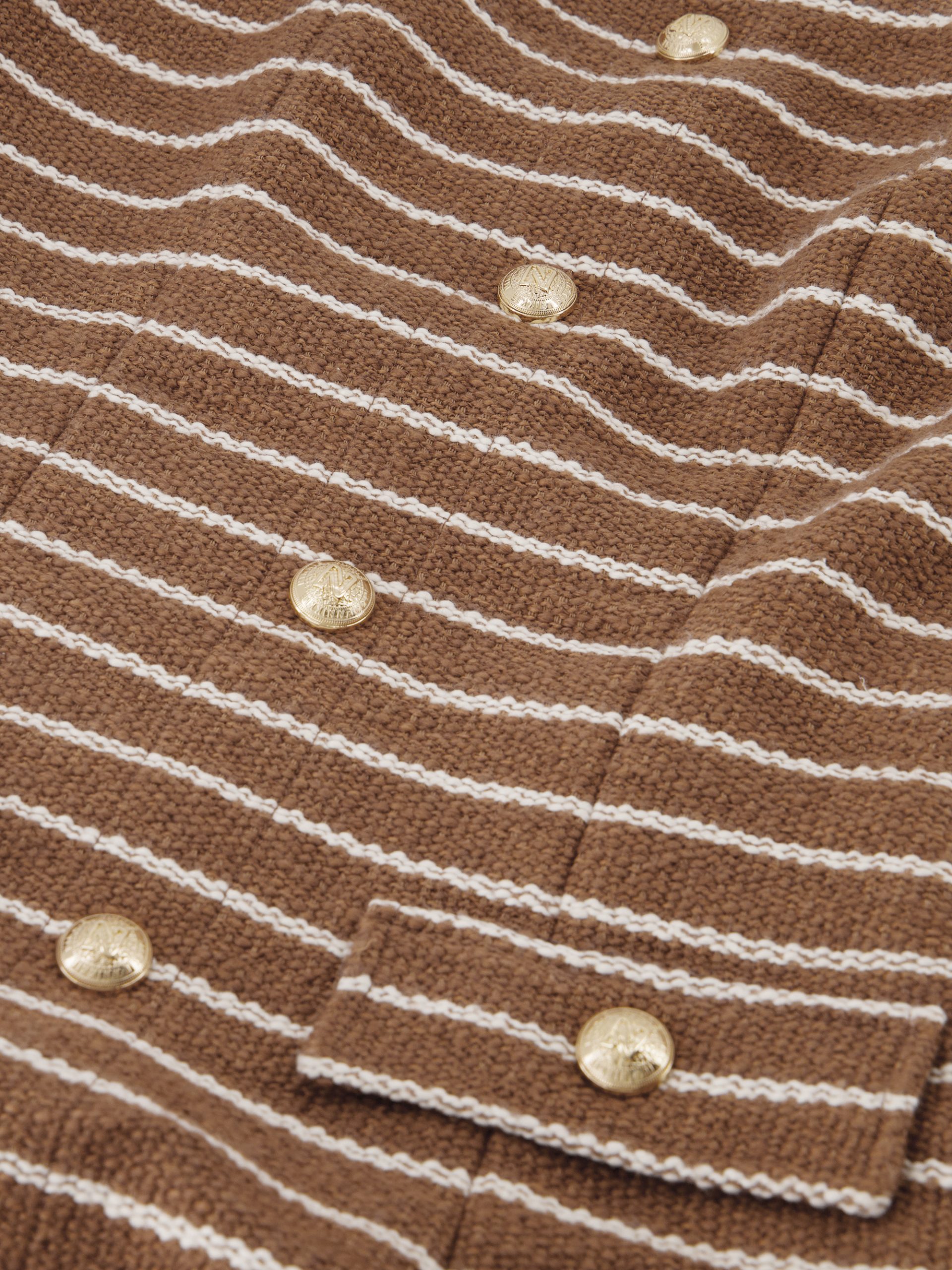 Fitted woven dress with a striped pattern and decorative buttons. The dress is strapless and has no stretch.