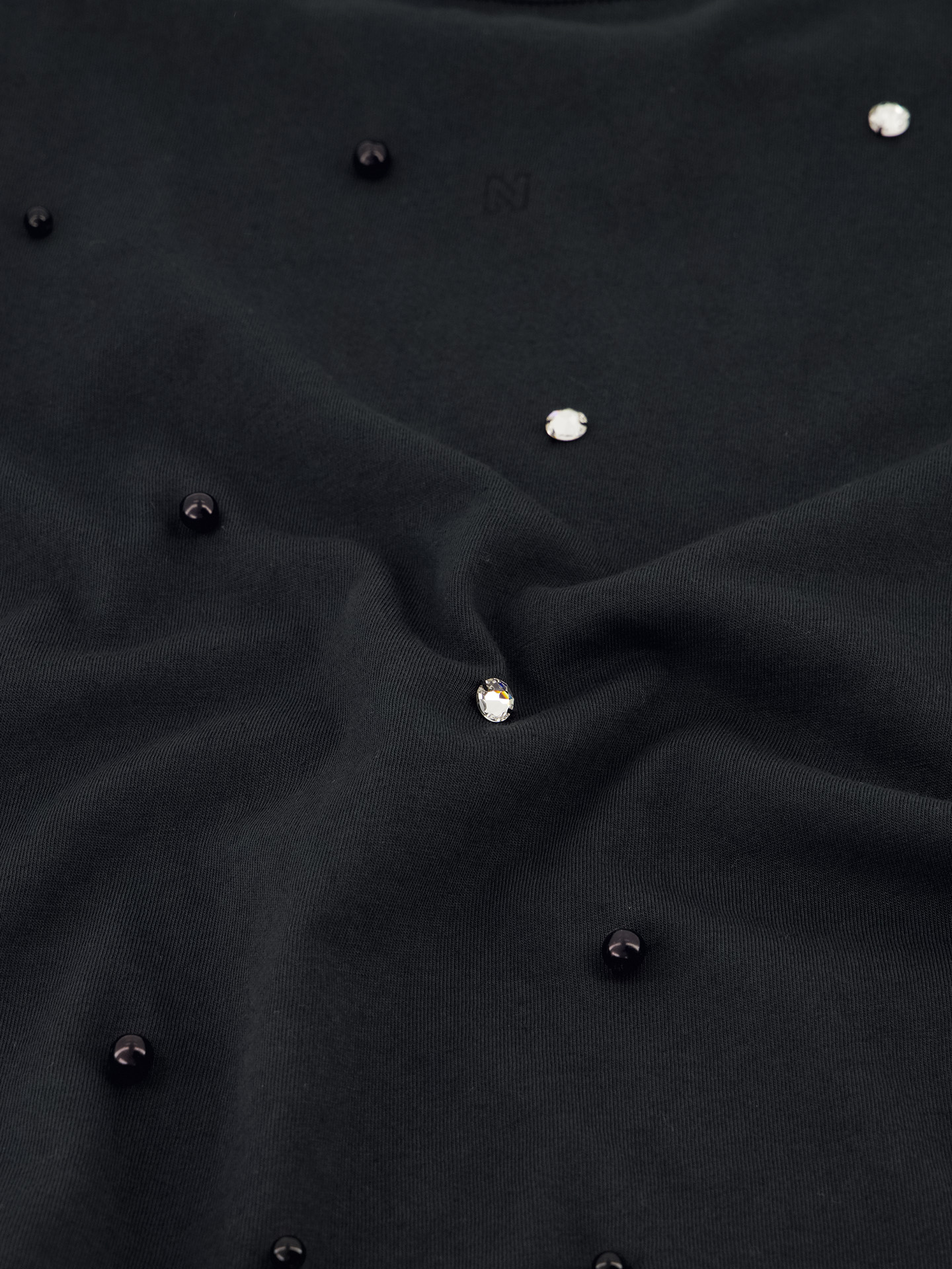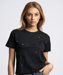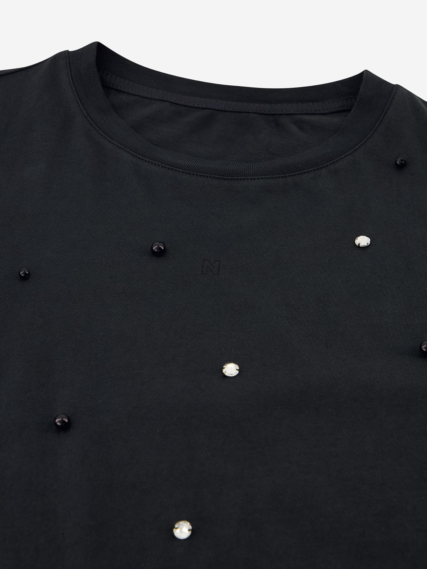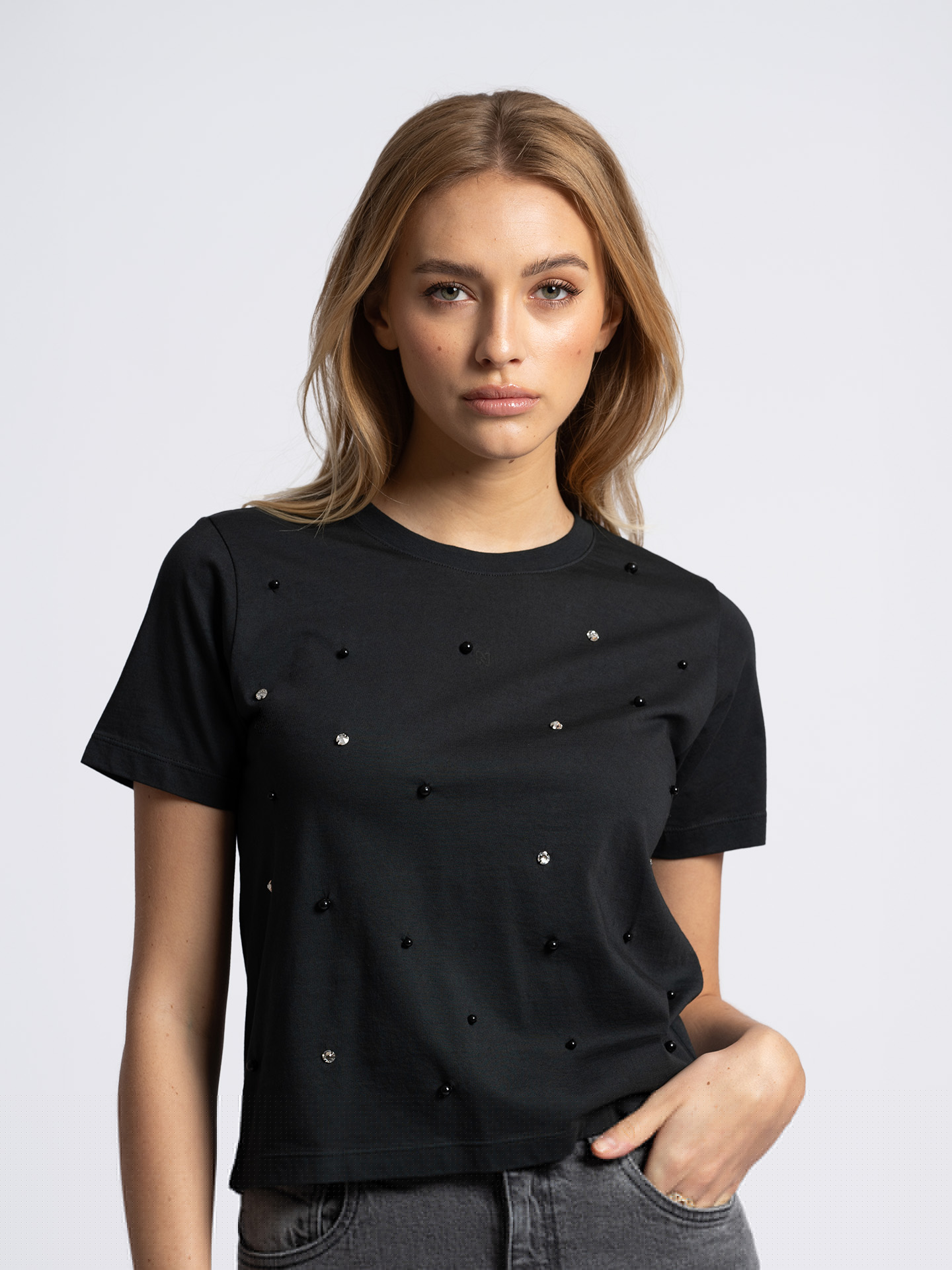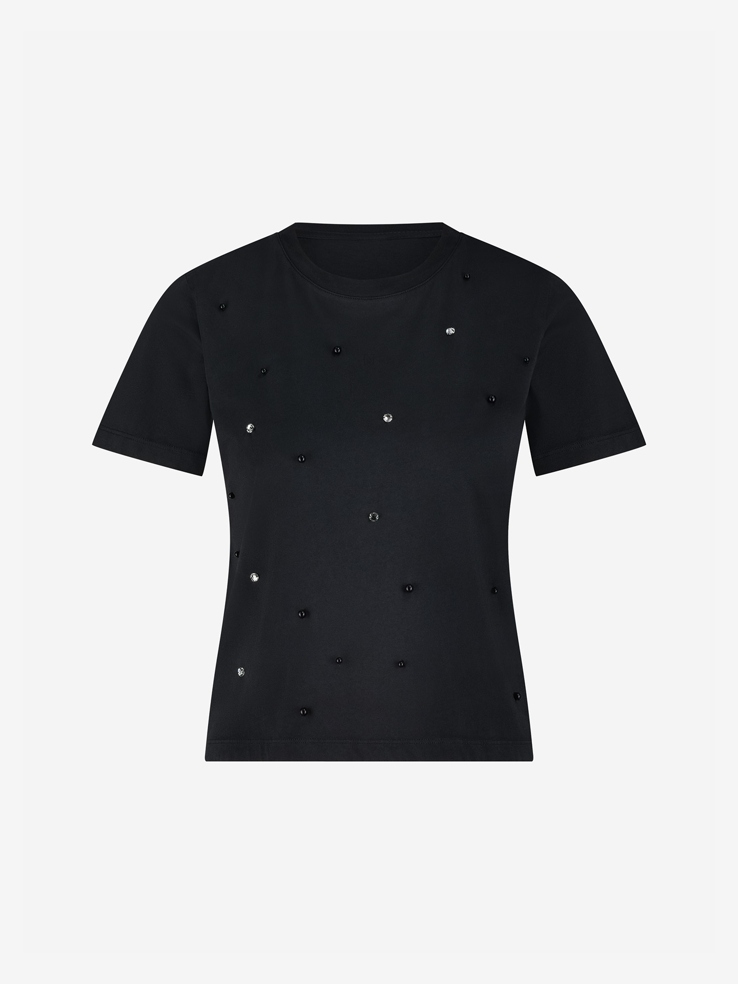 Product descriptionCrew neck T-shirt with decorative pearls and studs, and a subtle logo.