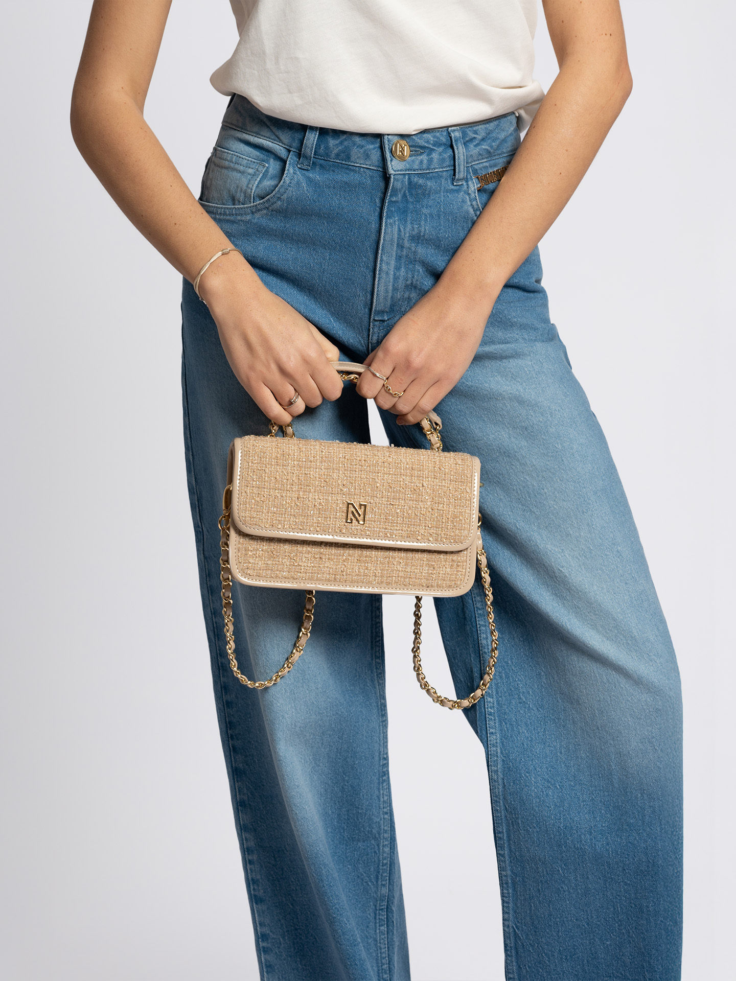 Product descriptionTweed shoulder bag with an adjustable chain strap, flap-over closure with magnetic snaps, and an N logo.